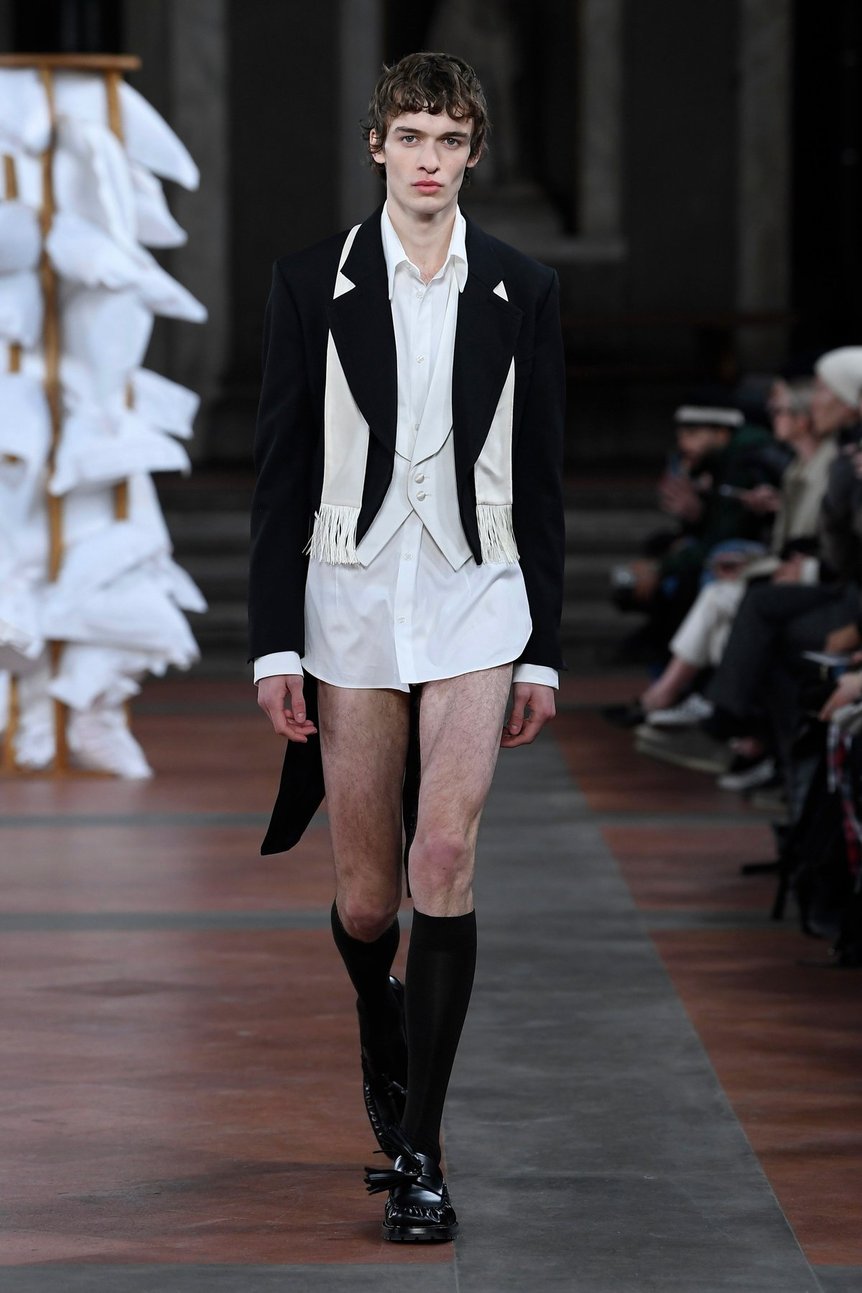 2024年秋冬コレクションは、デイリーにとって馴染み深いイギリスの寄宿学校がインスピレーション源。寮というオンとオフの両面が共存する共同空間の場にある、形式(アカデミック)と親密さ(脱衣)という異なる観念が重なり合っている感性を軸にしており、アカデミズムらしい黒と白のフォーマルスーツには放蕩さを表すためにシャンパンのアクセントが散りばめられ、Pコートにはベッドマットレスのようなステッチを施し、オックスフォードの燕尾服をズボンなしで着こなすなどで表現している。アーカイヴを元に、生地やディテールをアップデートして仕立てるという手法はファッションの世界では当たり前として機能しているが、エス・エス・デイリーがこのアプローチを採用するのは、「親密さ=現代性」と捉えているためだろう。