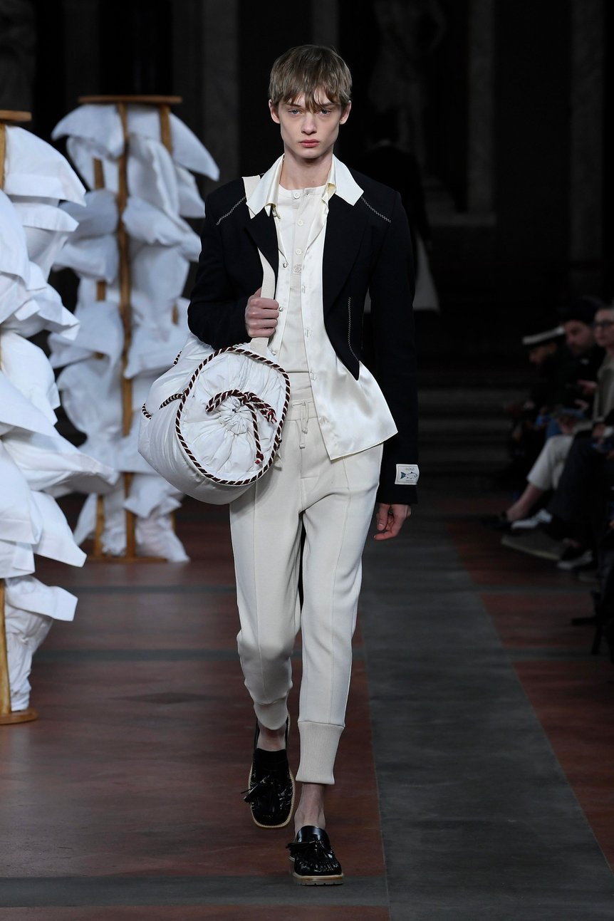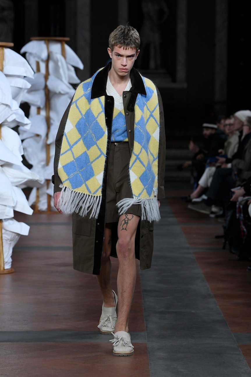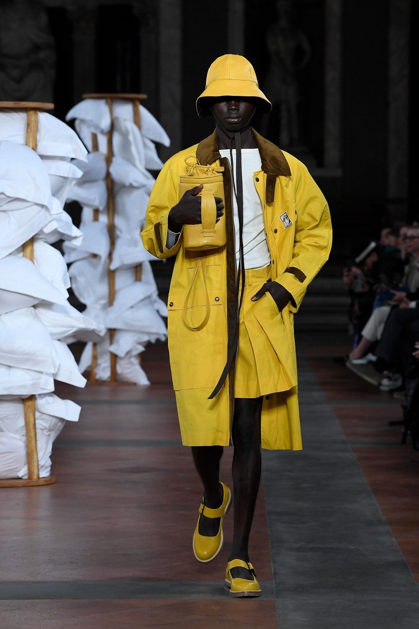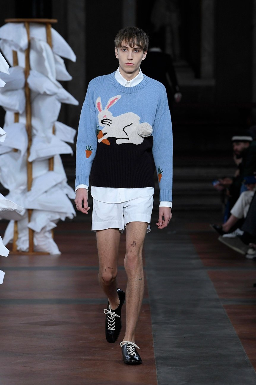 また、EM・フォースター(E. M. Forster)が1911年に発表した「The Story of a Panic」から、イギリス人旅行者仲間とのイタリア旅行のストーリーも引用。魚の絵が描かれたナイトシャツと襟がスエードの黄色いフィッシングコートの組み合わせなど、より軽く、より爽やかなファッションを提案した。インターシャによる柄の入ったニットはデイリー自身のキュートなアイデンティティが反映されており、ブランドとして初めてシューズを製作。エス・エス・デイリーのシグネチャーと言えるうさぎのモチーフは今シーズンも健在だ。