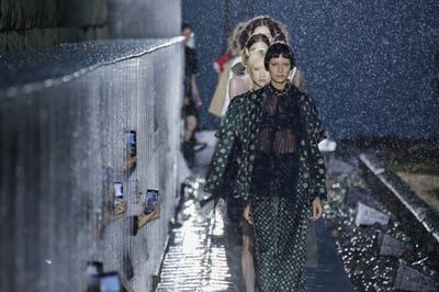 都内から車でおよそ1時間半。小田原の海辺に位置する江之浦測候所は、現代美術作家の杉本博司が20年を費やして完成させたという壮大なランドスケープである。木々が生茂る坂道を抜け、石畳を歩くと光学硝子舞台があり、相模湾を臨む絶景が広がっている。ショー当日は雨模様だったが、200人あまりの招待客はアクリル板で仕切られたボックスに収まり、雨粒を背景にショーを観覧した。