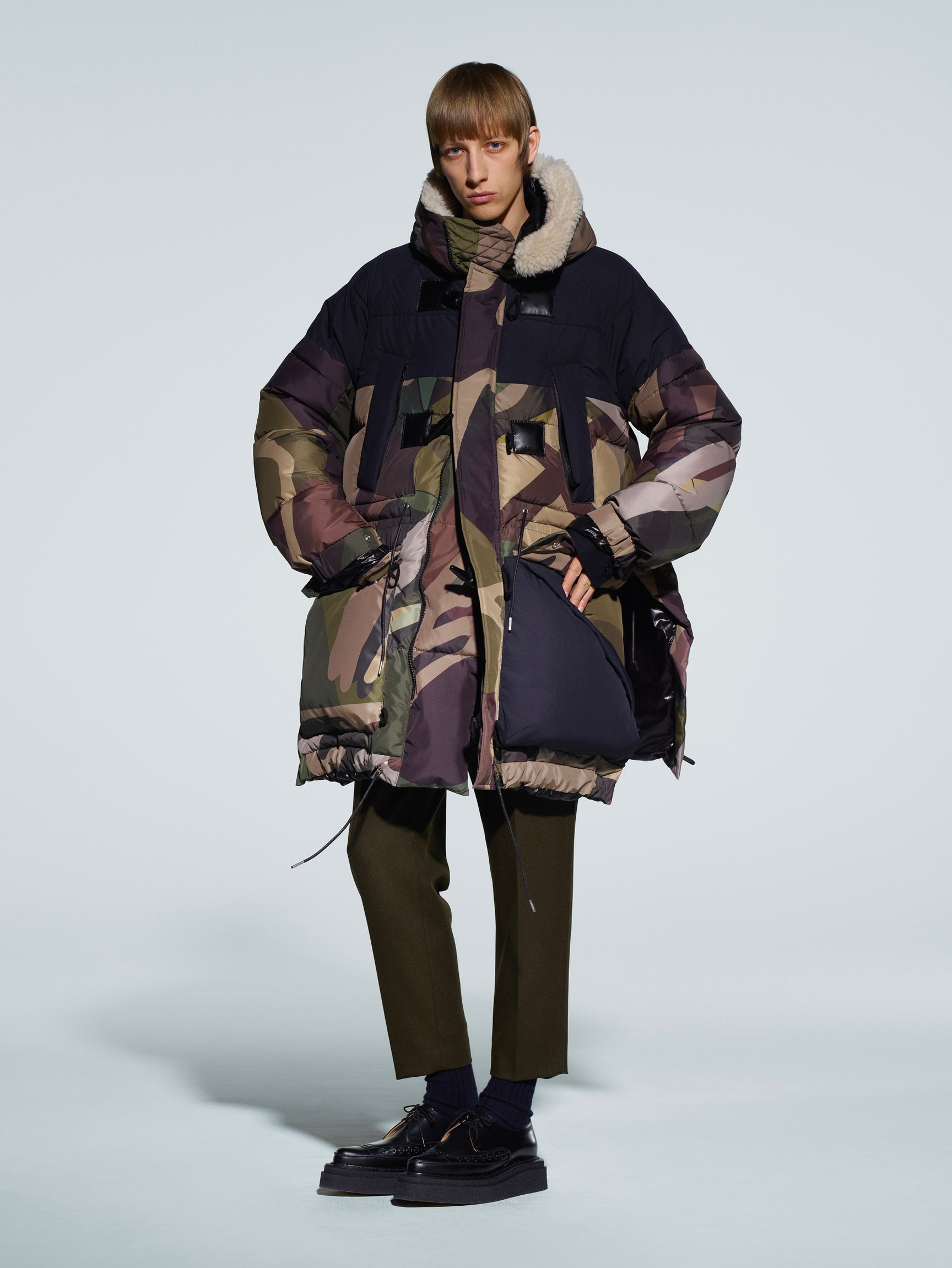 ベースとなるのはスーチングやライダース、MA-1、ダウンジャケットといったクラシックな装いだが、サカイならではのドッキング技術をはじめ、インサイドアウトの手法や、付け替えられる機能的なポケットなど、ハイブリッドなひねりを加えて進化させた。カーキやオリーブ、ネイビーといったベーシックカラーに、マスタードやオレンジの差し色が映える。