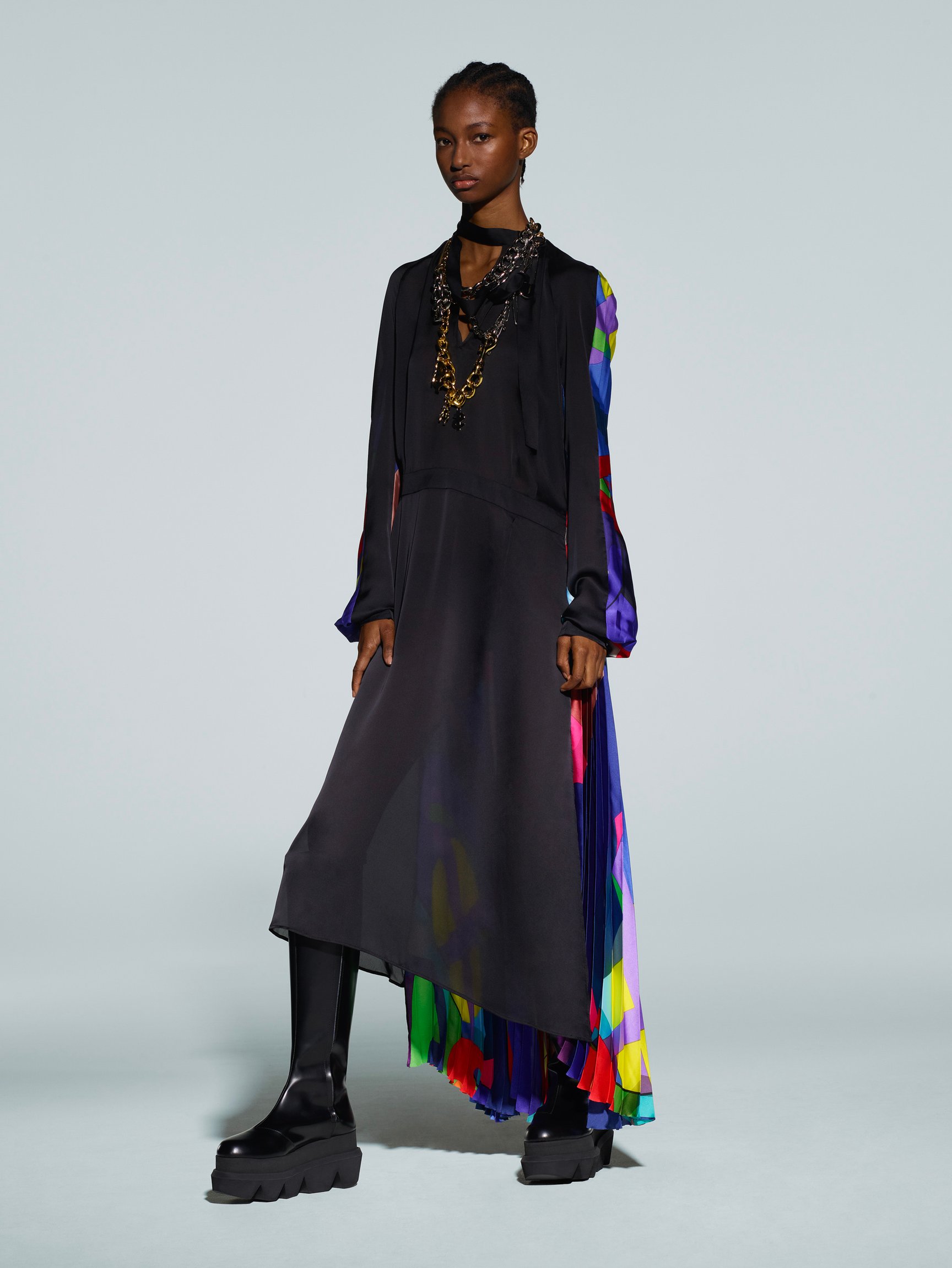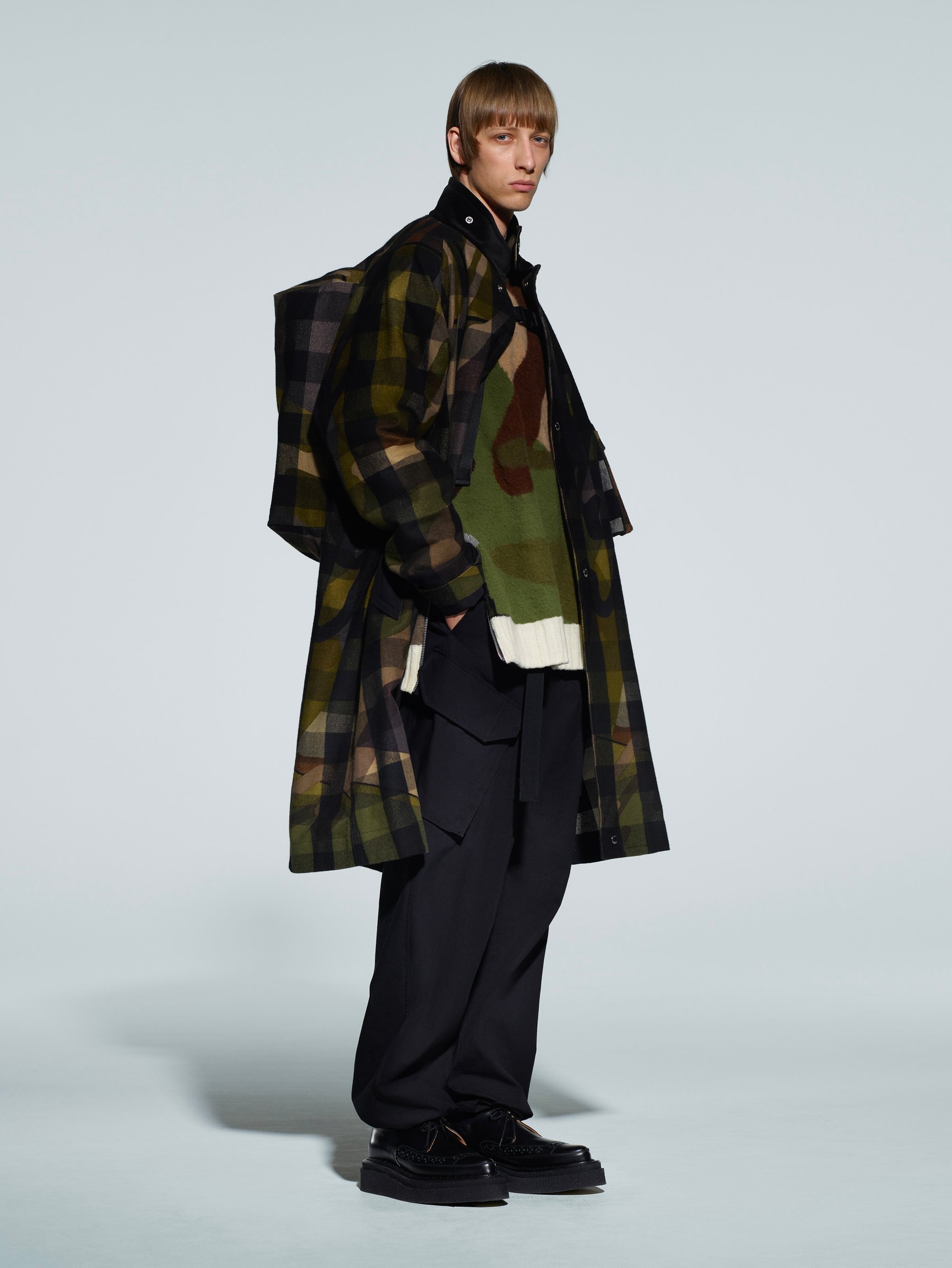 クロップド丈のテーパードパンツに「ジョージコックス(GEORGE COX)」とのコラボレーションによる厚底シューズを合わせたメンズスタイルは、現代のテディボーイのよう。ウィメンズではツイードをプリント柄で表現するなど、ユニークなデザインも。大振りのチェーンネックレスには、サカイの「S」を「$(ドル)」に変えたモチーフやセーフティーピンをデザインし、アクセサリーにもパンクやヒップホップの要素を融合している。