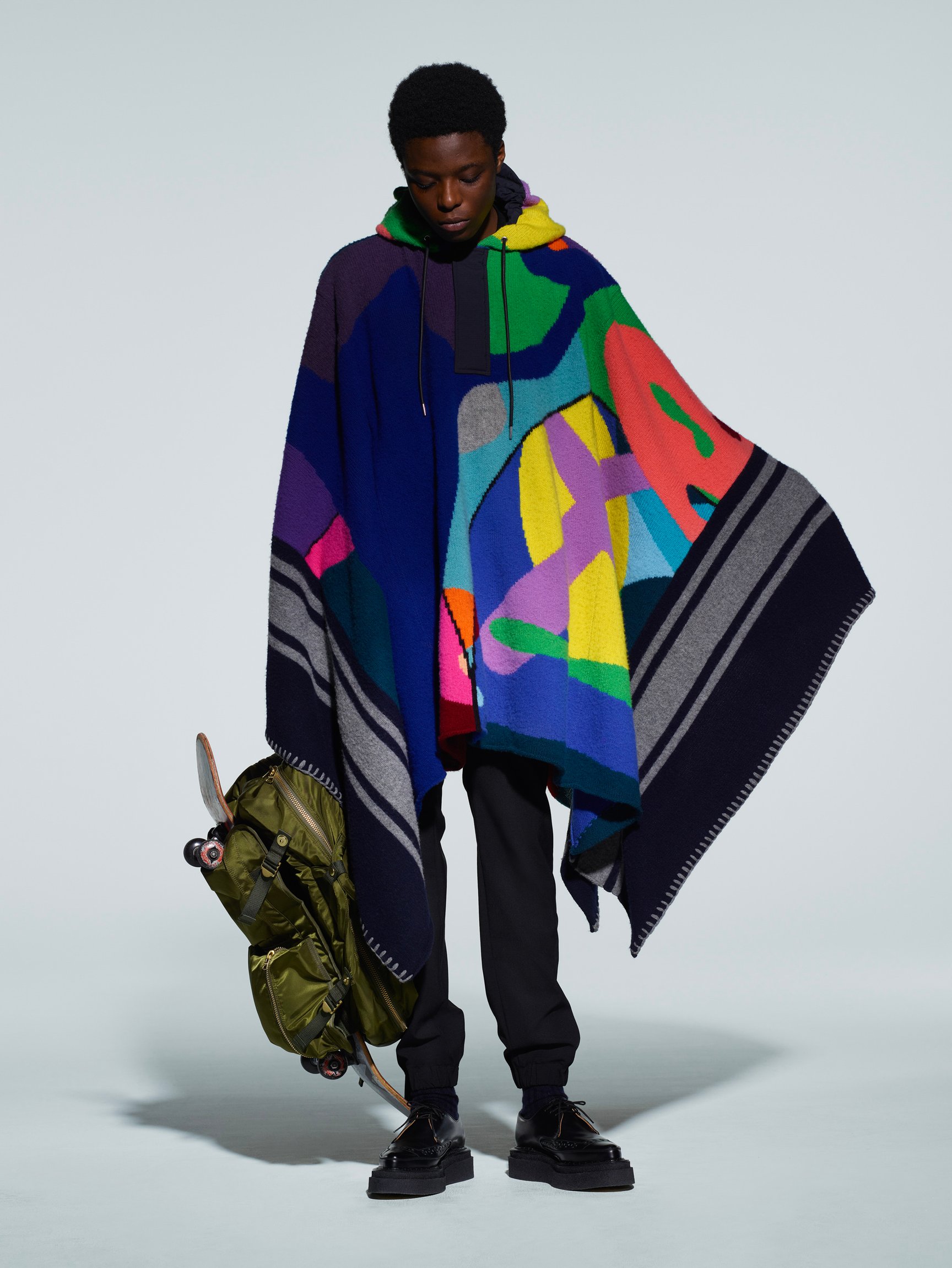 カウズとコラボレーションしたプロジェクトは、イヴ・サンローランとピート・モンドリアンの出逢いに触発された「ウェアラブルアート」という概念を、21世紀的に表現したという。ファインアート3作品を、ウェア、ブランケット、バッグ、キャップなどの落とし込んだ。