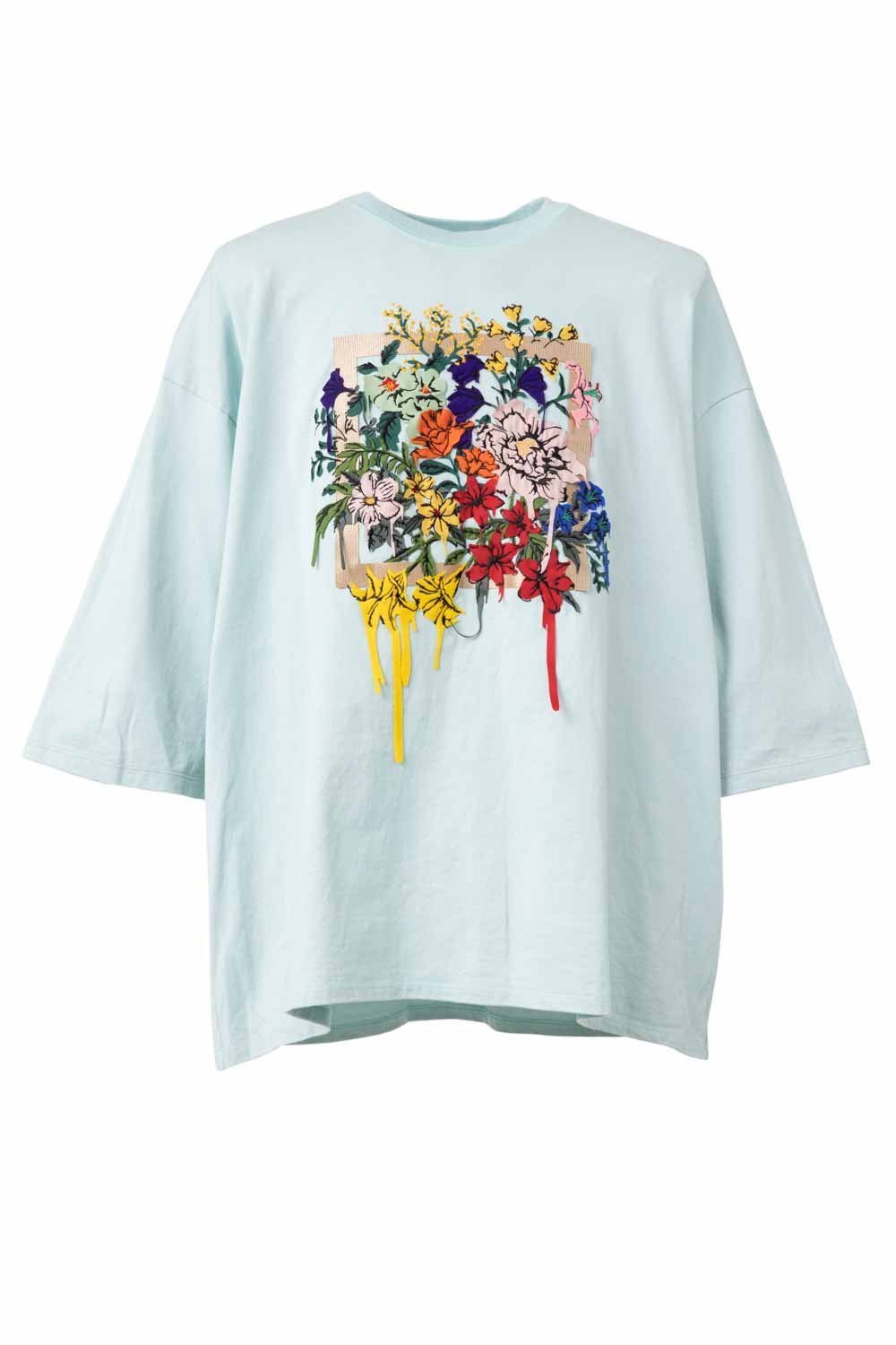 大嶋:立体刺繍はアモクの定番技法として、数シーズン前から使っていて、今回は花の刺繍にしました。花はアネモネやアイリスという花言葉で「希望」を意味するものを選んでいて、その花たちが四角の枠の中からはみ出して"規格外"になって未来に向かっていければ、という想いを込めています。