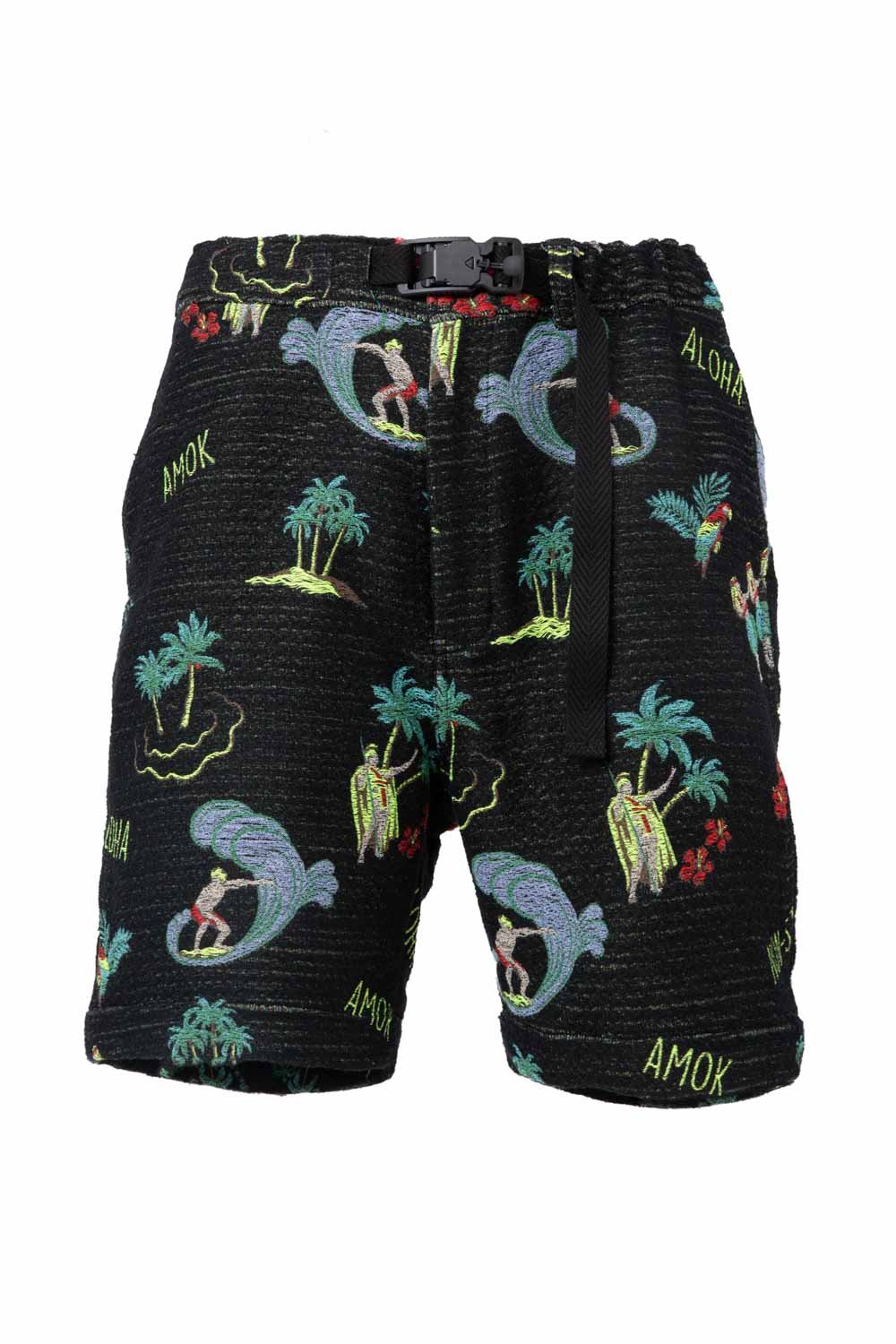 F:ジャカードのアロハシャツとショートパンツ。重量感があって、一般的なレーヨンのアロハシャツと比べるとこれもまさに”規格外”なアイテムですね。