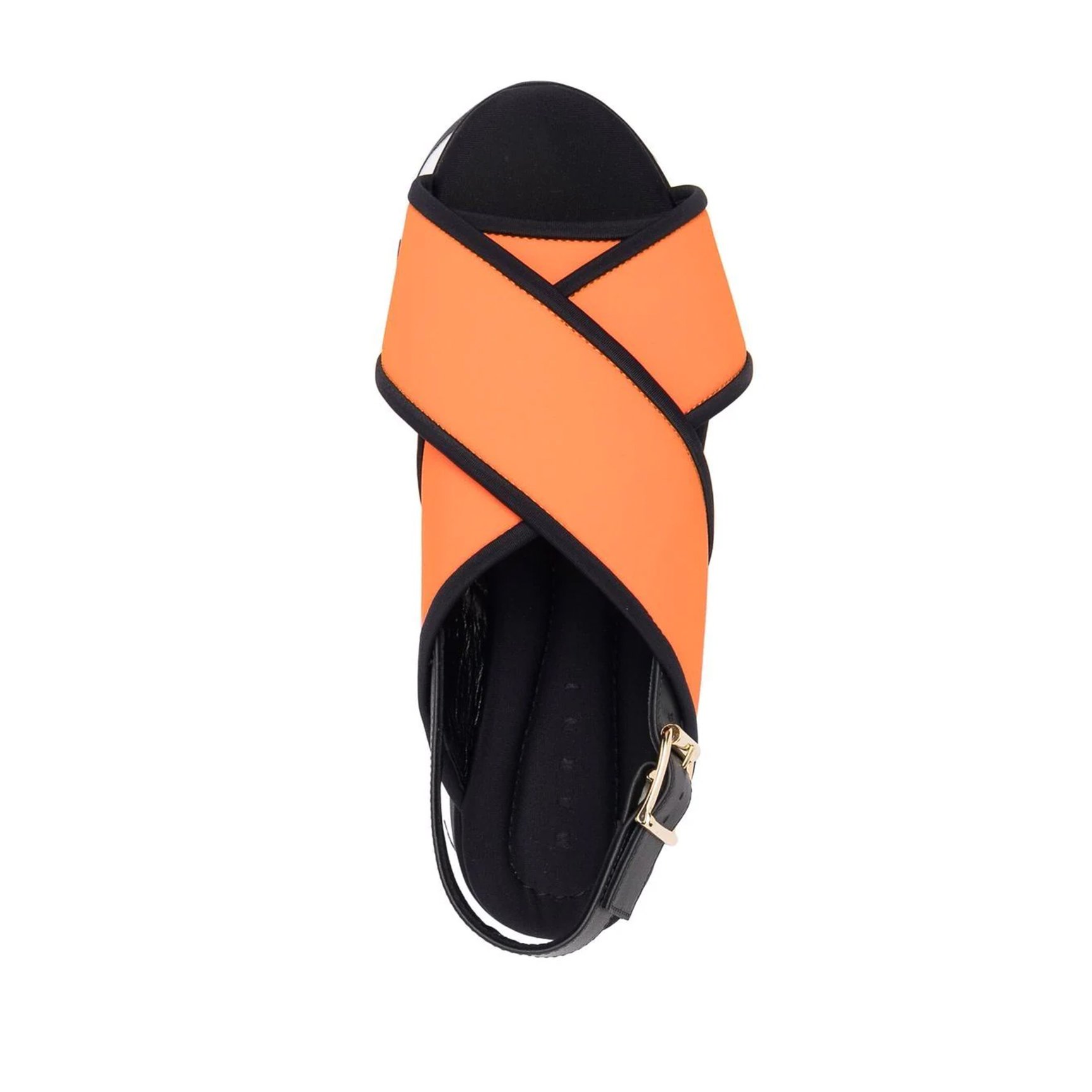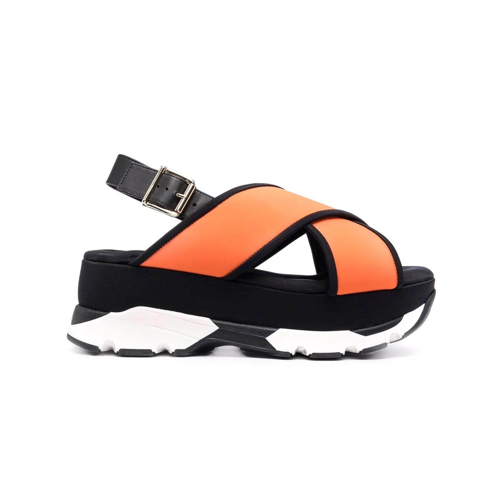 蛍光オレンジのクロスストラップが夏のスタイリングにフレッシュな息吹を与える「マルニ(MARNI)」のサンダル。スポーティなテクニカルファブリック、クッション性のあるインソール、ラバー製アウトソールなど機能性と洒落感を両立した一足。