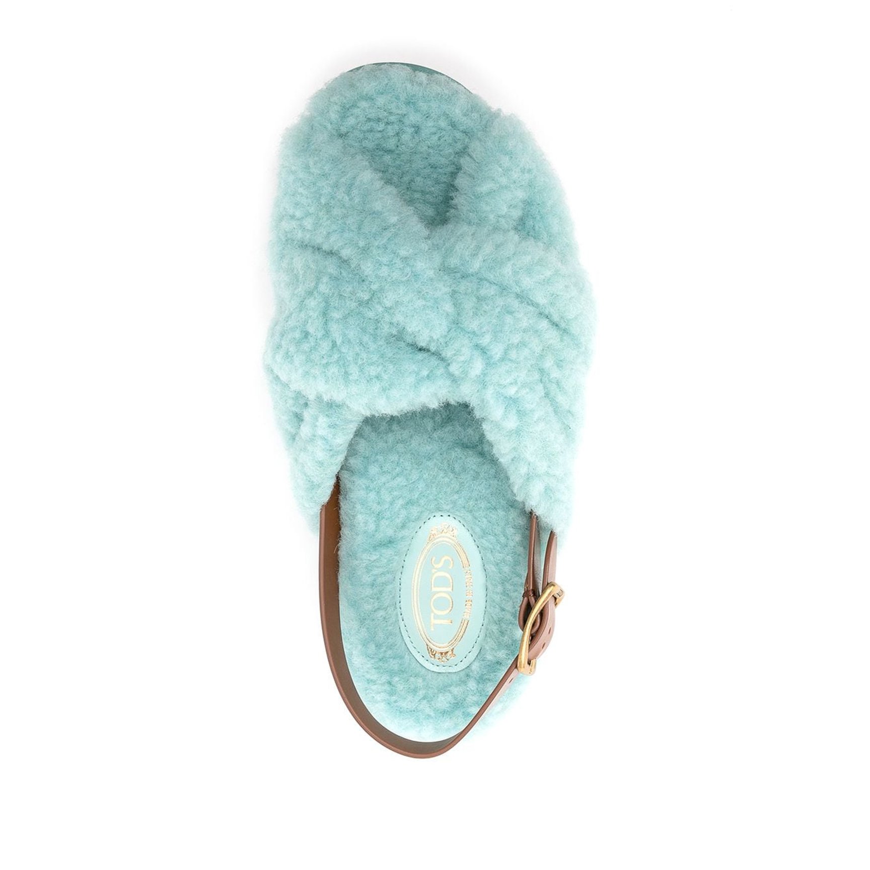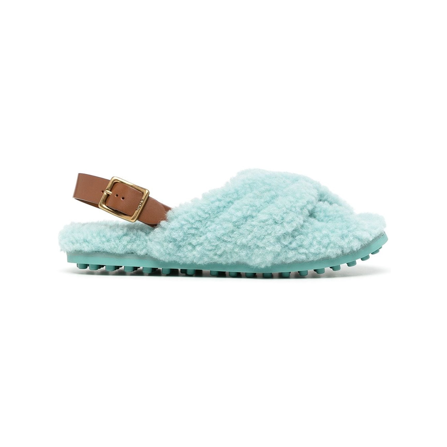 もこもこのボアと、鮮やかなブルーが日常のお洒落を一新させてくれそう。バックストラップにゴールド金具付きのレザーを使用しているので、全体を程よく引き締めてくれる。愛嬌のある足元を叶えて。