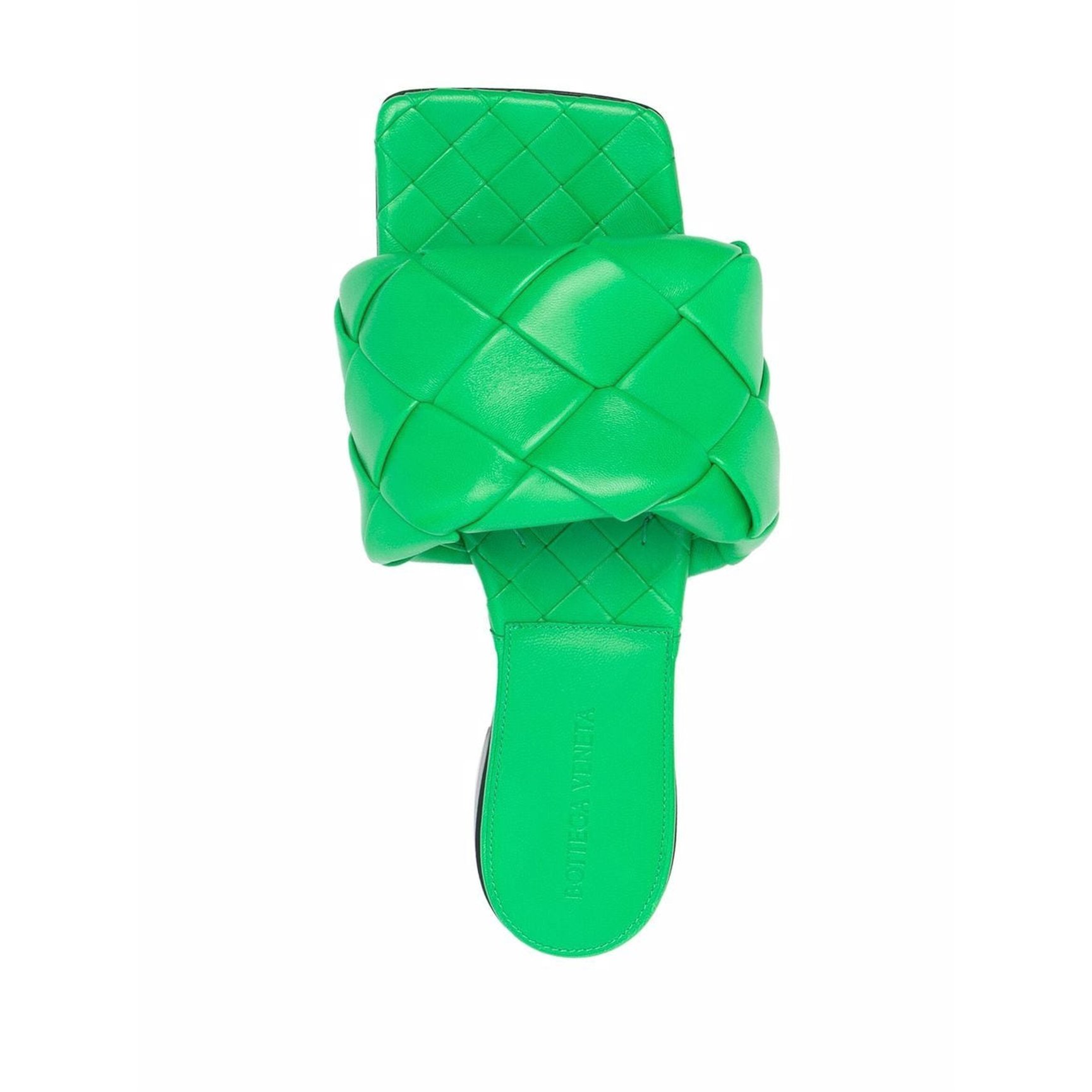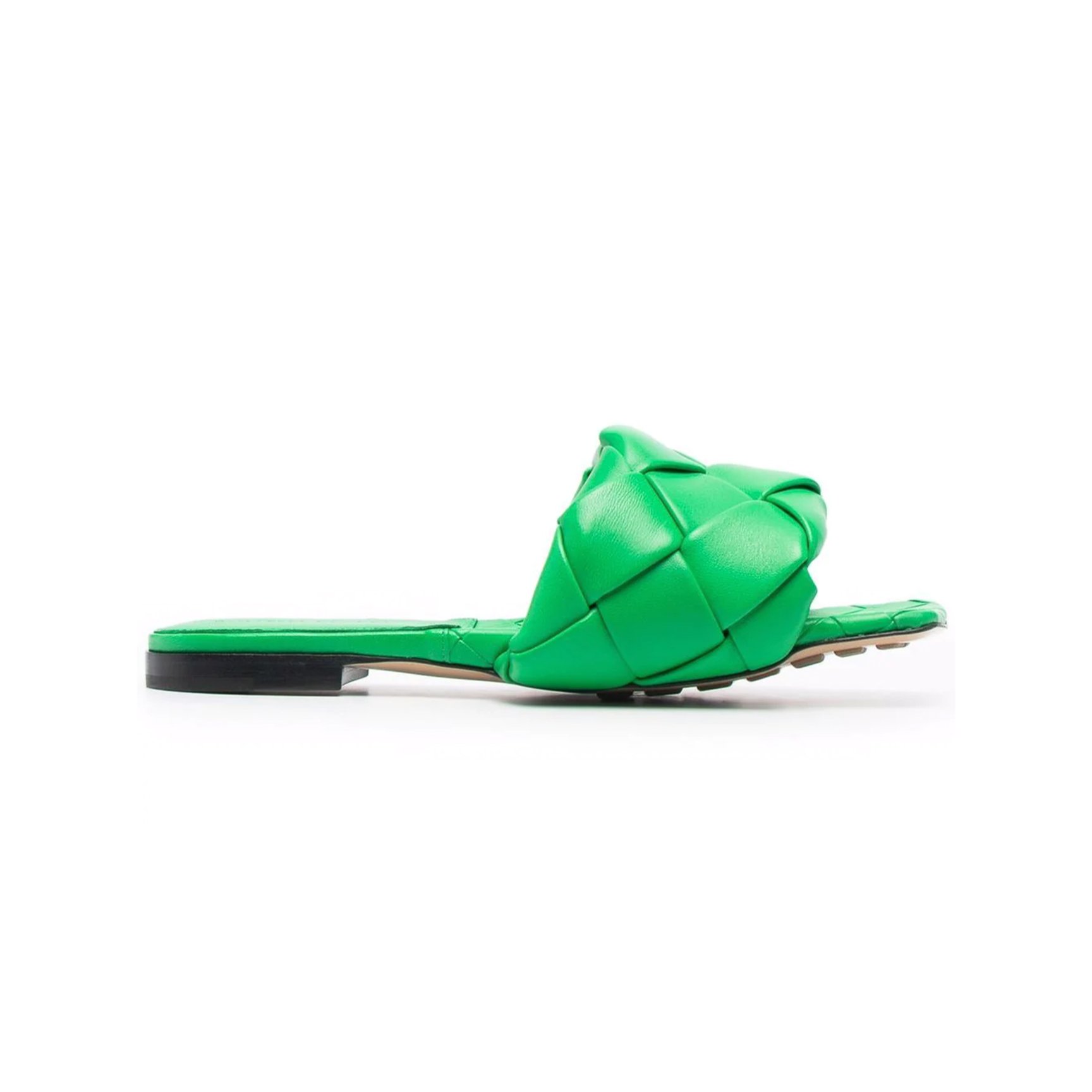 ブランドの代名詞でもある、レザーが丁寧に編み込まれたイントレチャートのフラットサンダル。その品格と気取らない美しさは一度手にするとトリコに。さらに美発色のグリーンが、装いに彩りと個性をプラスしてくれます。