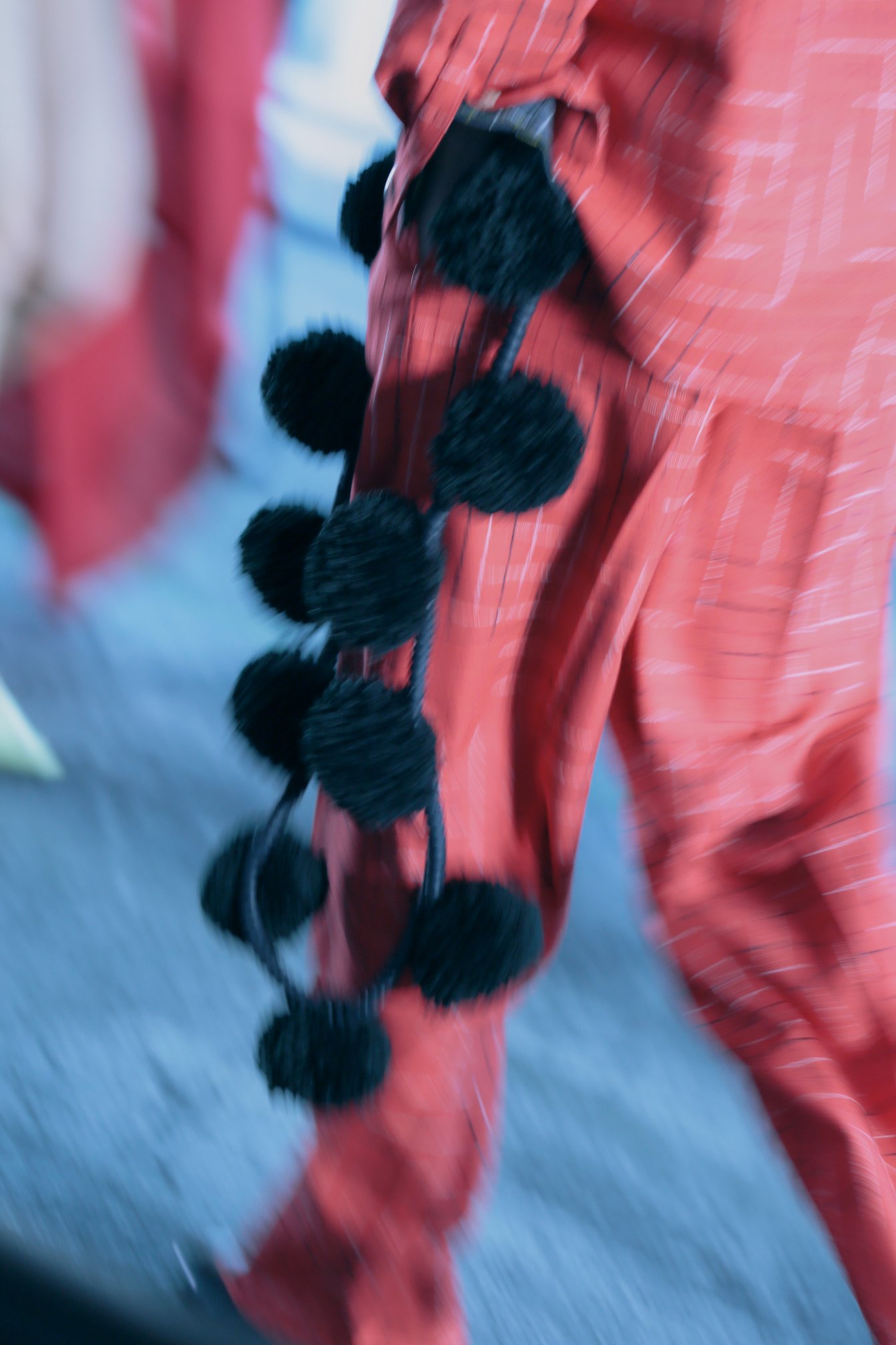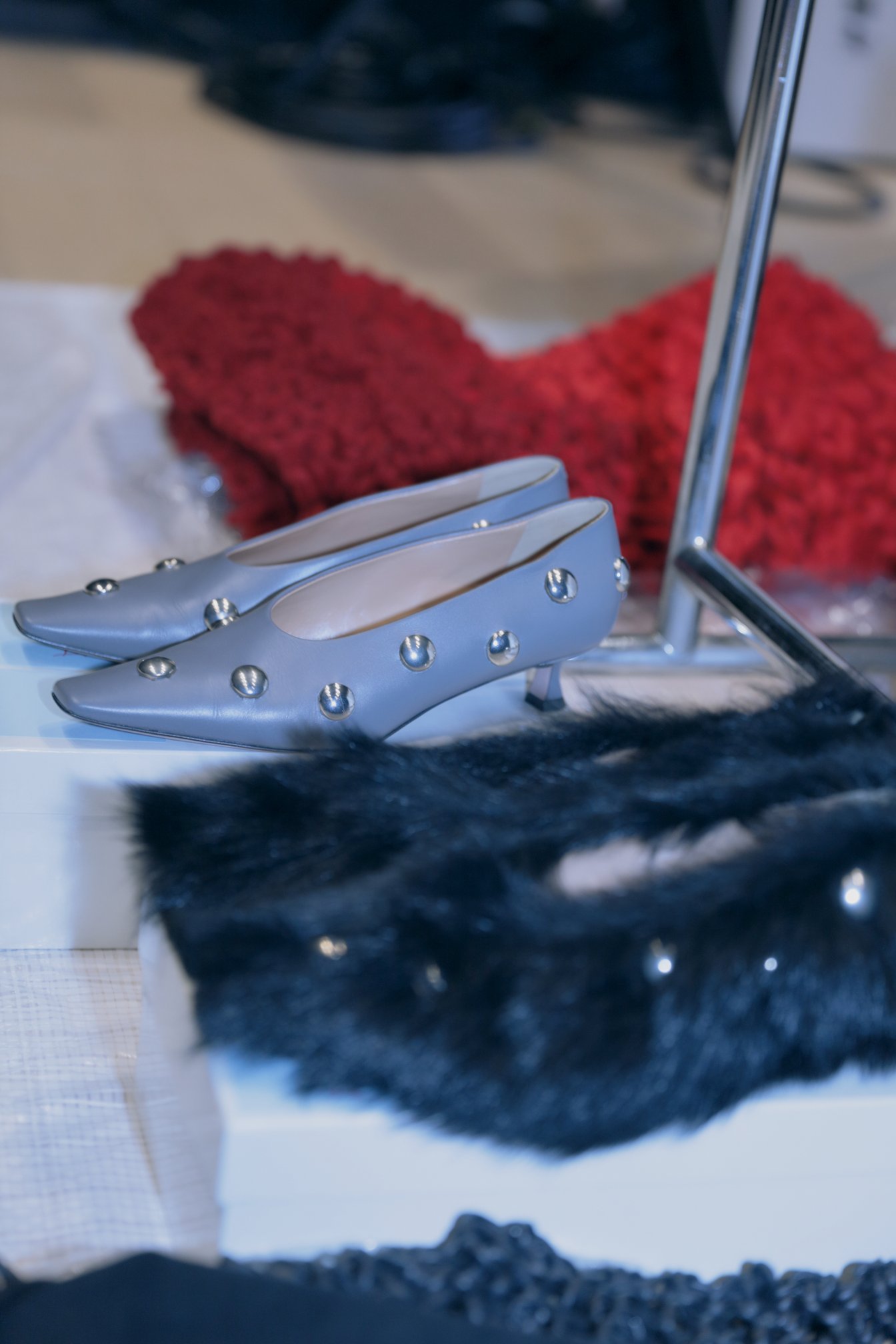 今季、佐々木はこれまでのエレガントで洗練されたスタイルから一歩踏み出し、あえて奇抜で遊び心のあるアイテムを取り入れる挑戦を試みた。例えば、真っ赤な画家のパレットを模したバッグやトップス、大きなポンポンをあしらったベルト、大胆にファーやスタッズをあしらったパンプスなど、彼が「スチューピッド(馬鹿らしい)」と形容するような要素を投入した。