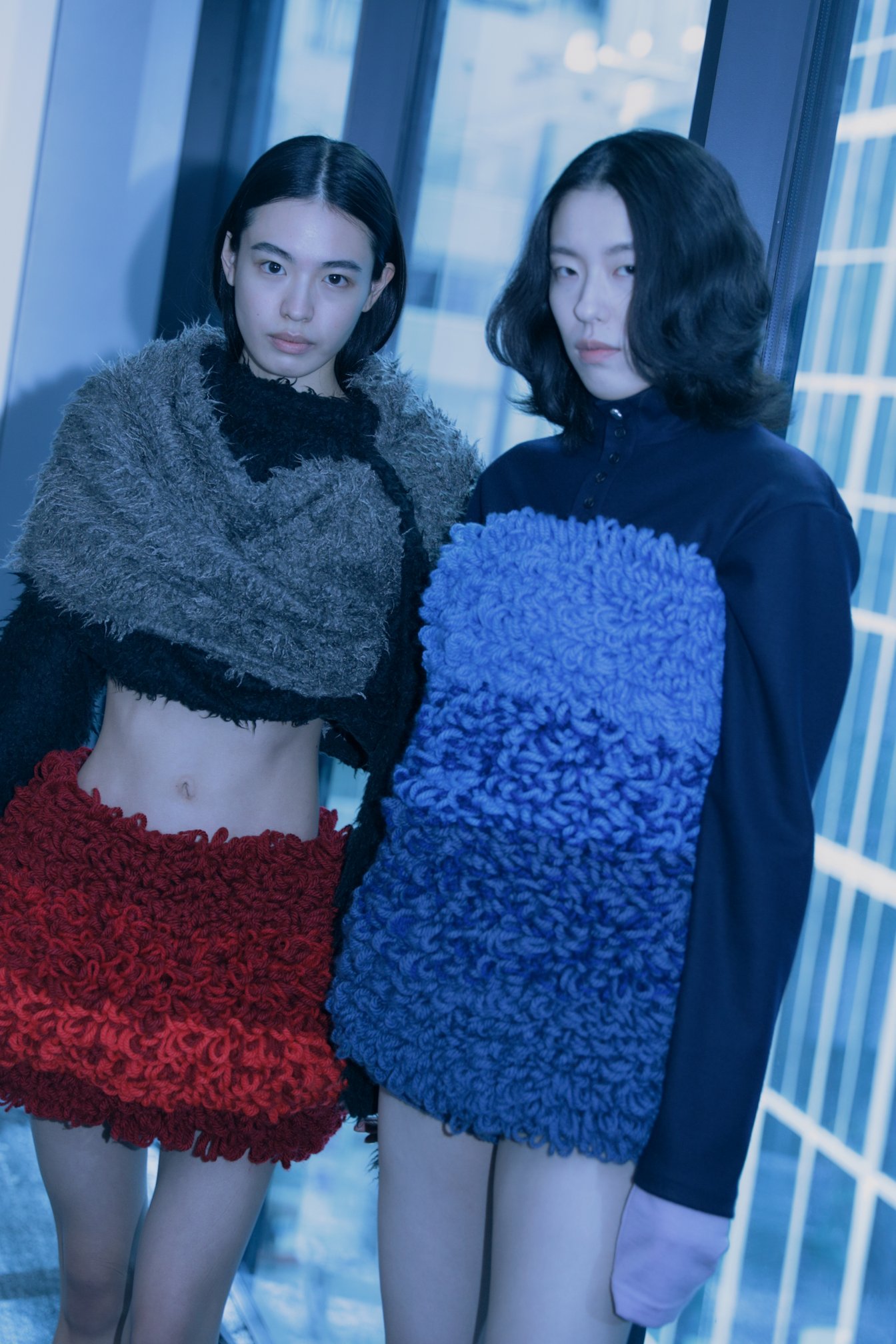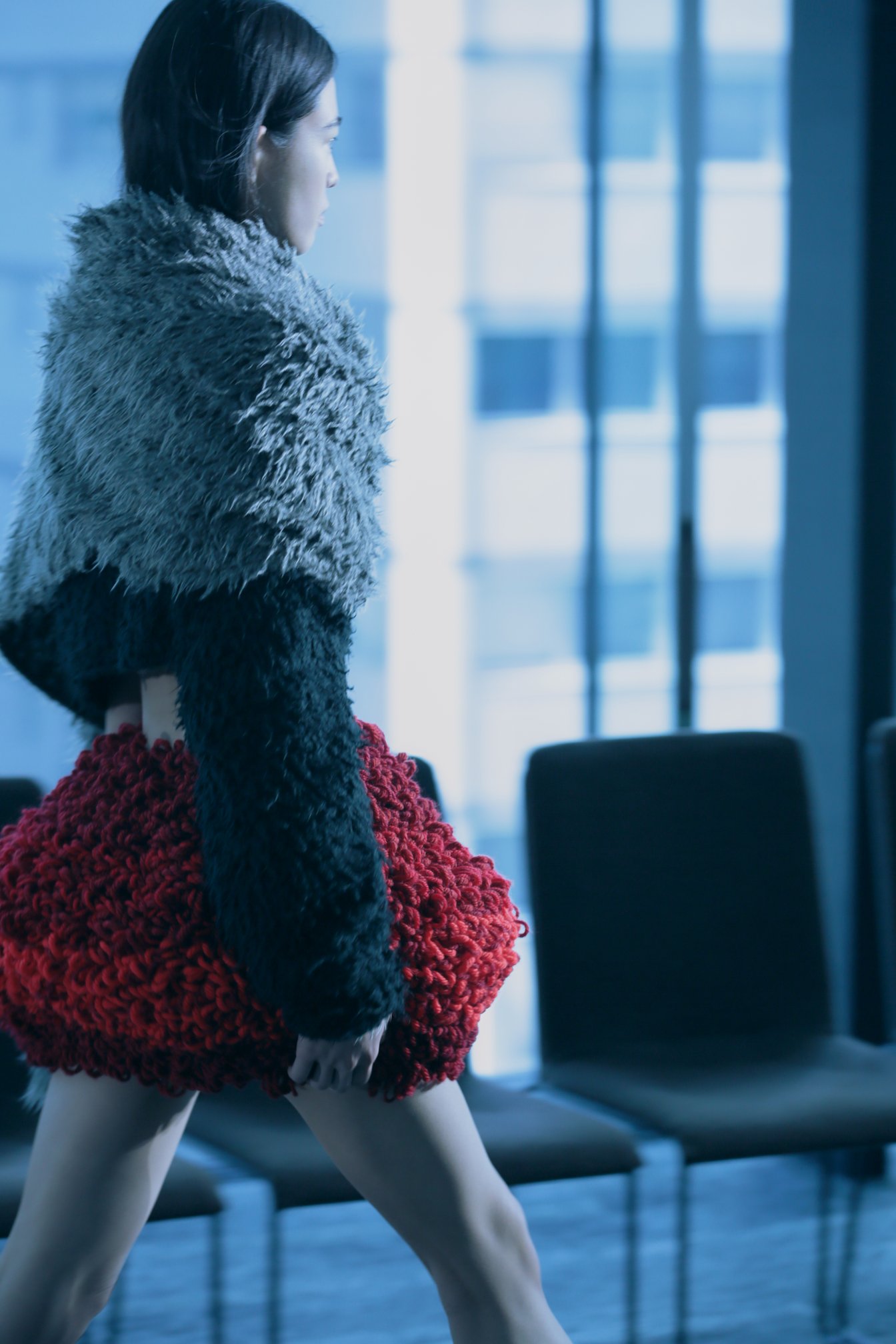 ロスコ作品の色彩にヒントを得たカラーパレットを基調に、佐々木が自身の感情を直感的に表現しようとする試みが随所に表れている。ファーストルックは、ハンドニットのループ編みで赤のグラデーションを表現したミニドレス。ニードルパンチで職人の手仕事によって表現されたバイアスチェックのコートもインパクトを放っている。