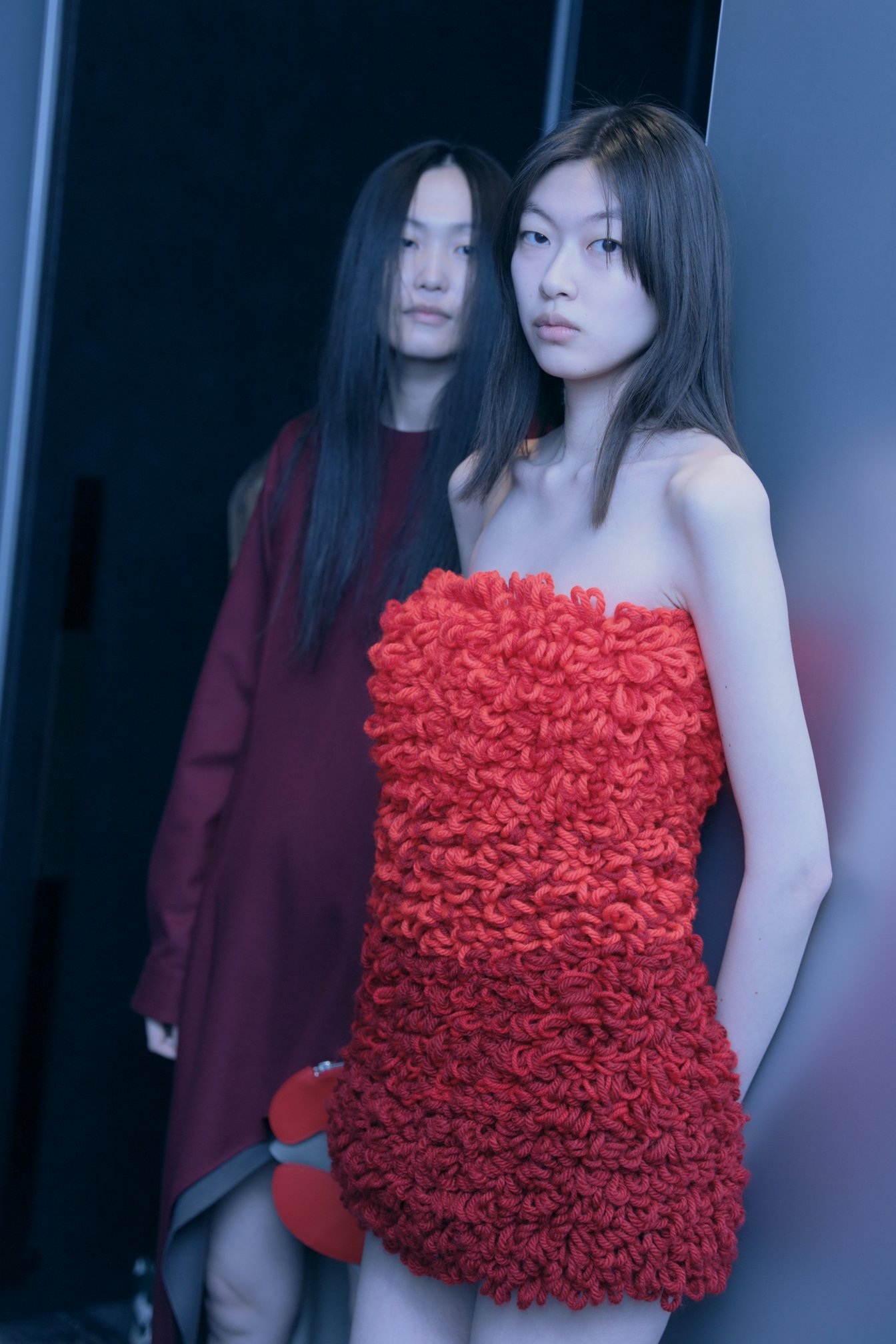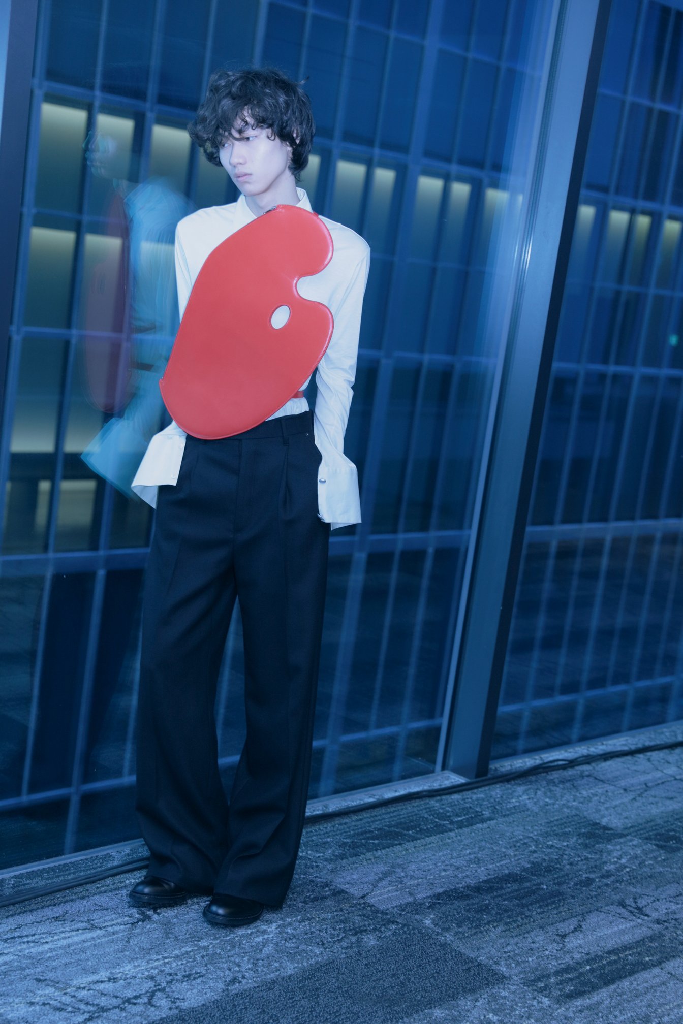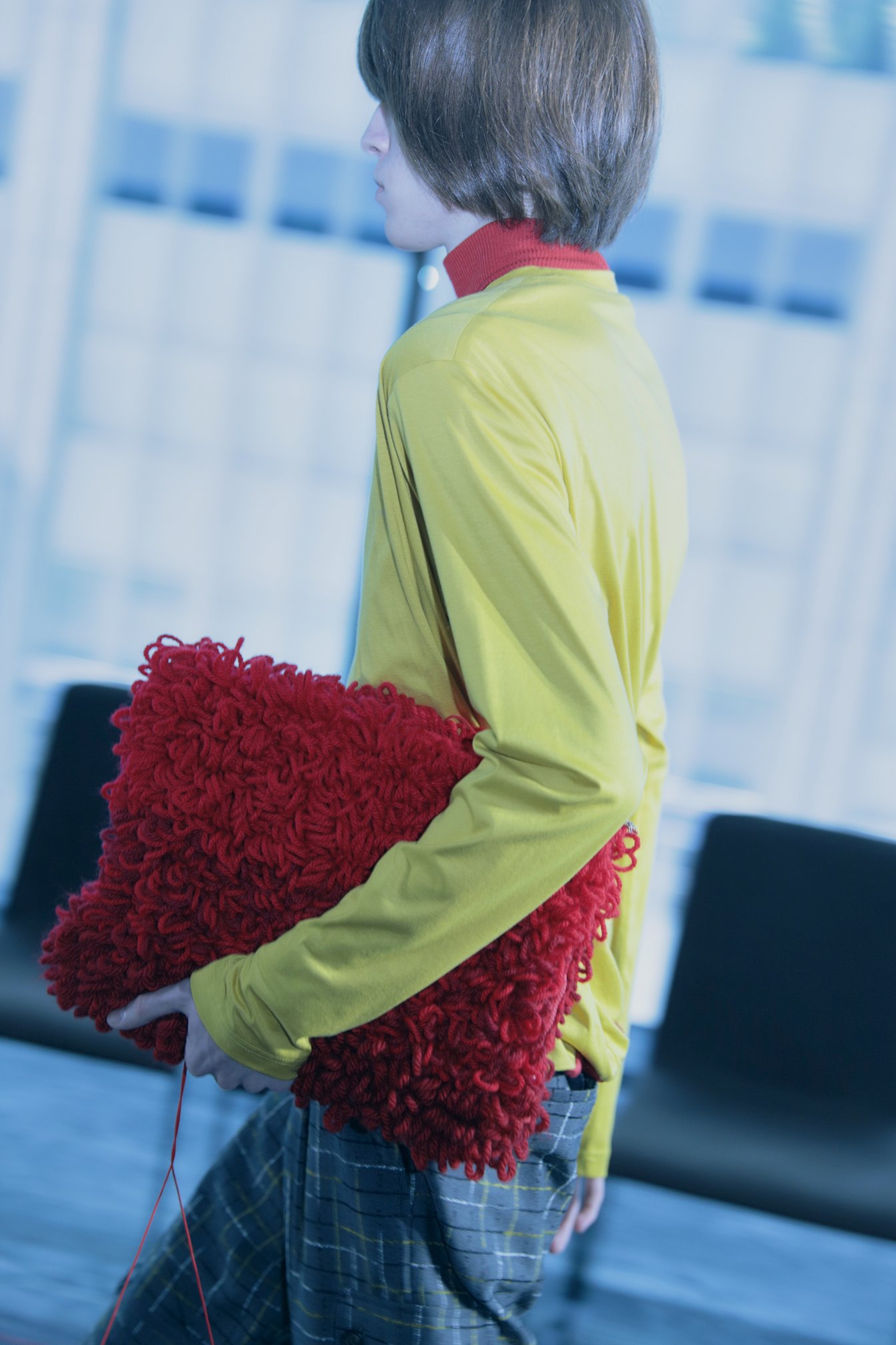 ロスコの“感情”に突き動かされ、フィービーの“ウィアードシェイプ”を反映させたデザインに加え、ループ編みのキャンバスをモデルが大切そうに胸に抱えたルックは、佐々木自身のルーツであり、愛する抽象画への深い愛情を表現している。