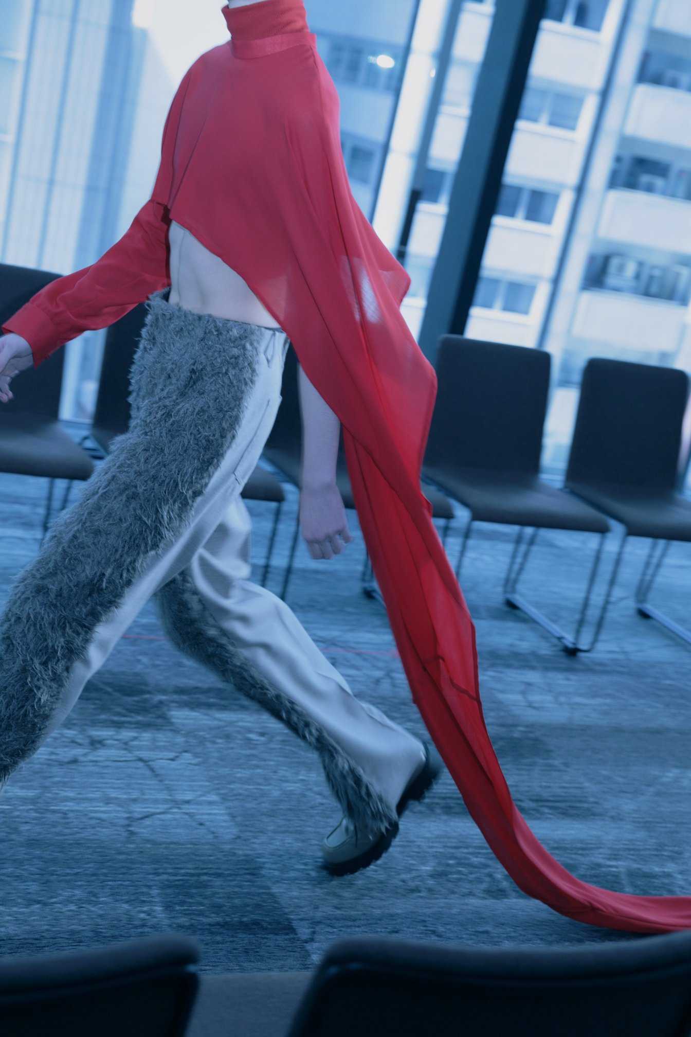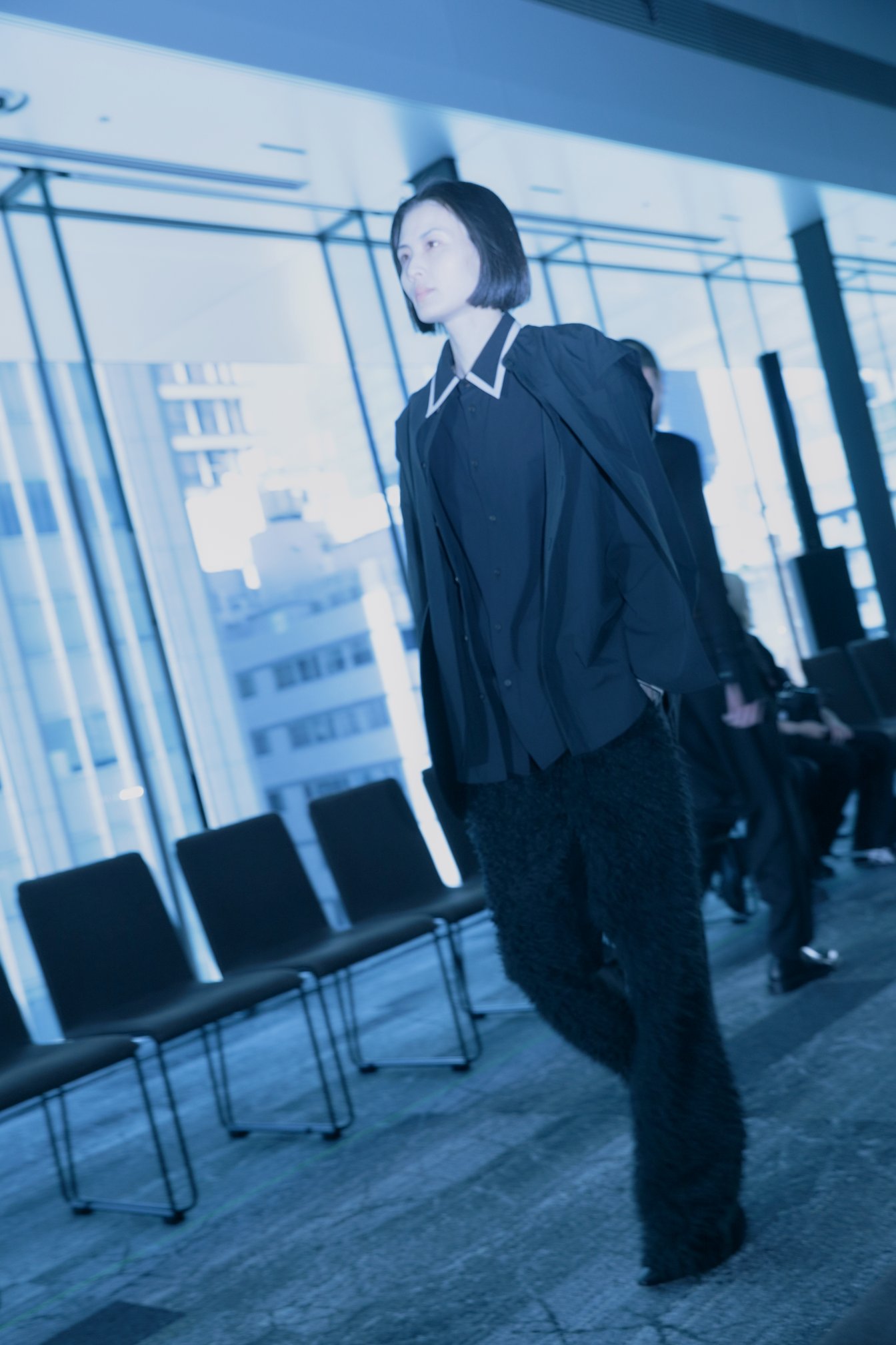 今季のコレクションでは、ダイナミックにカットされたアシンメトリーなスカートや、片袖が床を引きずるほど長く落ちたトップス、襟がケープのように広がるシャツ、ねじれたバックスタイルのジャケットなど、セリーヌでの経験を、佐々木自身のスタイルへと昇華させたデザインが随所に見受けられる。