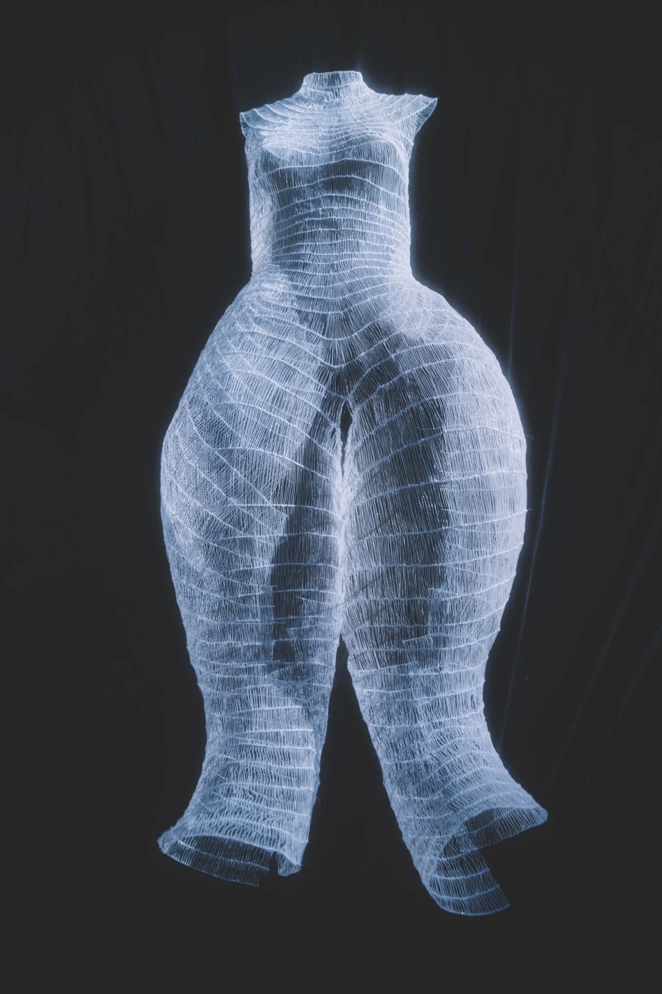 作り始めた当初は、普通に袖を通して着ることができる服を作ろうとしていました。でも、これまでやってこなかった布の縫製は思うようにいかず、それを専門に学んできた人たちと同じやり方では太刀打ちできないと感じて。まったく違う素材や技法を見つける必要があると思い、3Dペンで面を作る方法を編み出しました。このオリジナル素材は、ヴィジュアルのインパクトこそ強かったものの、実際に袖を通すと硬くてすぐに割れてしまうし、なにより着ていて痛い。試行錯誤する中で、試しに前身頃だけを残してみたところ、袖を通さずに身体の前に重ねることで、まるで服が浮いているような不思議な見え方になることに気づきました。それが面白いと感じて、そのまま採用したんです。