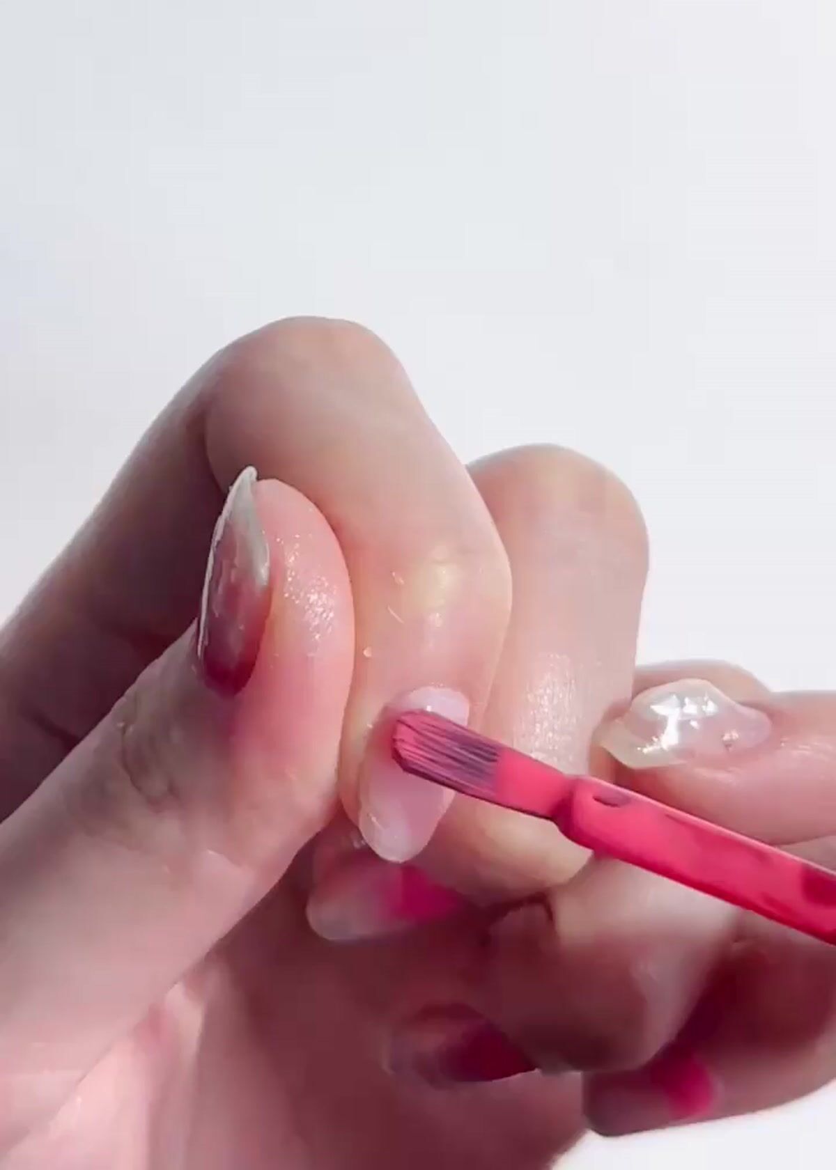 「オサジ(OSAJI)」のライトブルー、「マニキュリスト(manucurist)」のベージュとコーラルピンクの3色で淡水の湖に夕陽が沈む様子を描いたデザイン。青く澄んだ空がゆっくりと赤く染まる神秘的なマジックアワーを彷彿とさせます。爪を横に3分割し、コーラルピンク→ベージュ→ライトブルーの順で塗布すると春夏らしい爽やかなマーブルネイルが完成。色の境目をぼかすように大胆に色を重ねた方がきれいに仕上がるそう。Tシャツとブルーデニムなどシンプルな着こなしに花を添えてくれそうなデザインです。