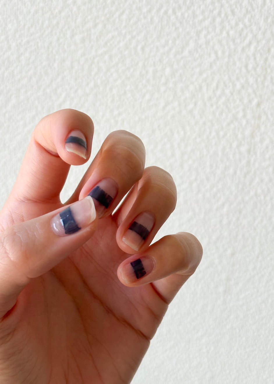 マスキングテープを使えばモードなラインネイルも簡単。カラーを爪全体に塗らないことで圧迫感を与えずに洗練された、“こなれた”手元が完成します。ブラックコーデなど、今日は決めたい!という日に取り入れてみては?