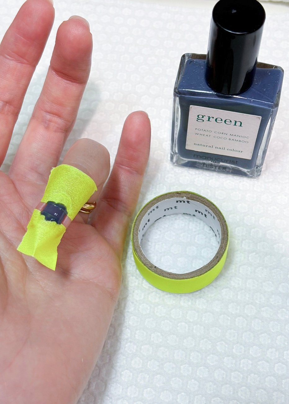 ②マスキングテープを好みの幅で上下に巻き、空いたところにマニキュリストのポピーシードを載せます。