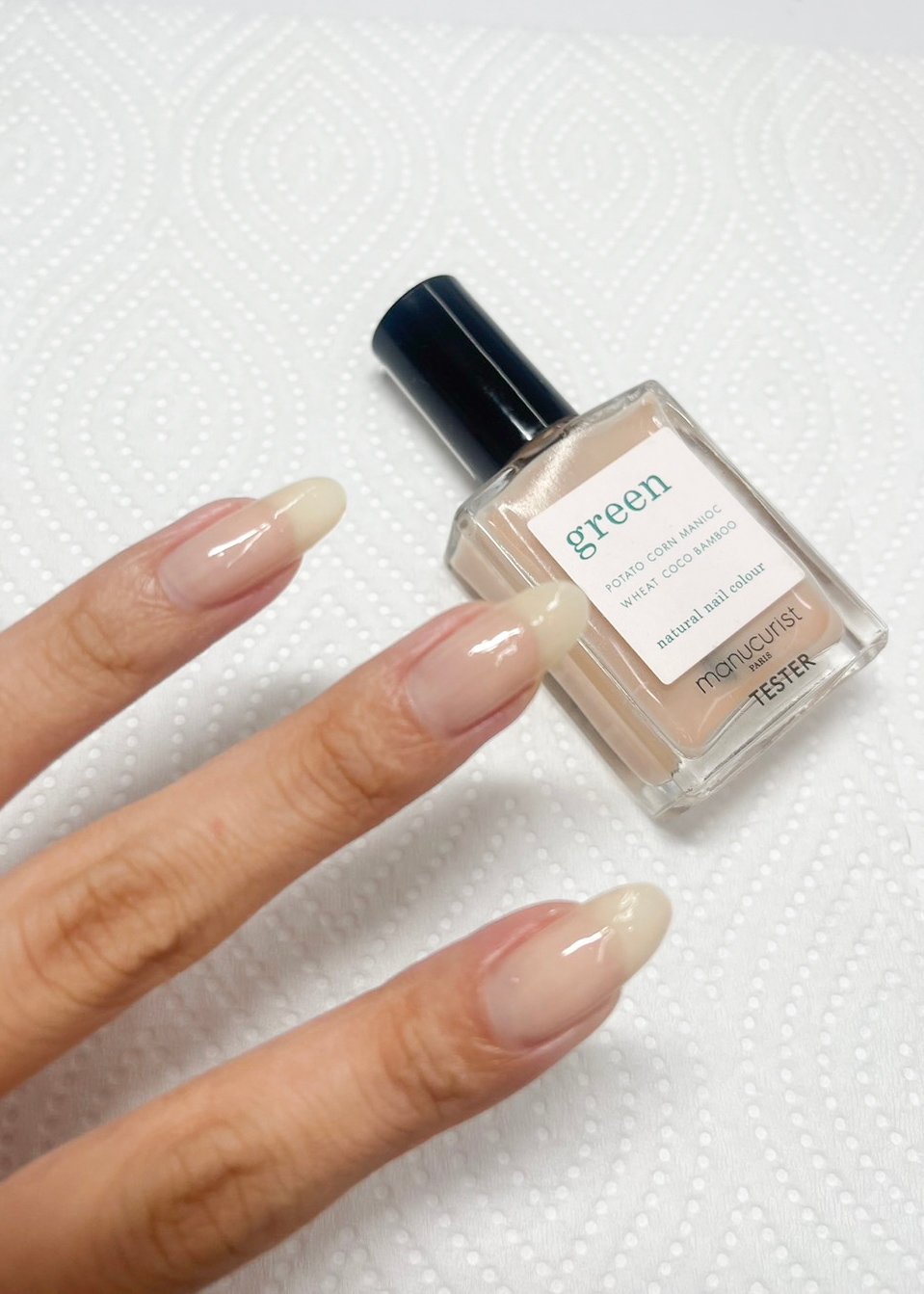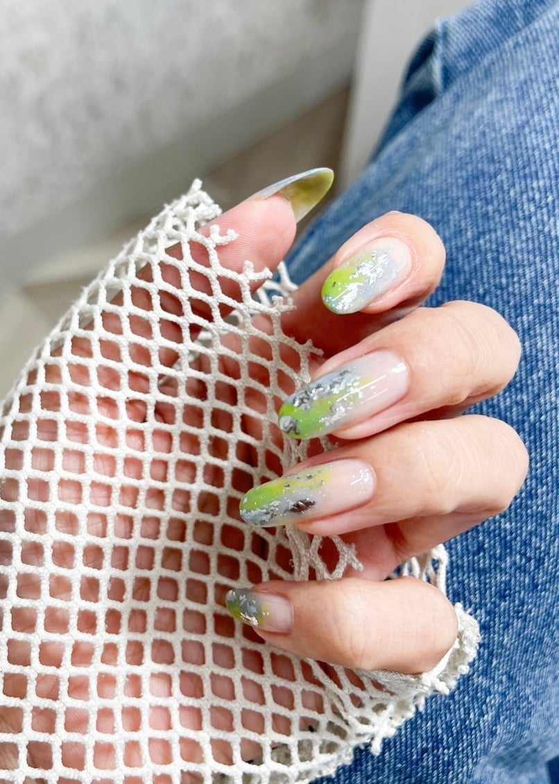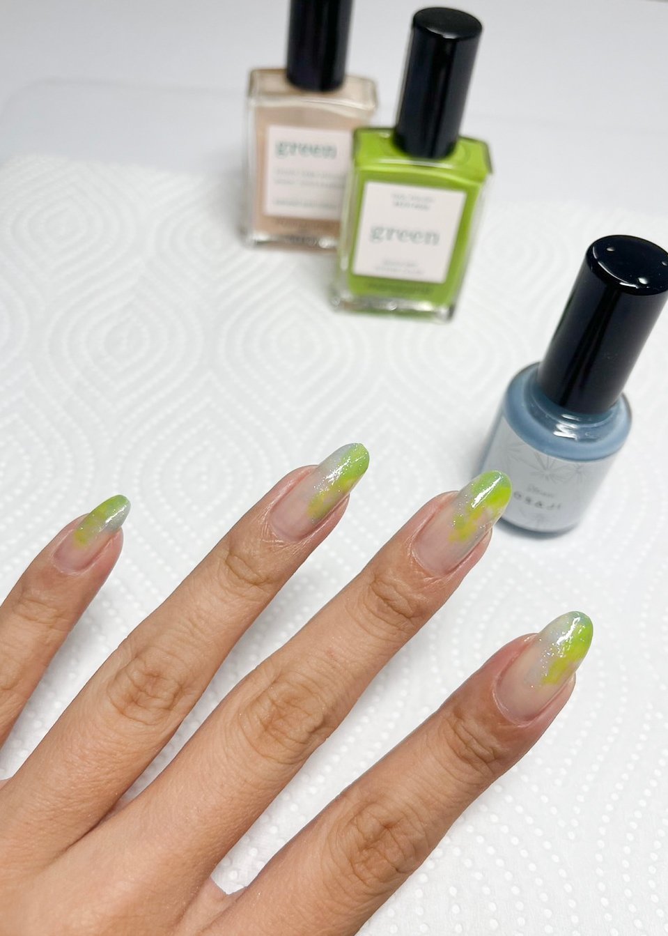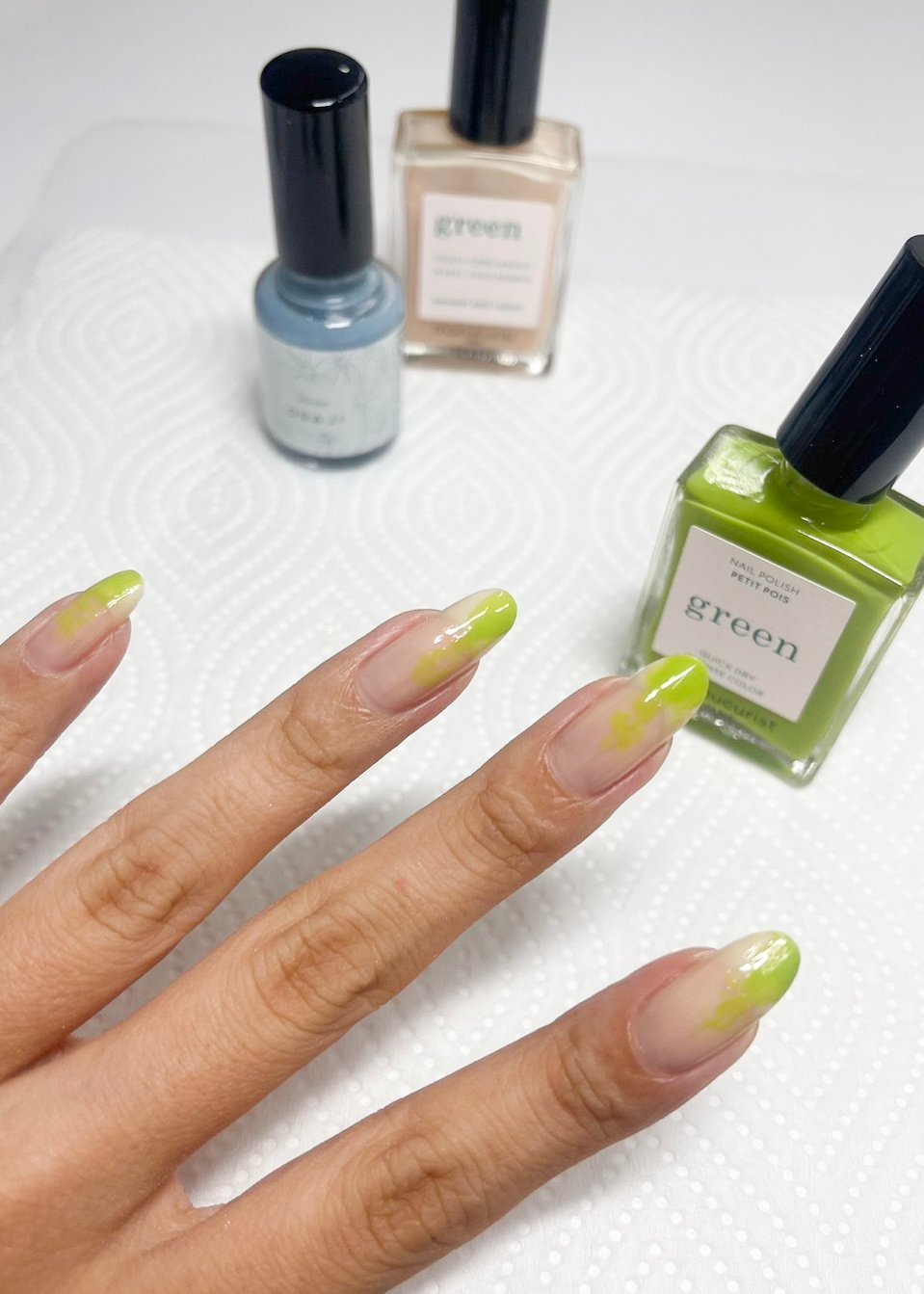 ②マニキュリストのライトグリーンを爪の上部にささっと載せます。濃い色から塗ると調整しやすく、失敗を防げるそうです。
