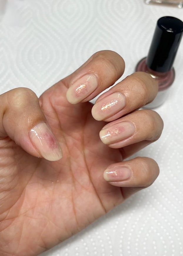 頬にチークを入れたような血色感がジュワッと広がるパープルネイル。クリア × ラメカラーでシンプルでありながら洗練された手元が完成します。また爪の中央のみにカラーを載せることで程よい抜け感を演出。左右の手でメインカラーを変えるのもおすすめだそうです。