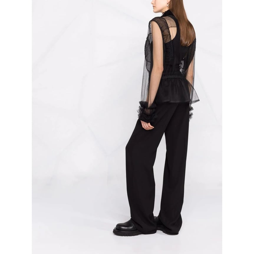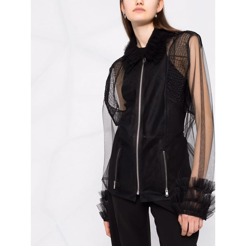 「メゾン マルジェラ(Maison Margiela)」のチュールシャツは、ファスナー仕様の辛口なブラックカラーとフェミニンなフリルのバランスが秀逸。バックスタイルはキュッとギャザーを寄せているので、また違う魅力をアピールできます。