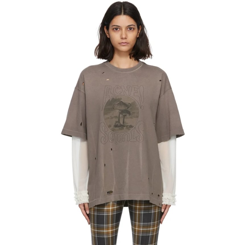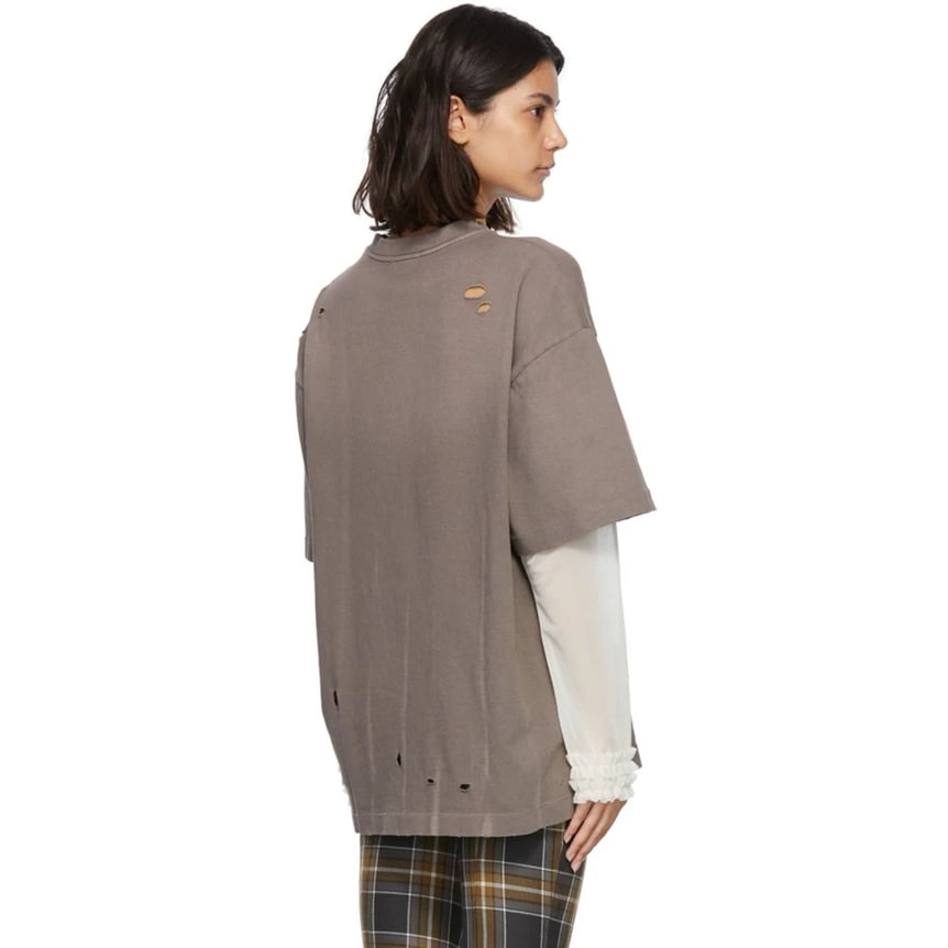 ユーズド感のあるダメージTシャツからシフォンスリーブが覗く「アクネ ストゥディオズ(Acne Studios)」のTシャツ。フェミニンなイメージが強いシアーアイテムをボーイッシュに着こなせます。