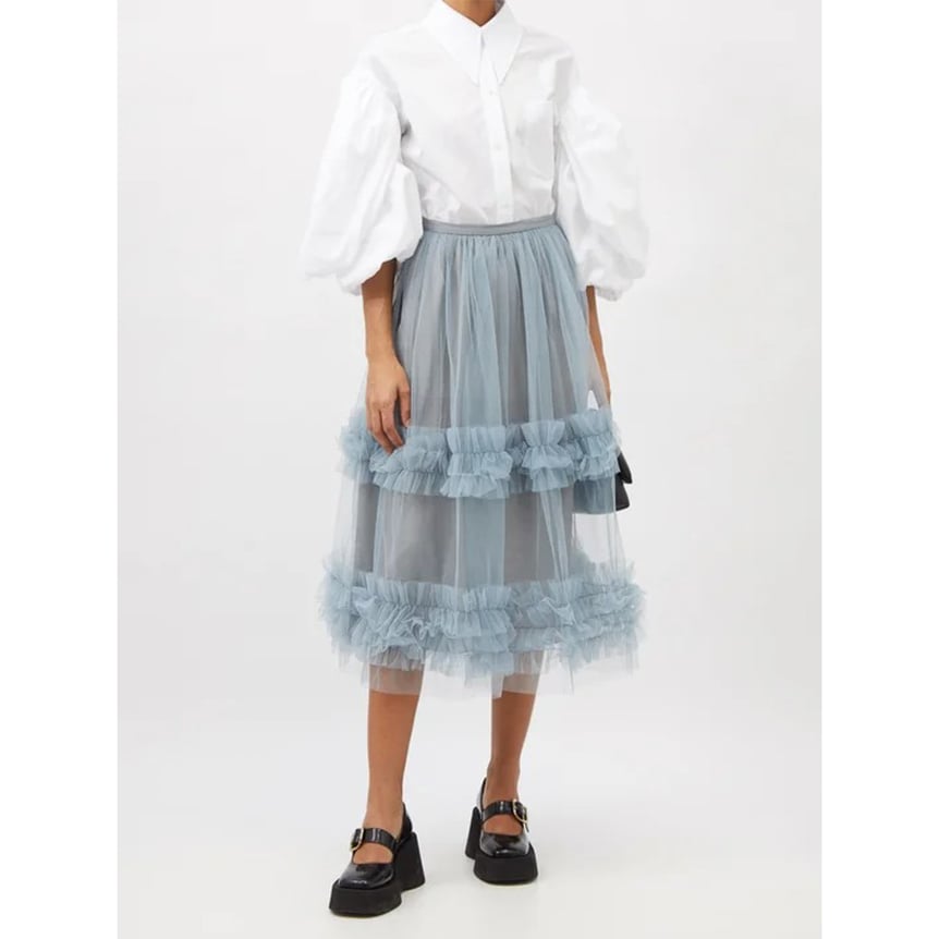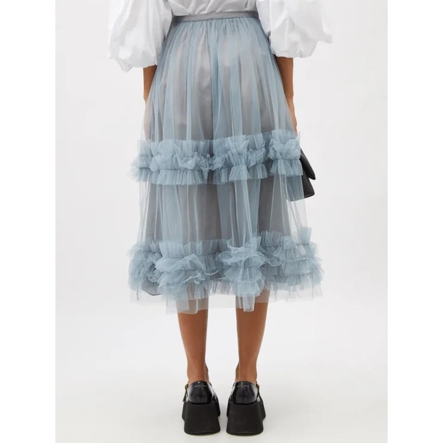 チュールにフリルと「モリー ゴダード(Molly Goddard)」らしさ全開なフリルスカート。スモーキーなブルーカラーに、膝下のミディ丈シルエットで女性らしさを演出してくれます。