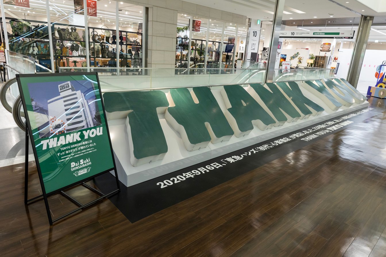 東急ハンズは、9階から11階の3フロアにわたって出店。10階エスカレーター横には、今年9月に閉店した初代東急ハンズ心斎橋店の看板文字を並べ直して制作した「THANK YOU」のプロップが飾られています。