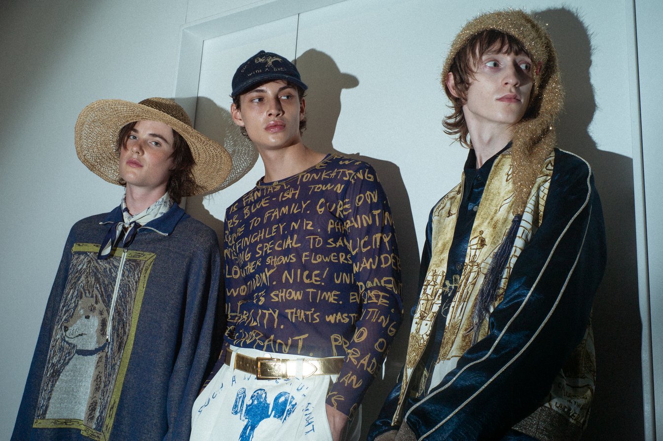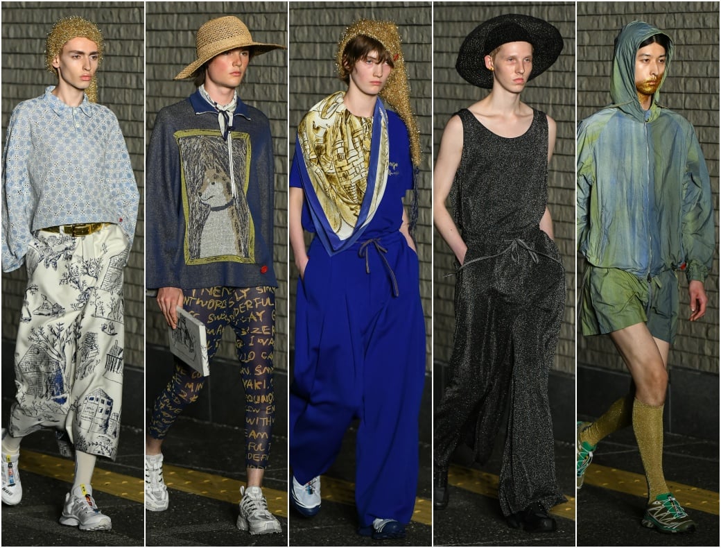 「夜道を散歩した時に考えたコレクションだから」と書いてあったから、白→青→黒→黄色と移り変わるアイテムカラーが、日が沈み、星が煌めき、また朝日が昇り鳥が飛ぶ毎日の営みのように感じられる。散歩にはいつも某プレミアムなビールを飲んでいたからと綴られていたから、深いブルーとゴールドの組み合わせは某ビールの配色だと気づいてくすりと笑ってしまう。「ビールも手伝って、頭の中の真っ白いキャンバスに絵が描かれていく」と教えてくれたから、ゴッホのように麦わら帽子を被ったモデルに理解が及ぶ。