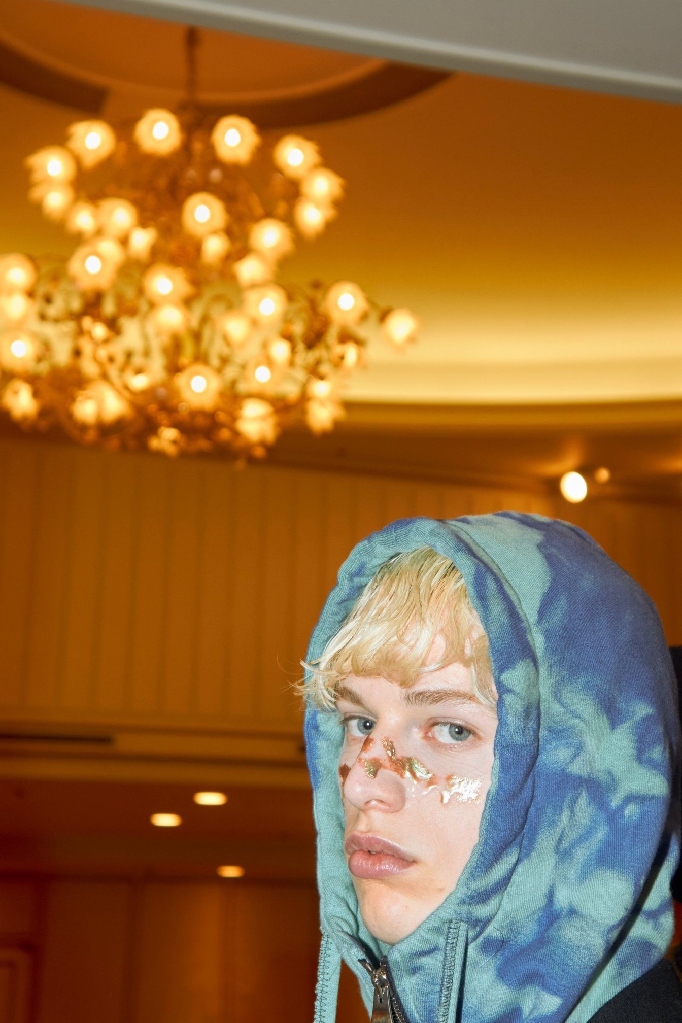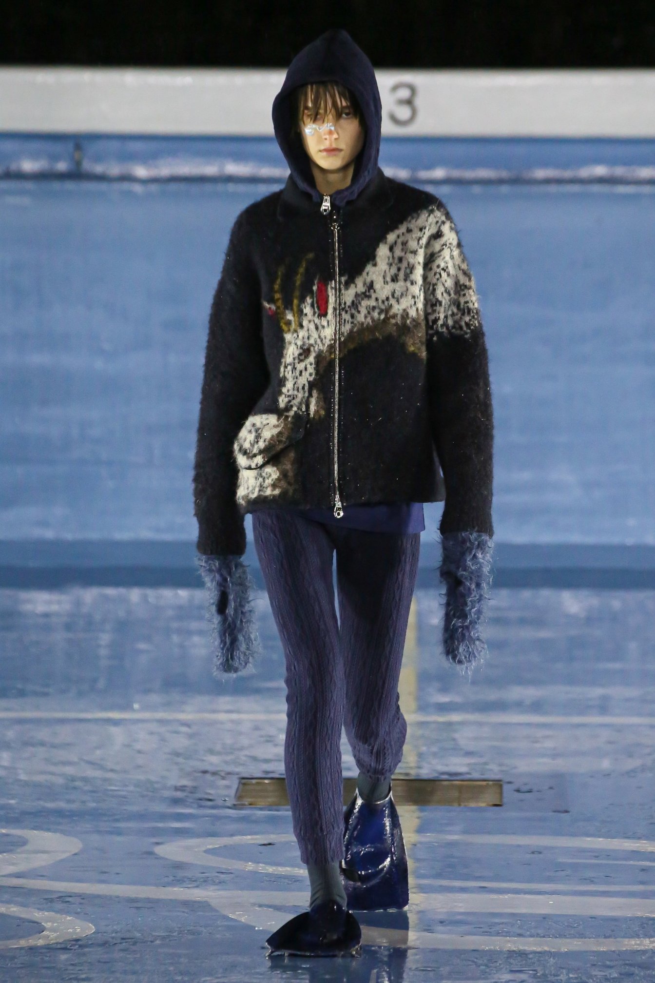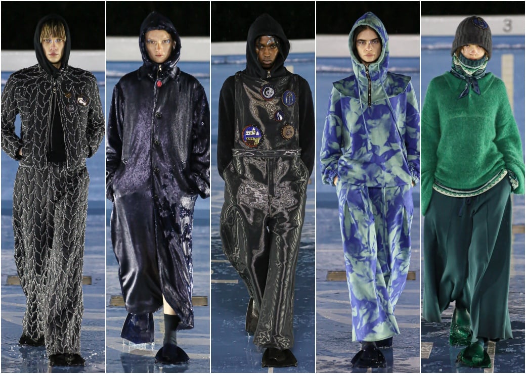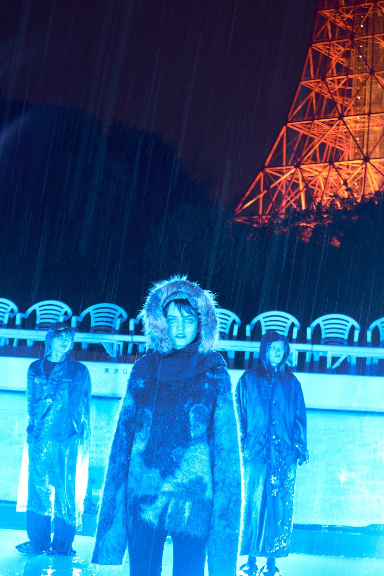 「水」ではなくあくまで「水面」を思わせるのだ。それは、小塚が施したデザインによるところが大きいだろう。水面から浮かび上がる時の、水面に沈む時の、ゴーグル越しで視界がぐにゃりと揺らめく様。あのテクスチャーを取り入れたデザインが随所に見られる。シルバーのビーズがハニカム構造のように施されたアイテム、生地を撫でることでスパンコールが露わになるコート、青で絞り染めをされたようなパーカーなどはまさに、ラムネゼリーのように時たま歪んだりきらめいたりする水面を思わせる。艶やかな黒いサテン生地は水を含んだ水着にも見えるし、水面から浮かび上がる時に太陽を直視してしまった時は、一瞬視界がグリーンに染まる時もある。