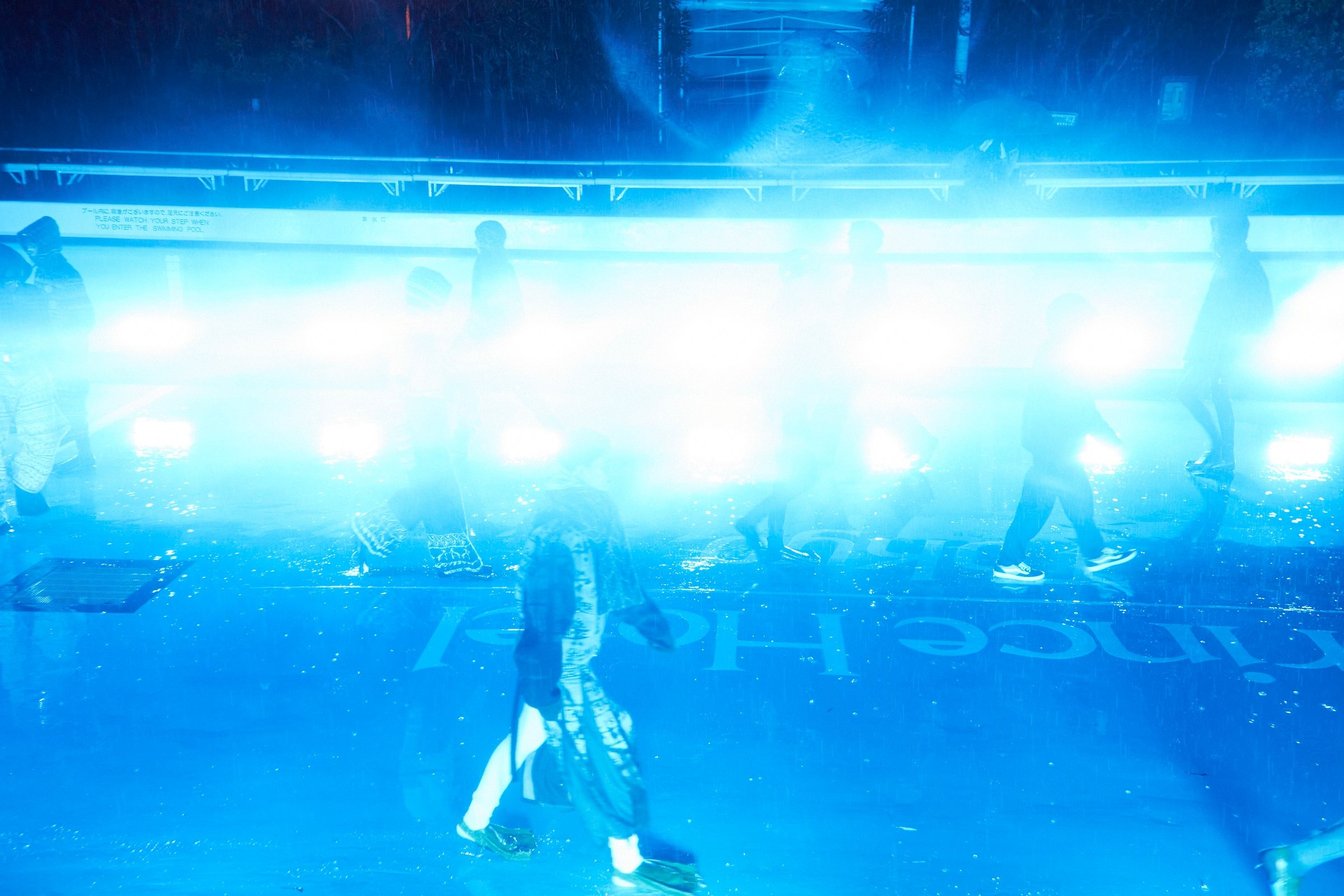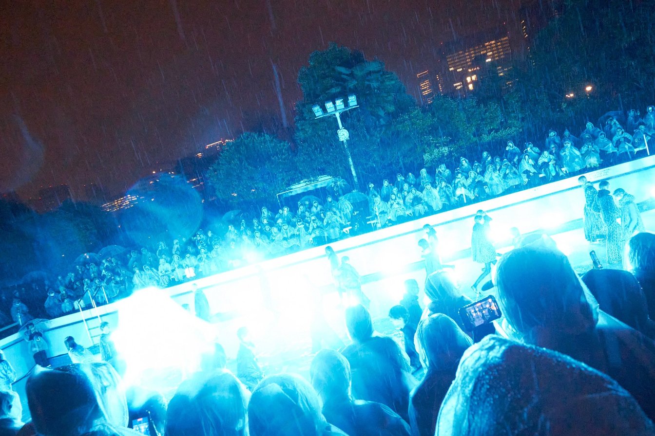 小塚は冬生まれだ。そして「人は自分が生まれた季節が一番落ち着く」という持論を持っている。「常日頃、街には色が多すぎると思っている僕にとっては、雪が降れば降るほど、街はアイス色の化粧をまとっていき、そのメイクアップを見るのが好きだ」と宣う小塚の気持ちを汲み取ったかのように、雨が振りしきり、来場者には白い雨合羽が配られた。それを見ながら、プールサイドに雪が積もったな、と思った。