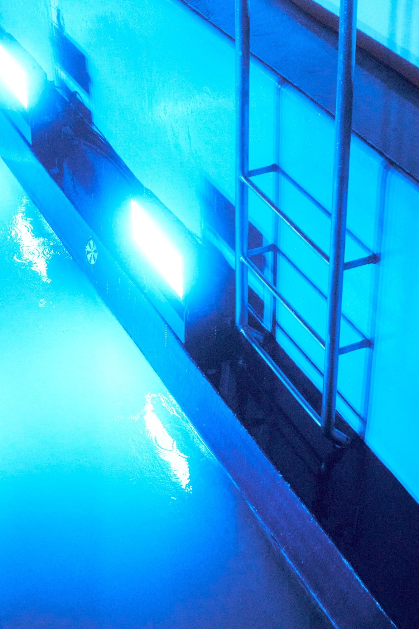 そんなことを考えているうちに、プールの中を泳ぐようにモデルが歩く。プールサイドからモデルを見下ろすという特性上、服ではなく水面での光の屈折についてを考えていた。水面は、振動面が横方向の光を多く反射する。つまり、横方向の偏向が人の目に映るので水面はしばしばキラキラと光って見えるのだ。上からモデルをずっと眺めていると「服を着ている人」というよりは「絶え間なく動き続けている水面」のようにも感じ、魚群を見ているような気持ちにもなった。