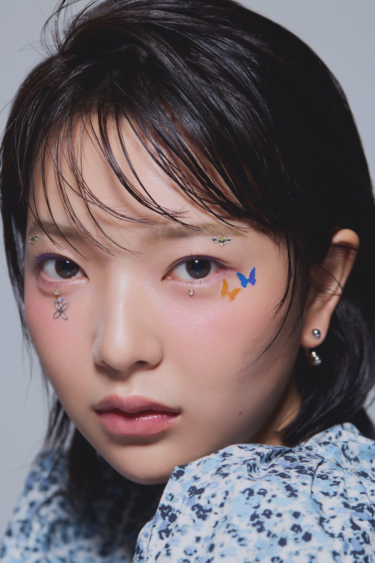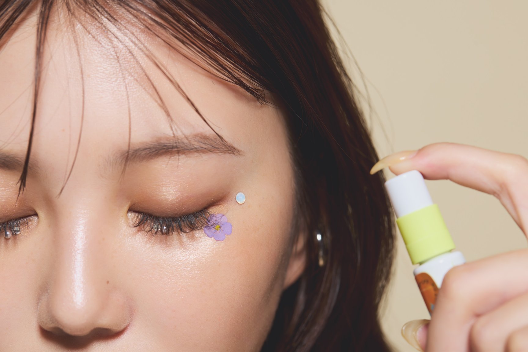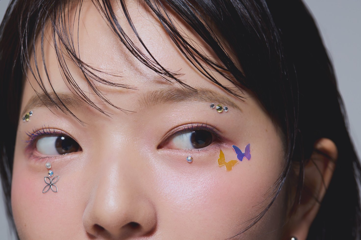 偏光カラーのバタフライのパーツがキャッチーなスキンアクセサリー™︎(C)。モデルの琹さんはバタフライのパーツを主役に、目元の印象をナチュラルに強調するストーン使いを効かせたメイクに。「ジェルとミストでこんなにしっかりパーツがくっつくなんてびっくりしました。友達とライブに行ったり、イベントがある時につけて写真を撮りたくなりました。バタフライはもちろんですが、目頭のストーン使いが可愛くて、いつものファッションにこれだけ取り入れるだけでも、一気におしゃれさが増すんじゃないかなと思いました」(琹)