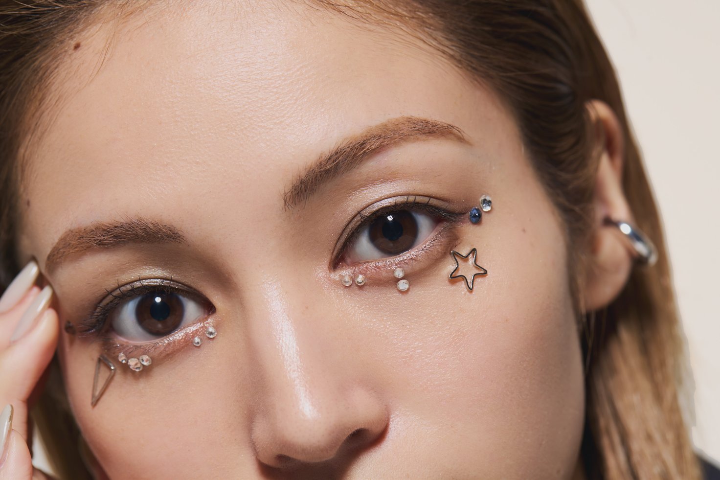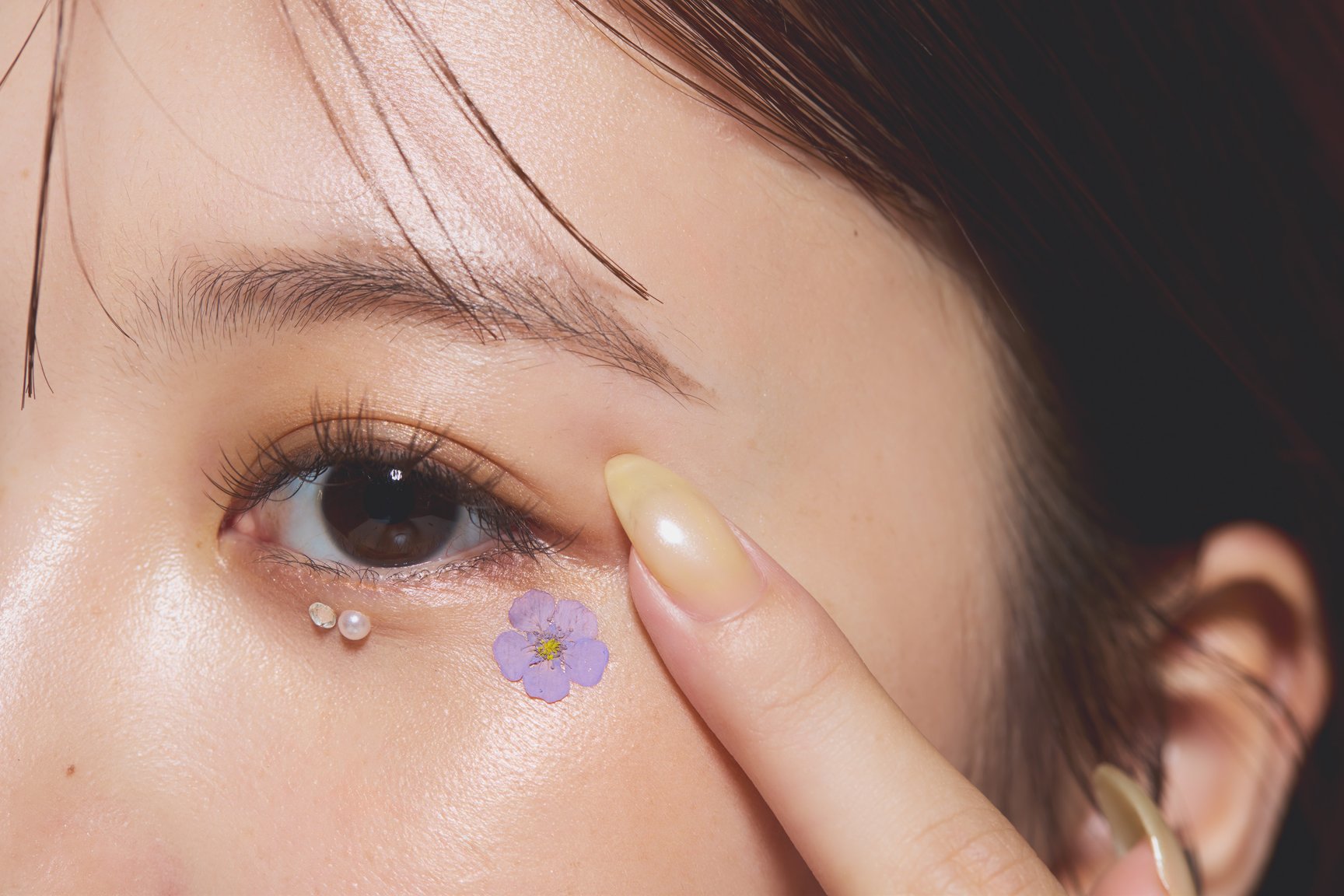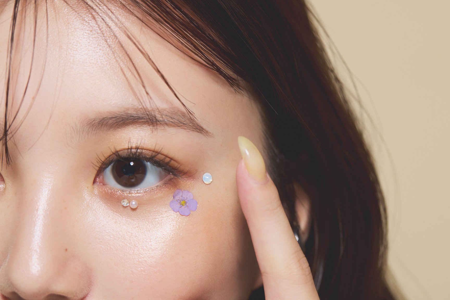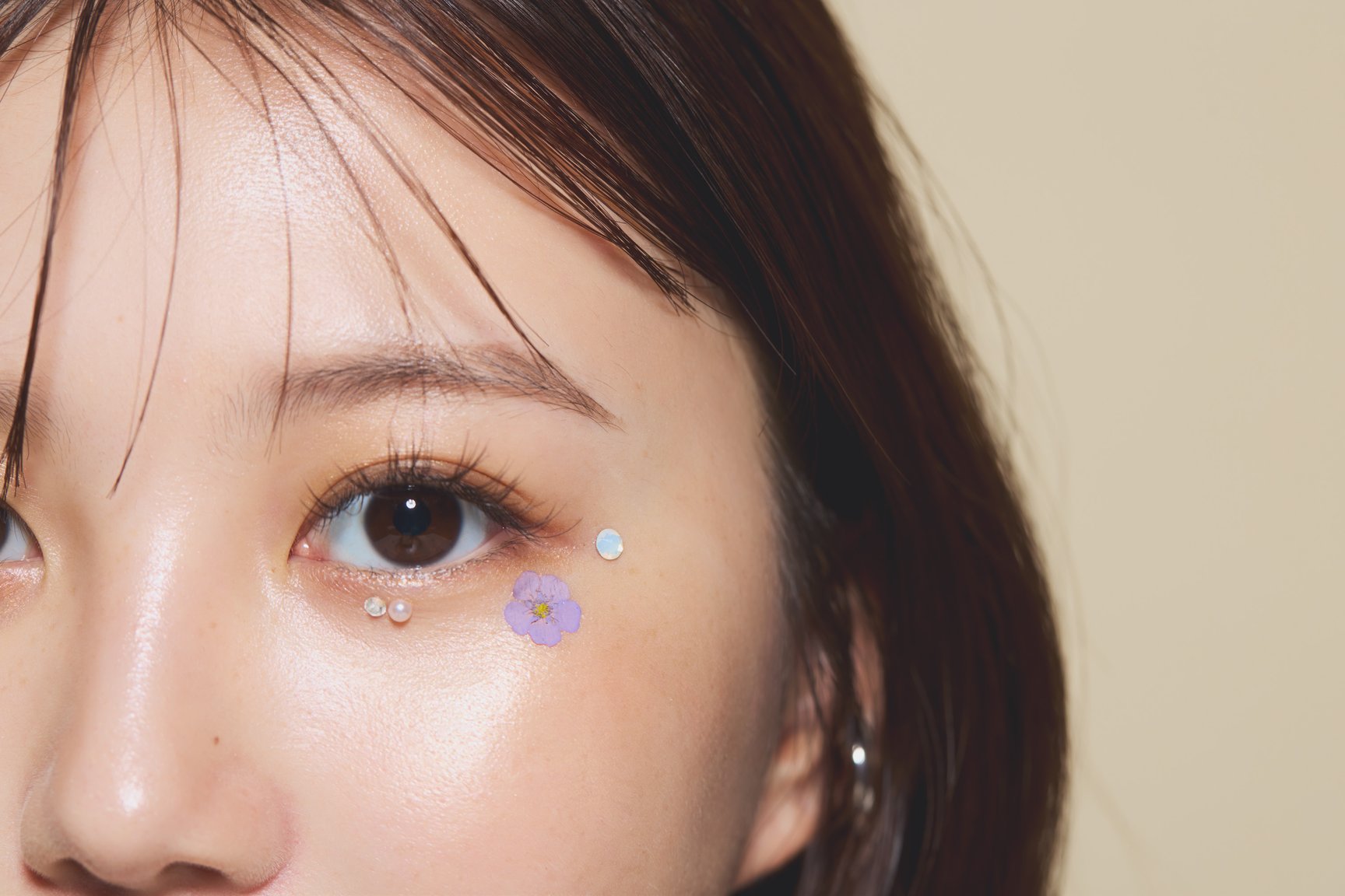 見る角度によって多彩に輝くオーロラのようなバタフライが印象的なスキンアクセサリー™︎(C)。幻想的でありながら女性的な柔らかさを兼ね備え、アンニュイな表情を彩ってくれます。色が異なるバタフライのパーツを2個使いすれば、視線を釘付け。ストーンを涙袋や眉下にアクセントとして取り入れると、目周りの余白をおしゃれに埋めながら、一気に華やかさが増します。