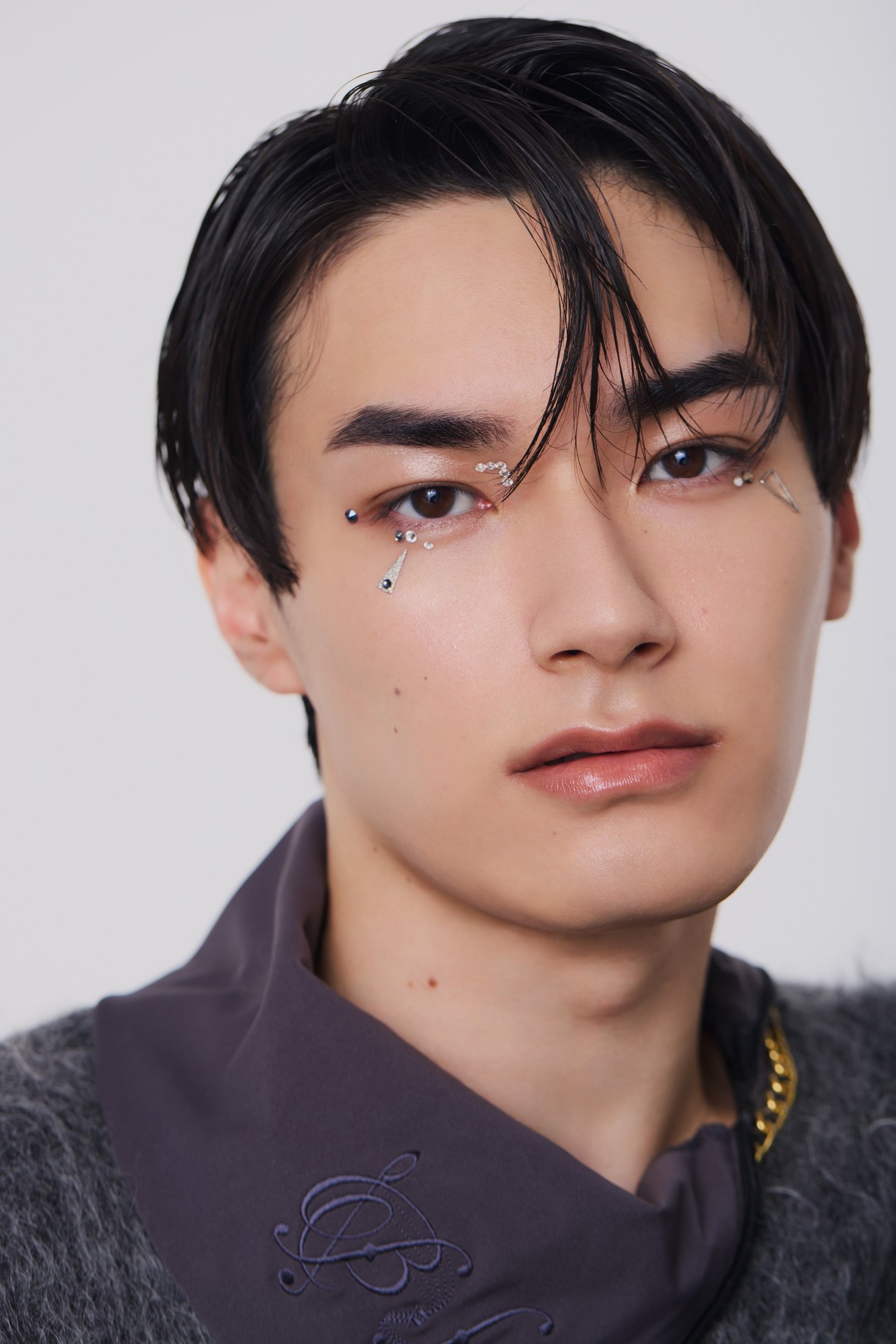 シンプルでシャープなパーツが揃うスキンアクセサリー™︎(A)はメンズもポイント使いしやすいセット。モデルでメンズビューティコンテンツの発信にも力を入れている、あおいさんは、くっきりとした目鼻立ちのアクセントになるようにトライアングルのパーツやストーンを取り入れました。「“スキンアクセサリー™︎”ってメイクとは違って、細かいことを考えずに、ファッションアイテムみたいに感覚的に『ここにつけたらかっこいいかも?』と使えそうなのが新鮮でした。今日つけていただいたパーツの中では左目の下のトライアングルのパーツがお気に入りです」(あおい)