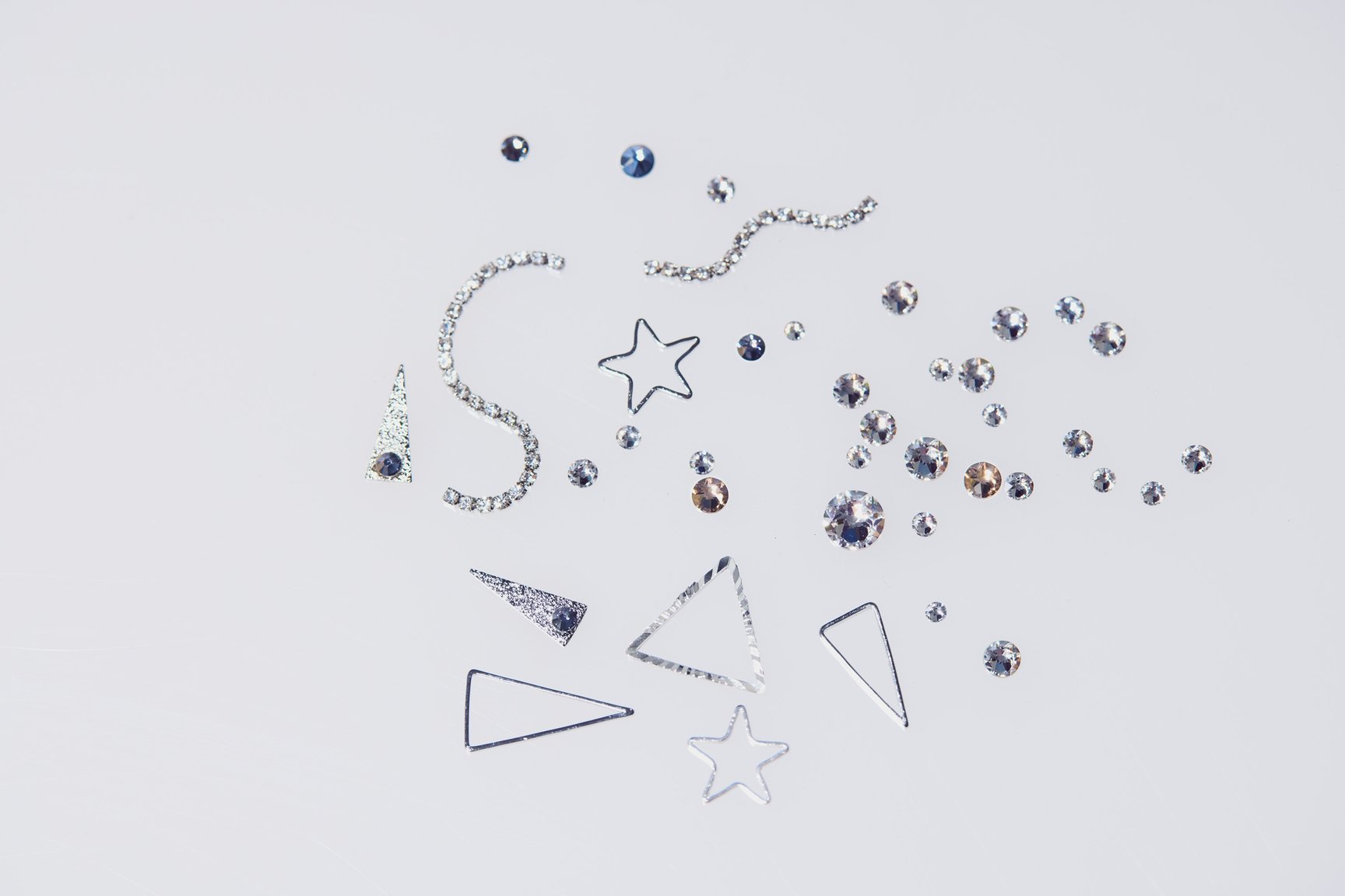 スキンアクセサリー™︎(A)のシルバーのフレームパーツを使ってクールな雰囲気に。トライアングルや星のシャープなモチーフは複数を組み合わせてもまとまりがよく、バランスも取りやすく◎。目尻のアイラインの延長や涙袋にはシルバーやクリアなブラックに輝くストーンを散りばめれば、キリッと目力がプラス。かっこよさの中にも遊び心があり、ファッショナブルなメイクが完成します。