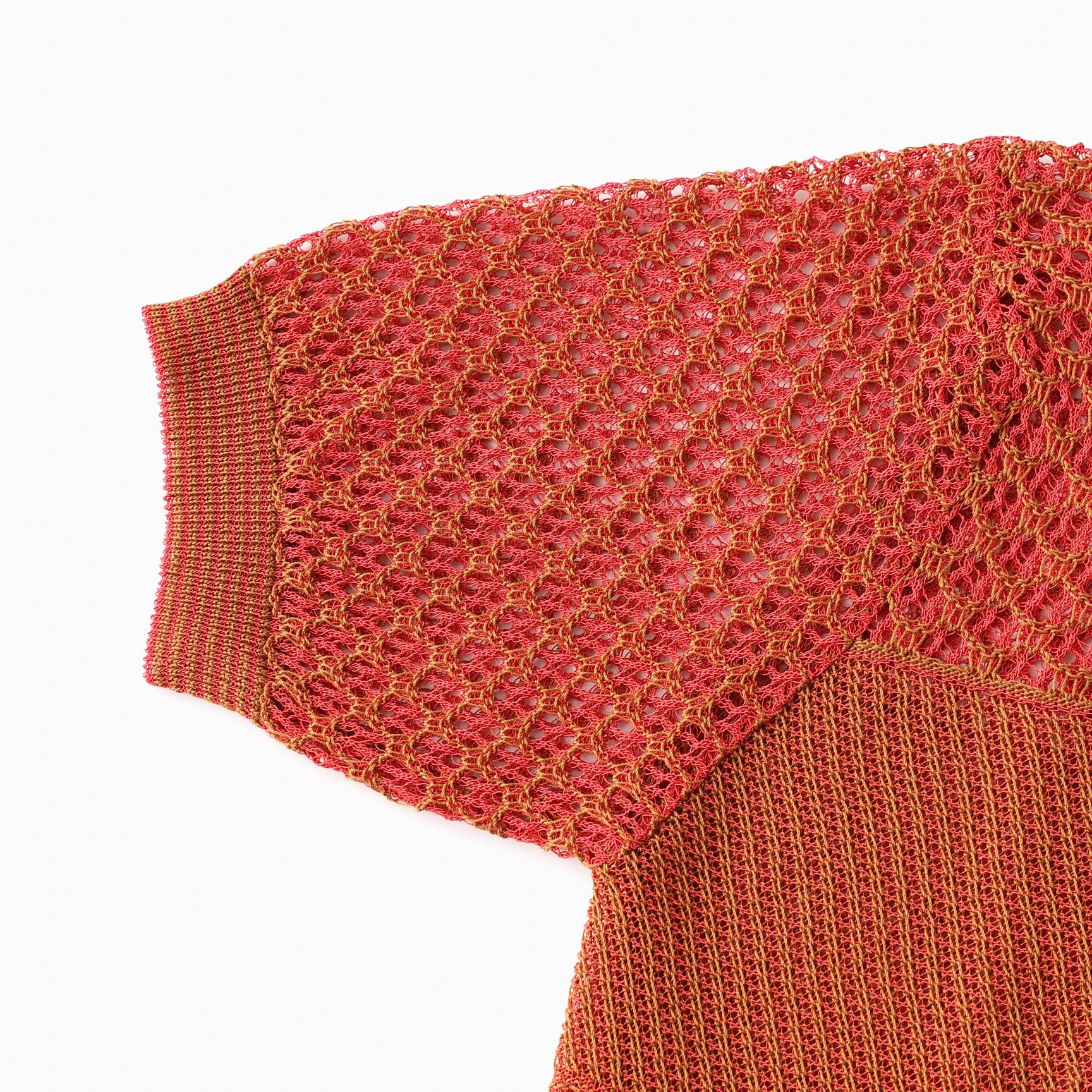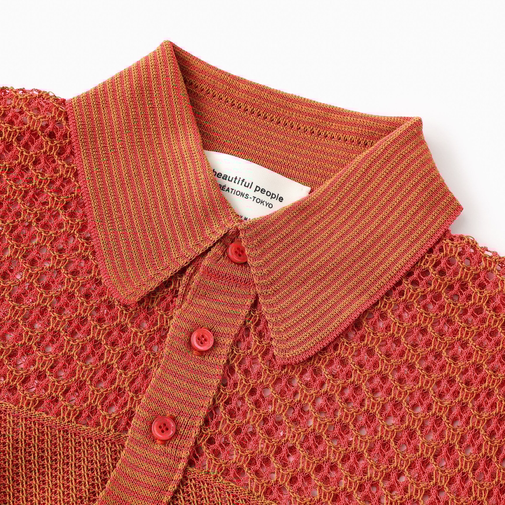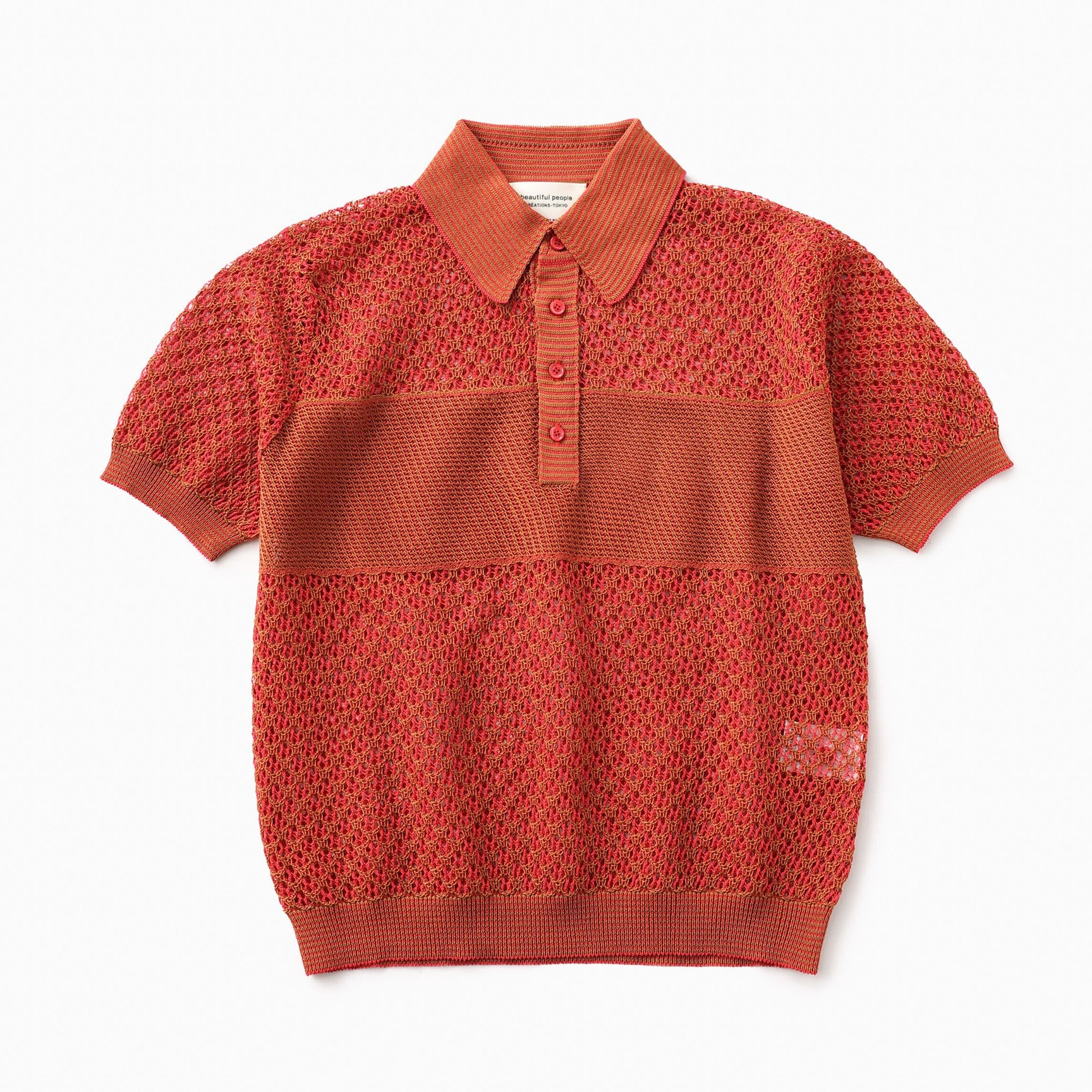 「ビューティフルピープル(beautiful people)」からは、鮮やかな朱色のニットポロシャツをピックアップ。赤と金の2種類の糸を組み合わせ、透かし柄を編み立てたコンパクトなシルエットは、フェニミン過ぎずに男性でも使いやすいアイテムになっています。フラワー柄のリラックスパンツとミニショルダーバッグと組み合わせてアクセントの効いたリゾートスタイルはいかがでしょうか?ワードローブに左右されにくいブラックの展開もあるのでチェックしてみてください。