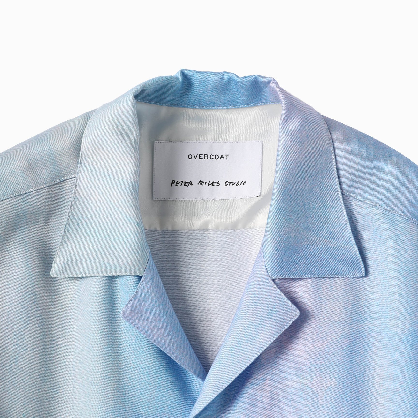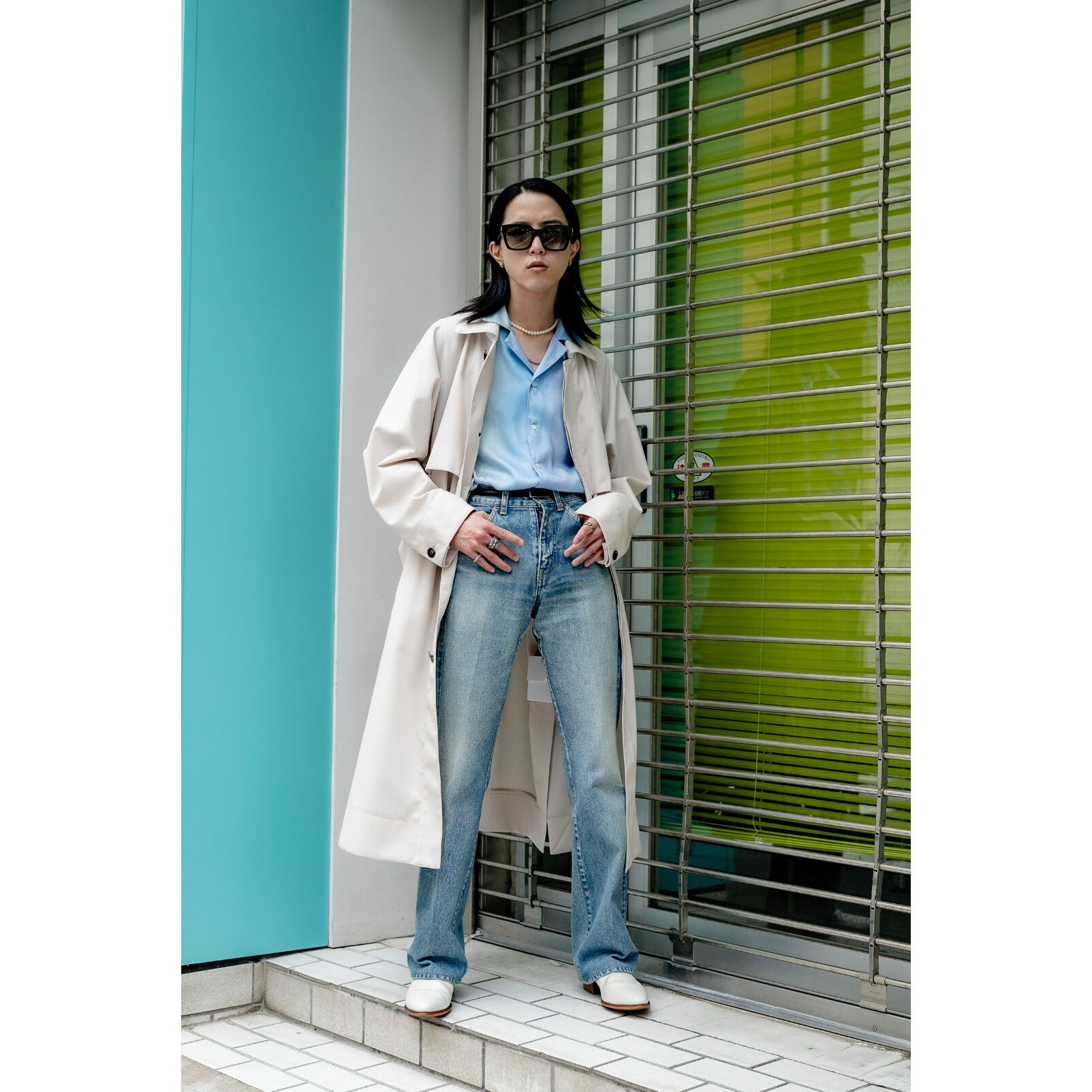爽やかなストライプ柄のオープンカラーシャツは「オーバーコート(OVERCOAT)」のもの。オリジナルデザインのストライプ柄は、何本もの細いストライプで構成されており、遠くから見ると太いストライプの様に見えるという目の錯覚を利用した面白いデザイン。ブルー系の色味は、モノトーンカラーのボトムスと合わせると綺麗にまとまるので手持ちのワードローブとスタイリングしやすく、柄物に抵抗のある方にもおすすめしたい1着です。