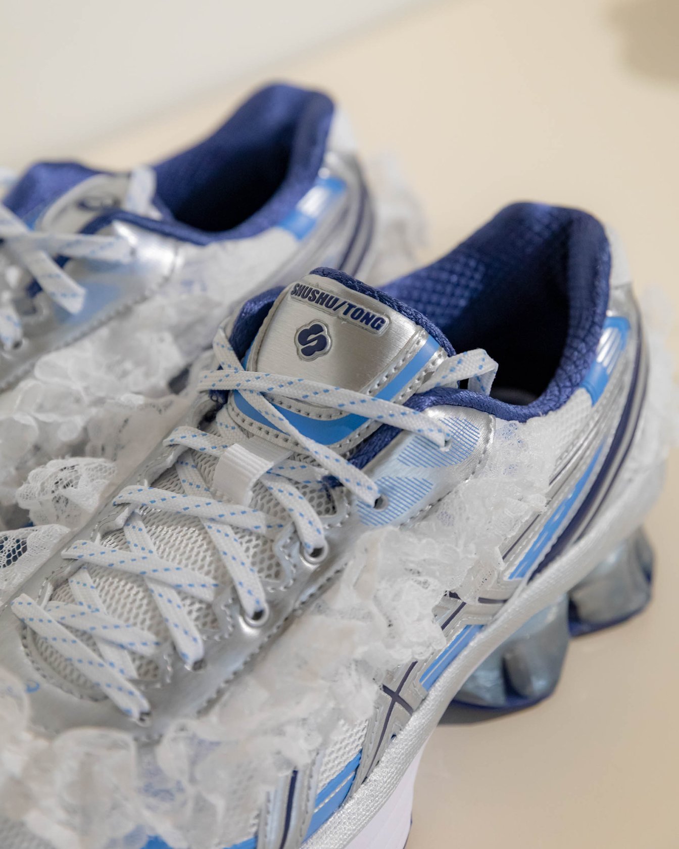デザイン表現そのもの、つまり「機能構造と感情の融合」です。柔らかく肌触りの良いクラシカルなレースを使用し、テクニカルなスニーカーのシルエットに落とし込むことで、異なる要素が組み合わさることで生まれる“強さ”のバランスを追求しました。