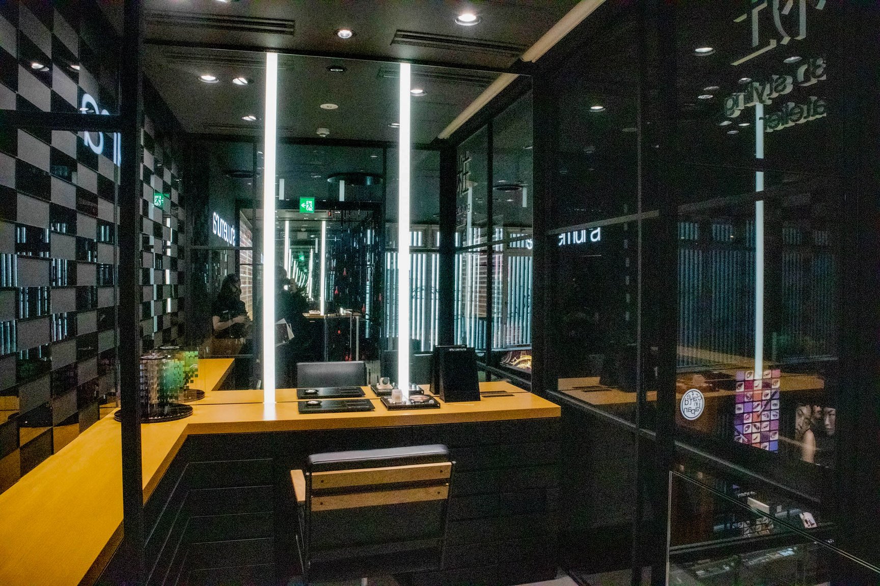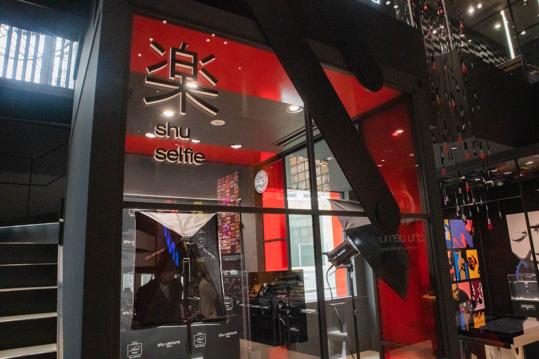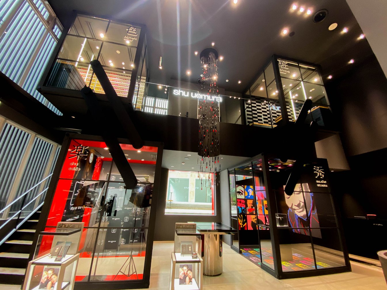 新店舗の出店先は、藤原ヒロシがプロデュースしたことで話題を集めた「スターバックス コーヒー(STARBUCKS COFFEE)」表参道B-SIDE店跡。外観はブランドのアイコンであるメイクボックスを再現しており、カラーや細部のパーツデザインを踏襲しています。ネオンレッドで彩られた入り口は、日本文化にインスピレーションを得て、鳥居のようなフレームをデザイン。メイクボックスの中に入っていくような感覚になり、気分が上がります。