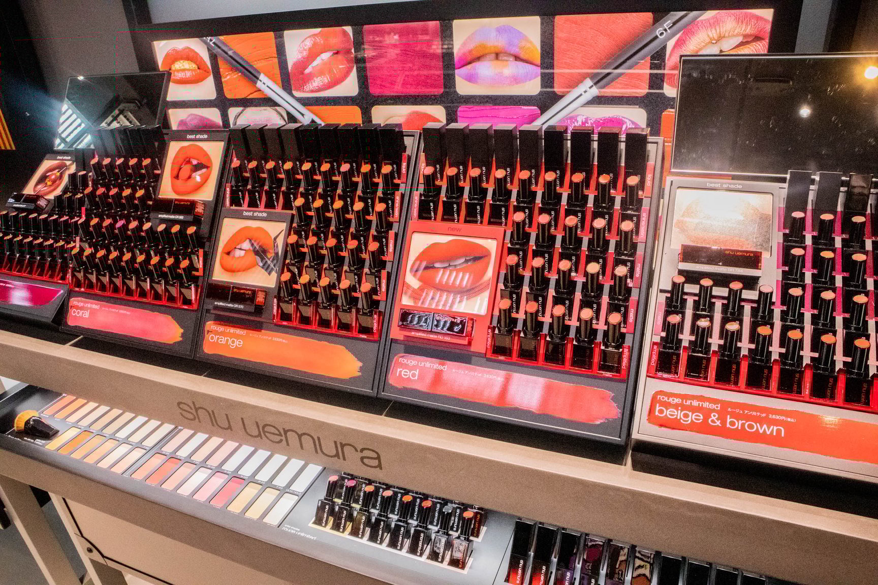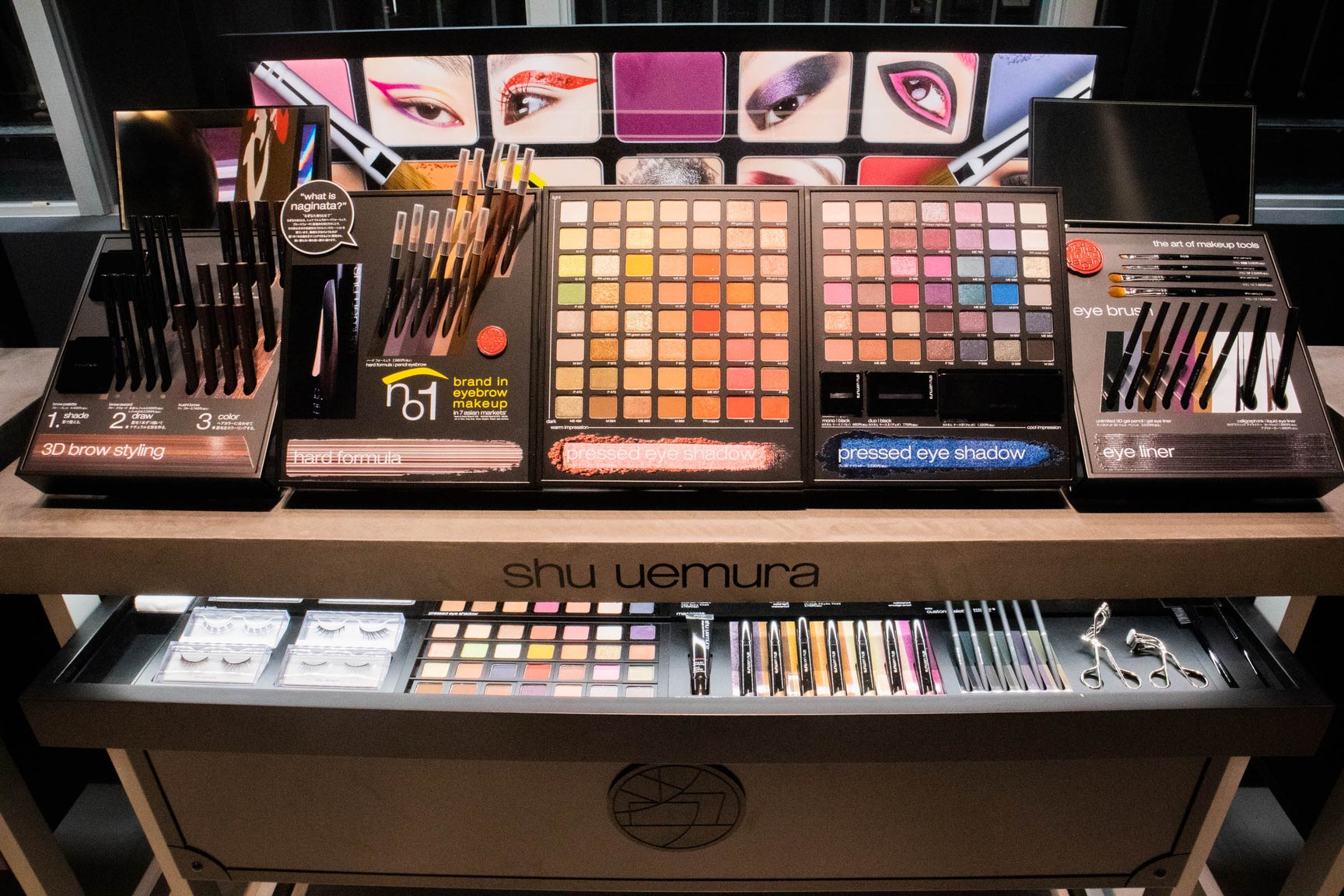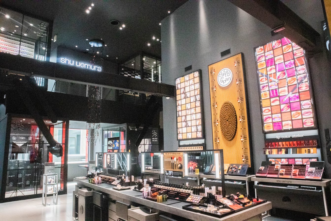 旗艦店はブランド史上最大級の広さで、元々の建物の2階部分を取り壊し、天井を高くすることで開放的な空間を設計。100色展開のアイシャドウ「プレスド アイシャドー」や、プロ仕様のアイブロウペンシル「ハード フォーミュラ」、リキッドファンデーション「アンリミテッド ラスティング フルイド」などブランドを代表する商品のフルラインナップが揃い、広々とした店内でゆっくりと商品を選ぶことができます。