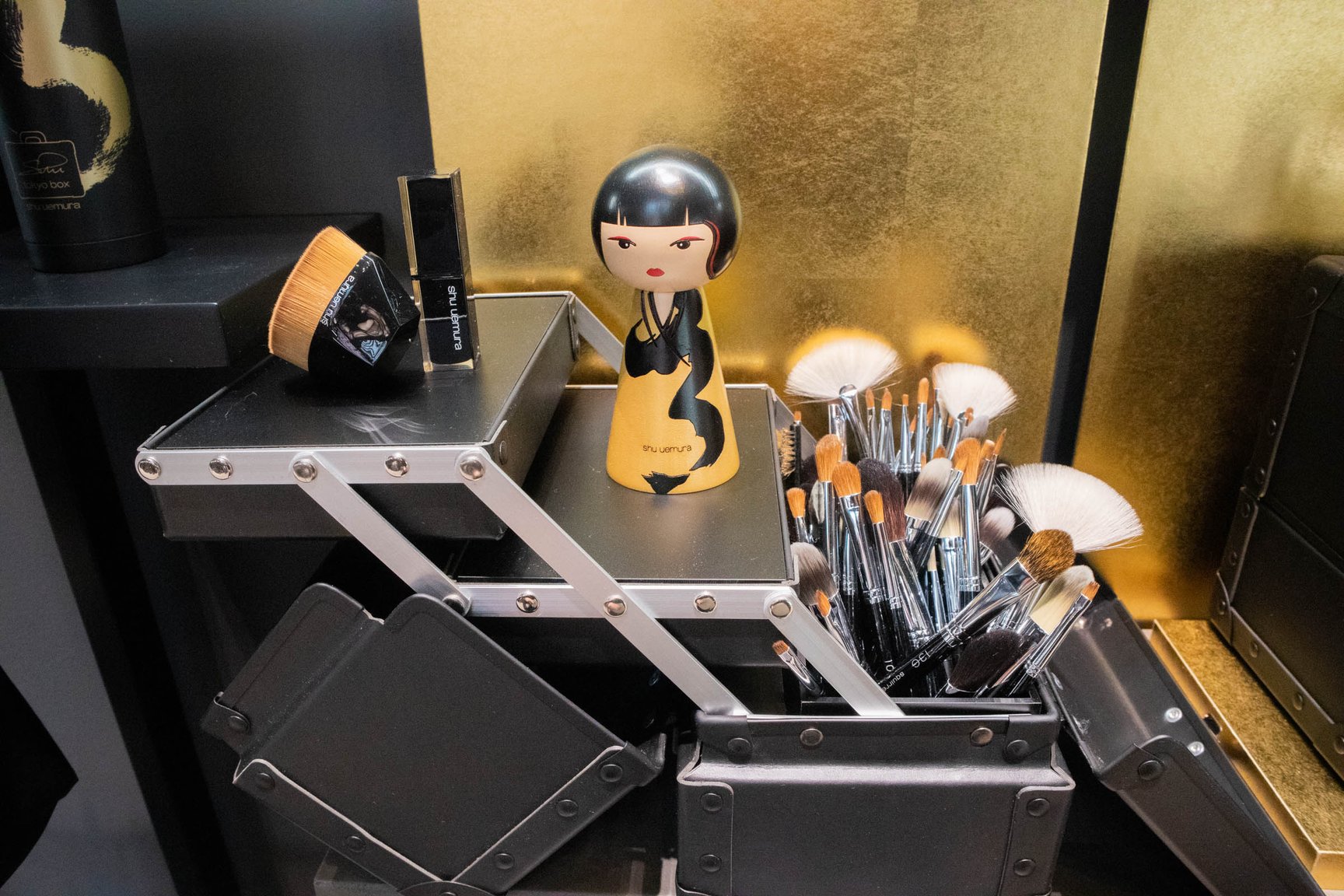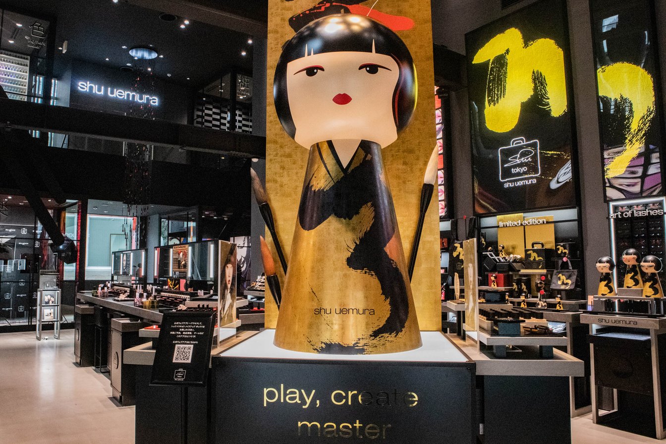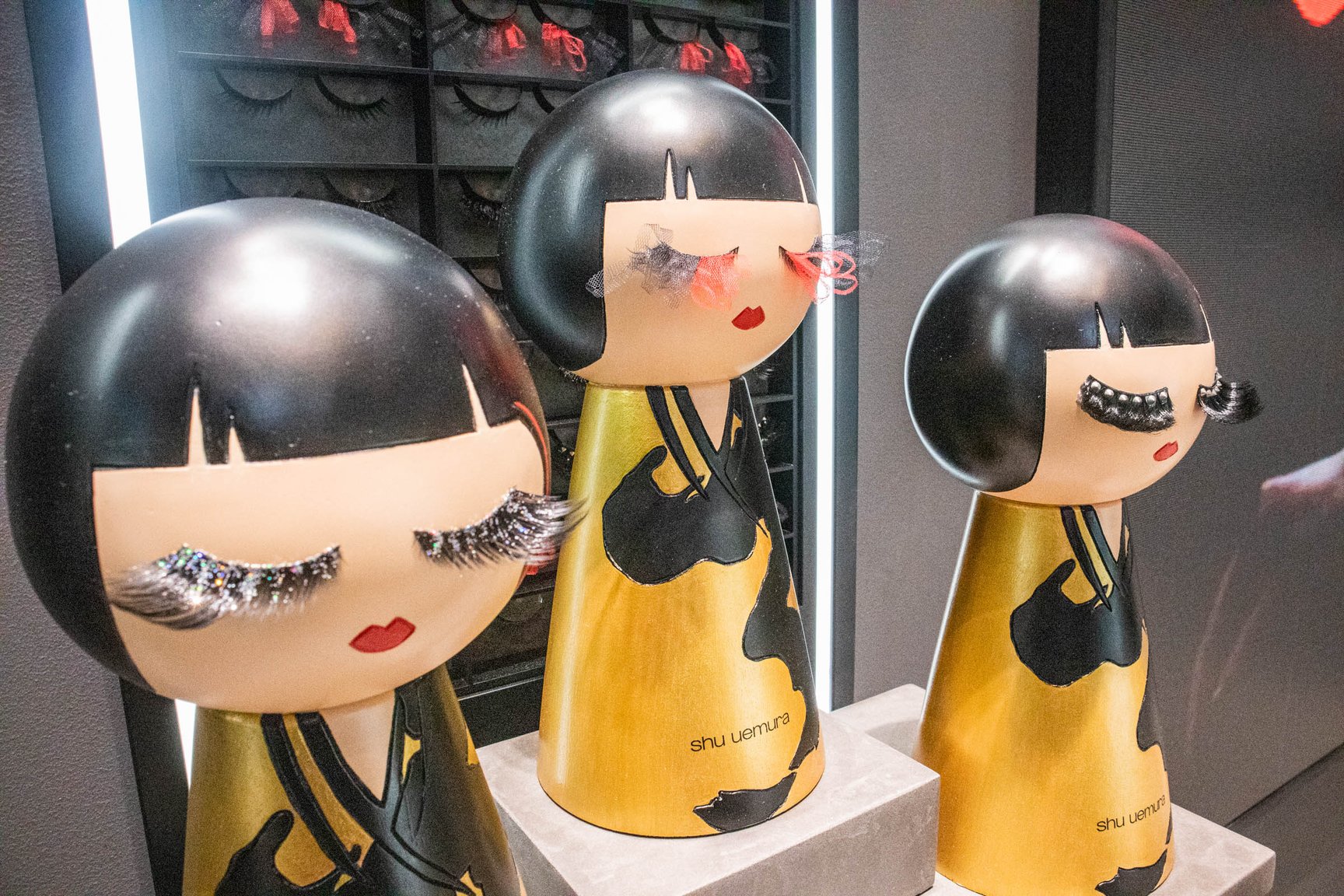 店内では「shu shu コケシ」がお出迎え。「メーキャップアーティストがいて初めて創造的なメイクが生まれる」というブランドの考えを、職人技による成形や絵付けで表現したそう。グラフィックは書道家の万美さんとコラボレーションし、シュウ ウエムラのキーカラーである黒、 赤、 白の3色で「秀」の文字を描いています。
