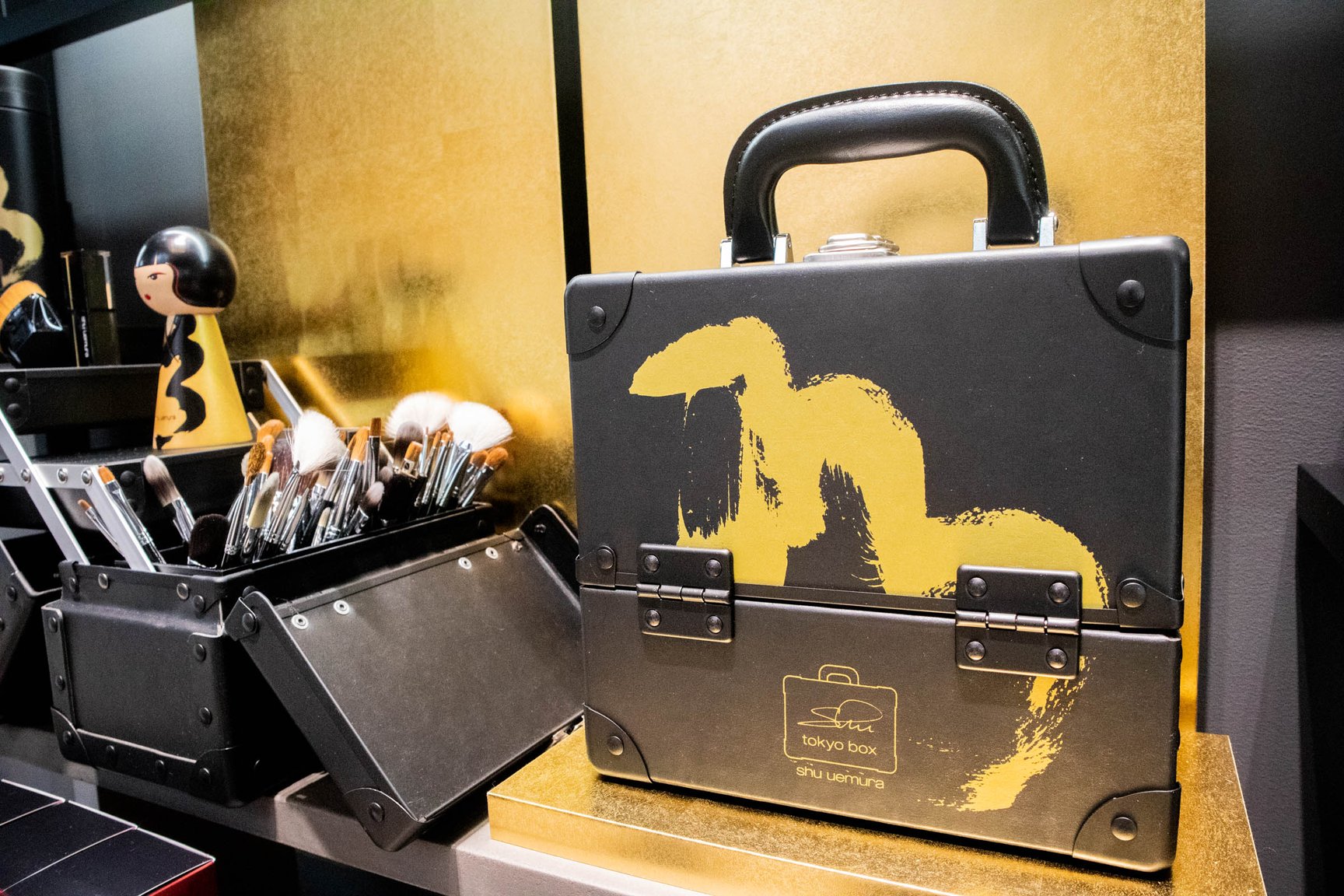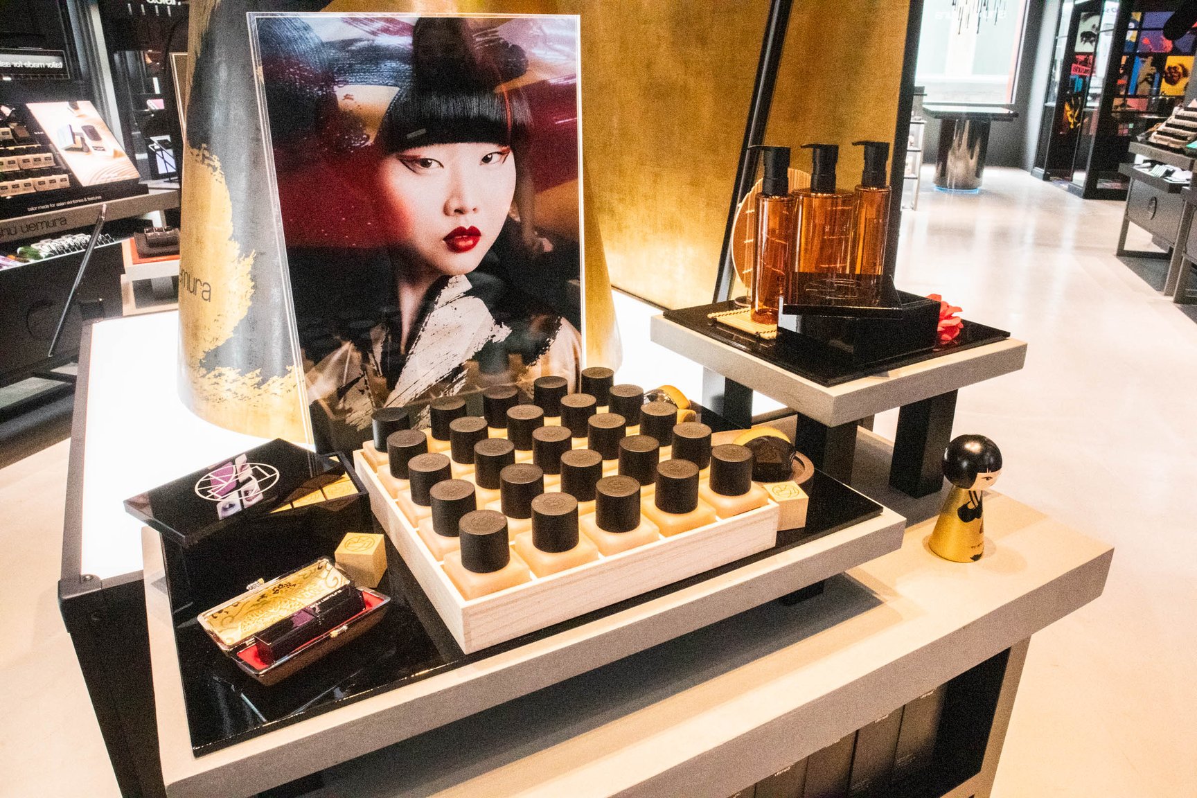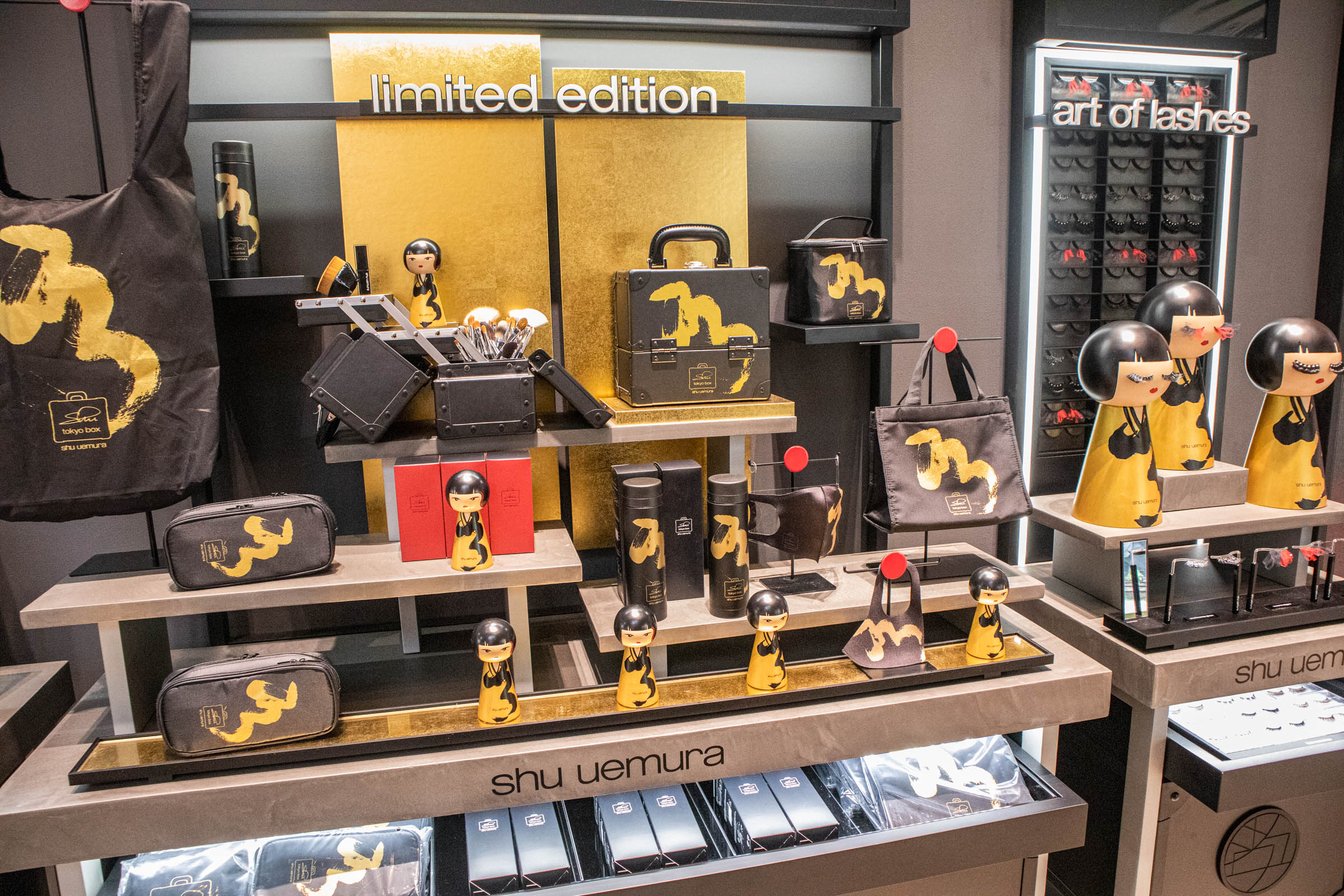 店内では「shu shu コケシ」がお出迎え。「メーキャップアーティストがいて初めて創造的なメイクが生まれる」というブランドの考えを、職人技による成形や絵付けで表現したそう。グラフィックは書道家の万美さんとコラボレーションし、シュウ ウエムラのキーカラーである黒、 赤、 白の3色で「秀」の文字を描いています。