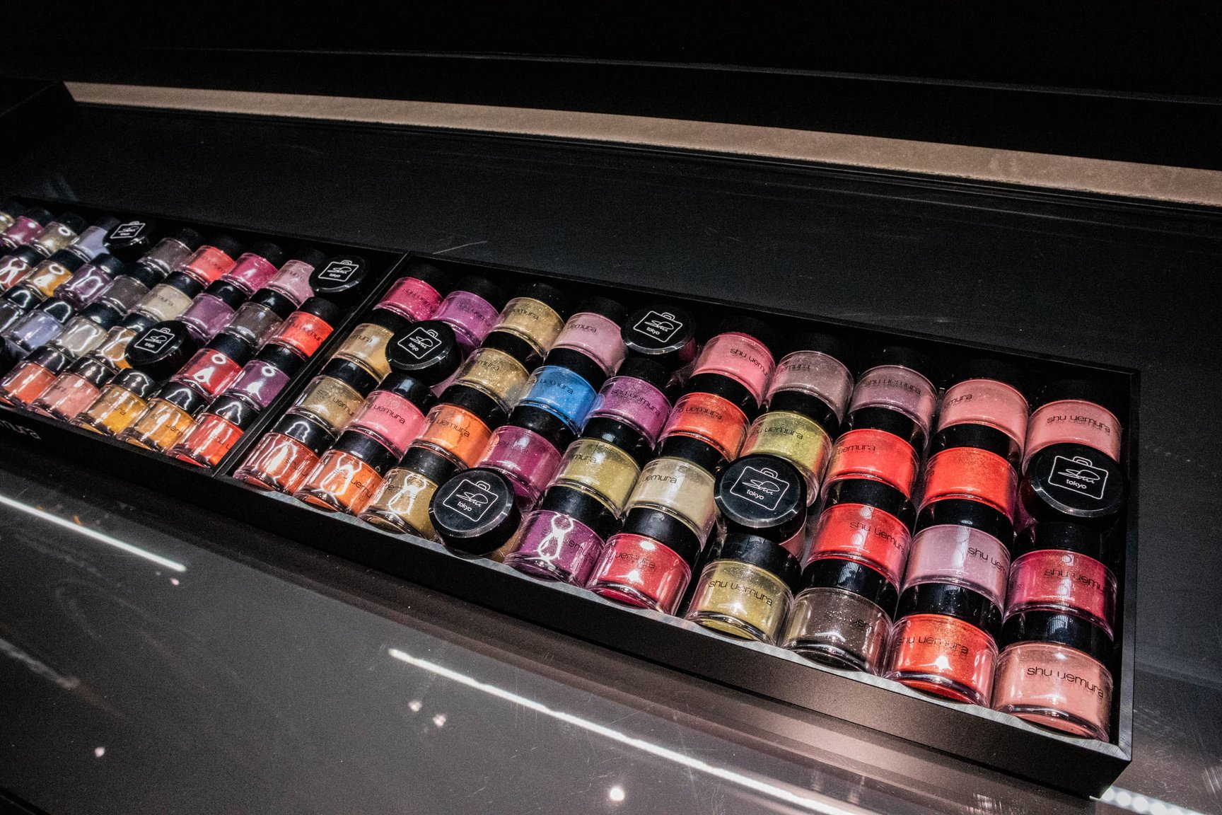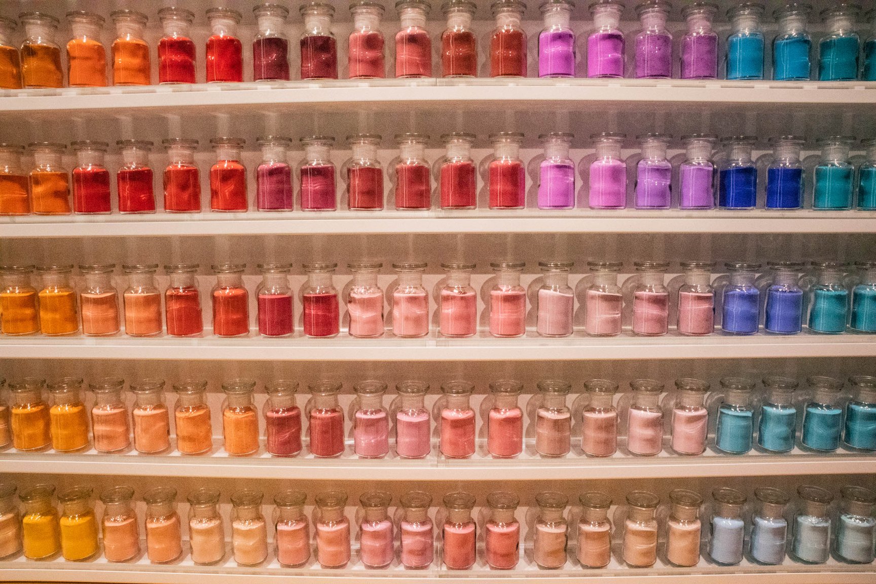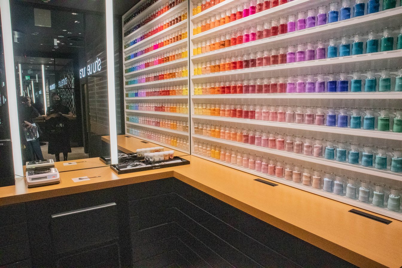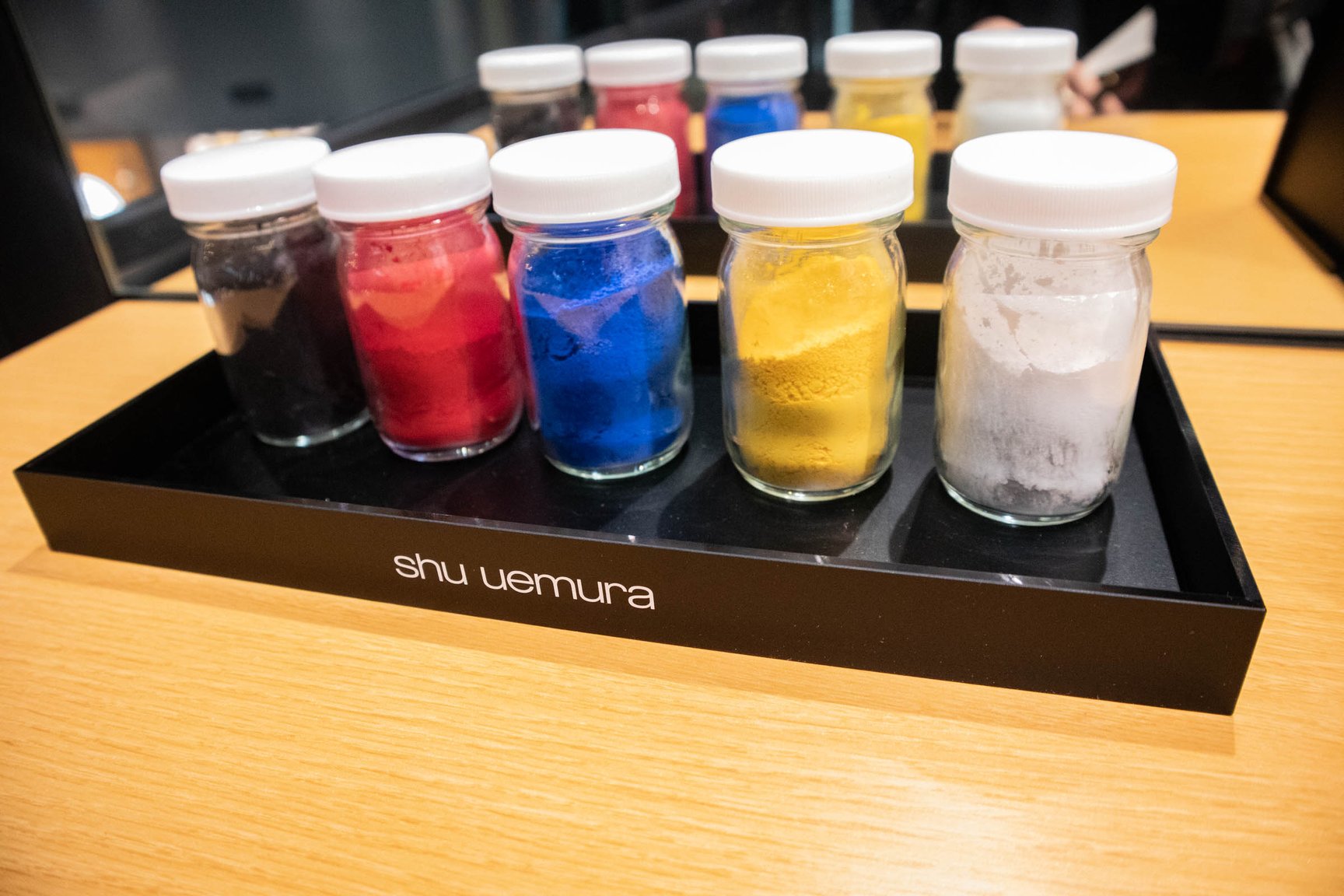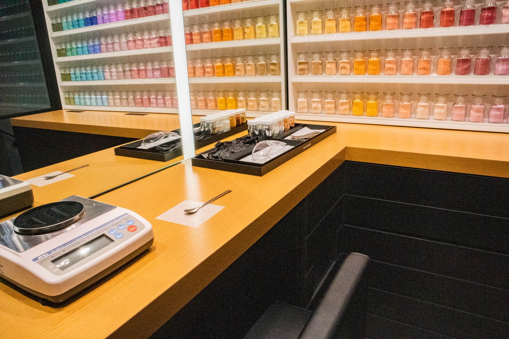 店舗の奥にはメイクボックスを開いたようなデザインの4つの部屋を設置。各部屋でそれぞれ異なる同店限定の体験コンテンツを提供します。1つ目はカラーピグメントのオリジナルカラーを作ることができる「ピグメントアトリエルーム」。色からラメ、パールまで豊富なバリエーションを揃え、組み合わせのパターンはなんと数千通りもあるそう。カラーピグメントはケースに詰めてその日に持ち帰ることができ、アイシャドウやチーク、リップカラーとして使えます。