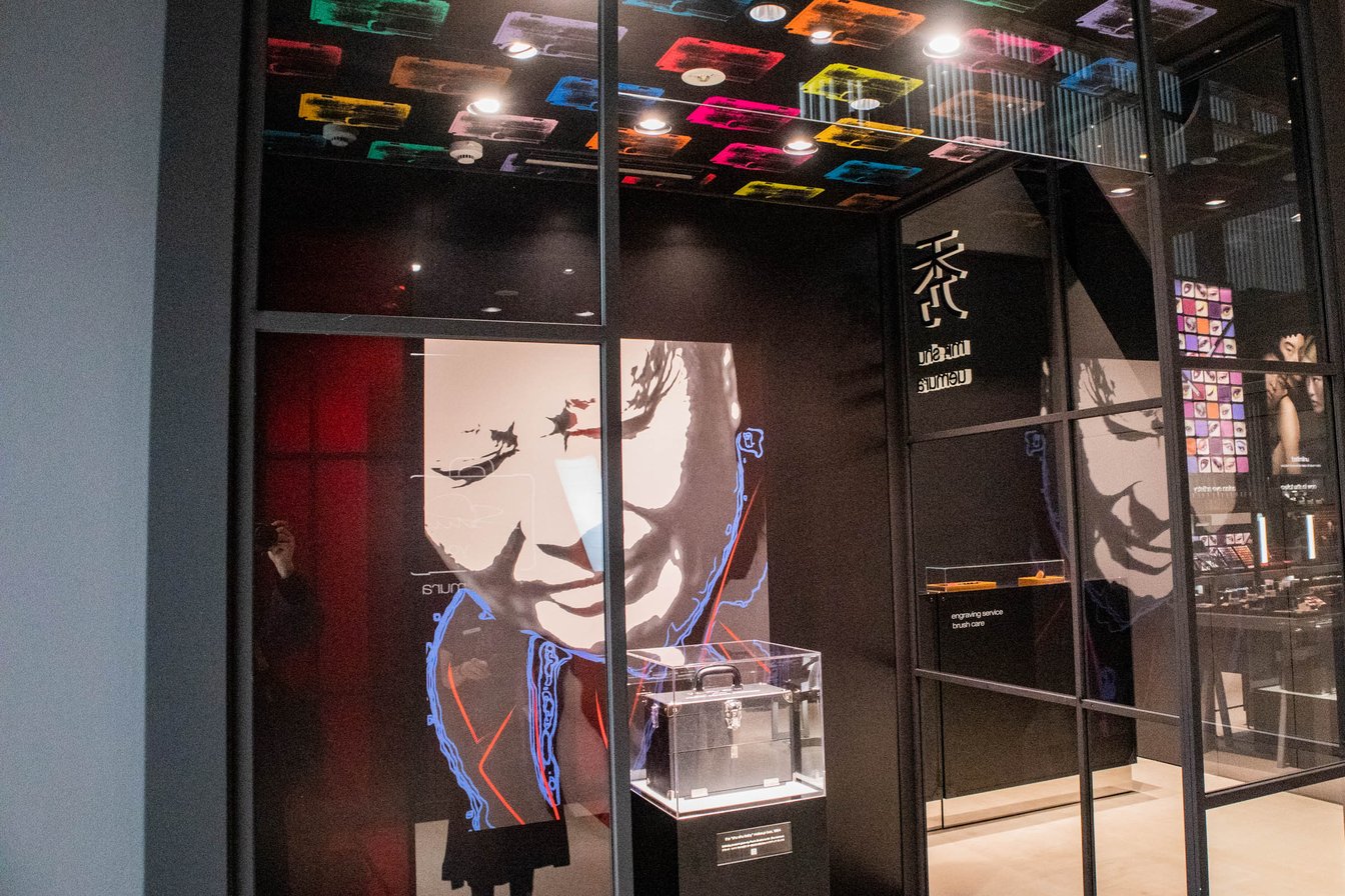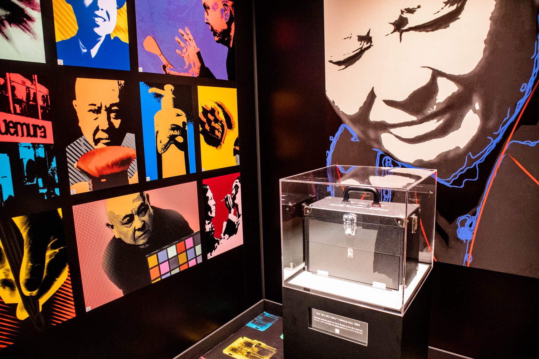 3つ目の体験コンテンツは、1968年にシュウ ウエムラを設立した植村秀の歴史を、11のトピックで知ることができる「『秀』の部屋」。室内では植村本人のポートレート、自身が手掛けたヴィジュアルや初のクレンジングオイルなど、関わりが深いモチーフを描いたパネルを展示。各パネルのQRコードを読み込むと、植村にまつわるエピソードや説明を見ることができます。部屋の中央には、「none but the brave(邦題:勇者のみ)」のメイクを担当した際に、出演者のフランク・シナトラから誕生日にプレゼントされたメイクボックスのレプリカを展示。シナトラから植村に向けた「shu shu baby」のメッセージも再現しています。