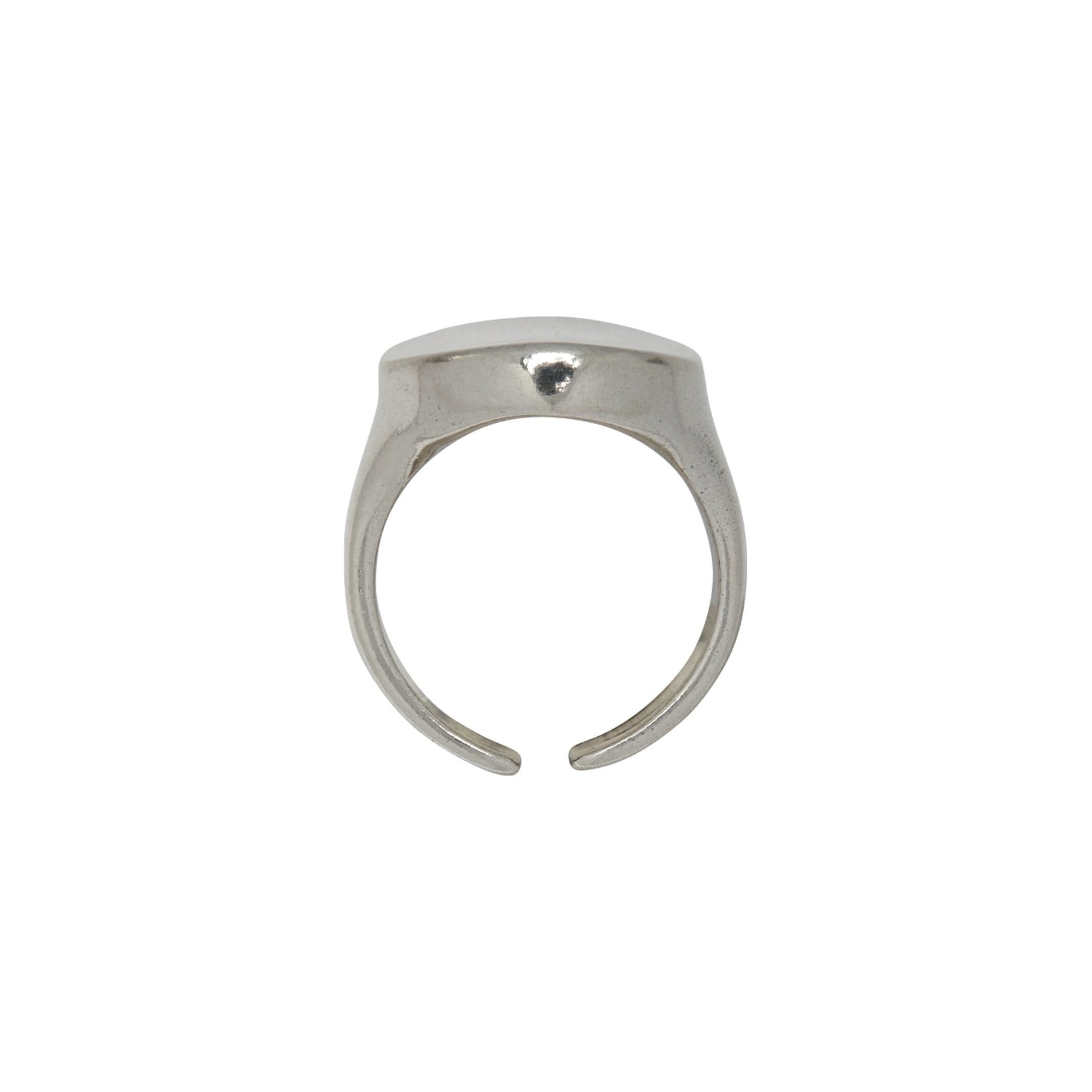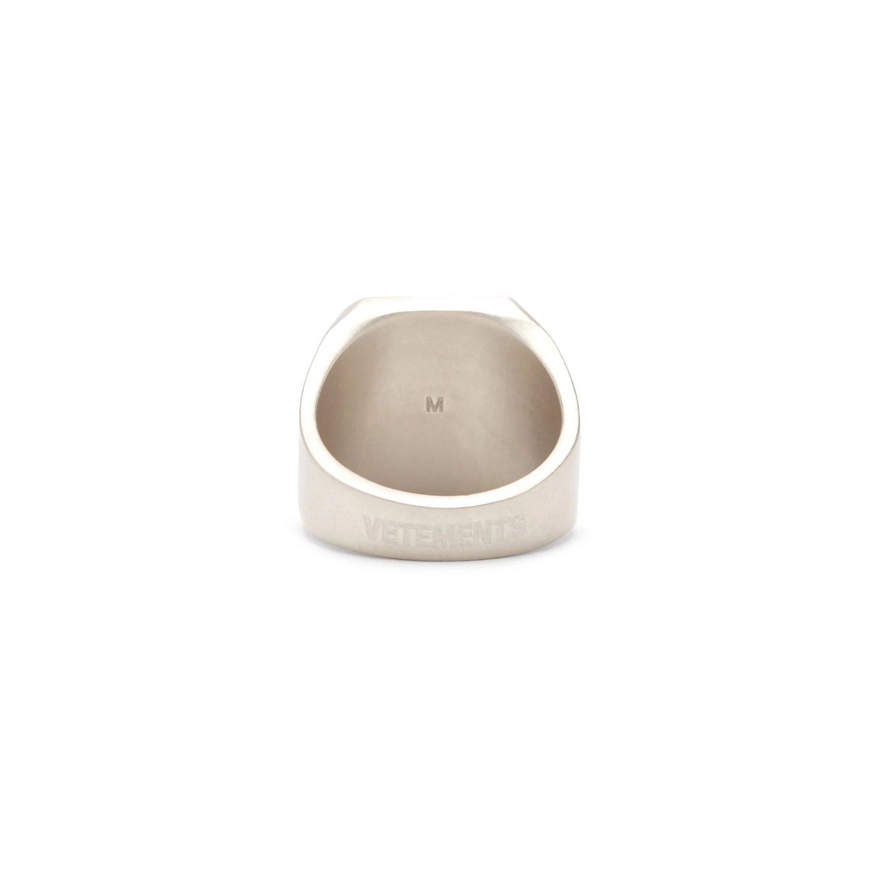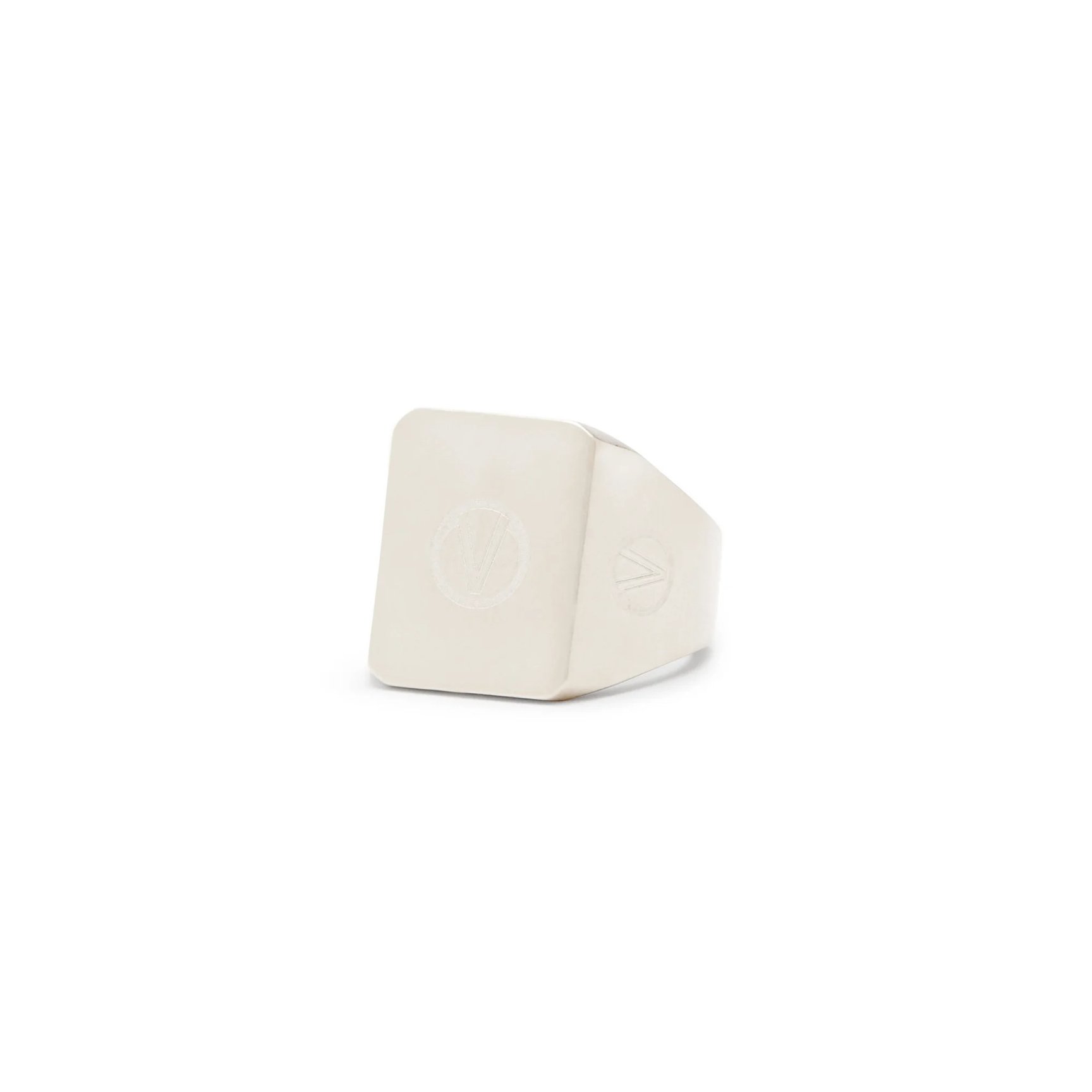 「ヴェトモン(VETEMENTS)」 のシルバーのシグネットリングは、角がとれたスクエアシェイプ。フロントとサイドには、ブランドイニシャルである「V」マークのエングレービングがアクセントになっています。裏側にサイズ記載あり。