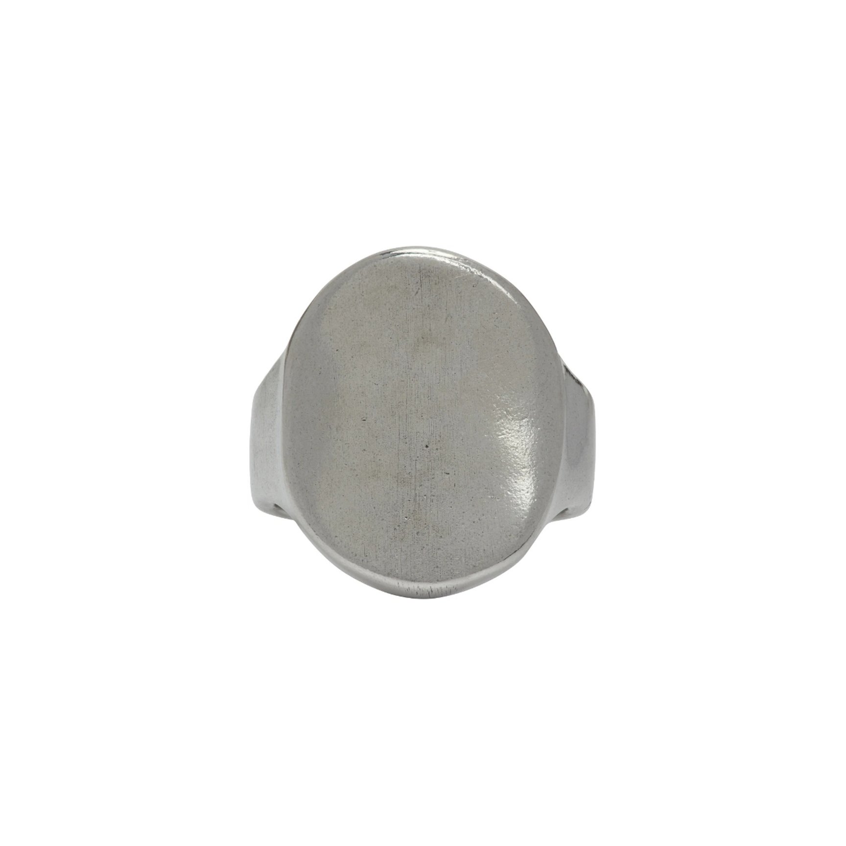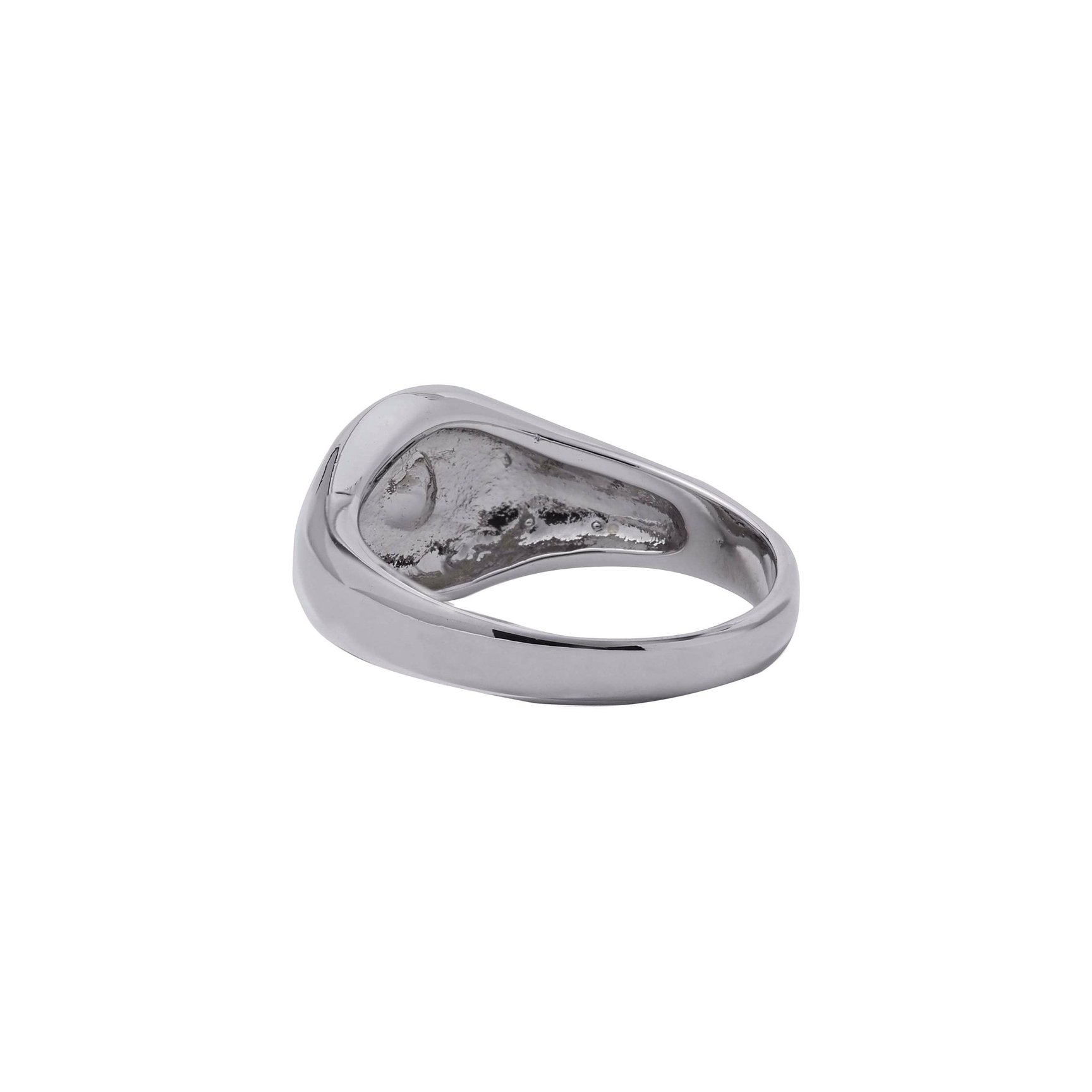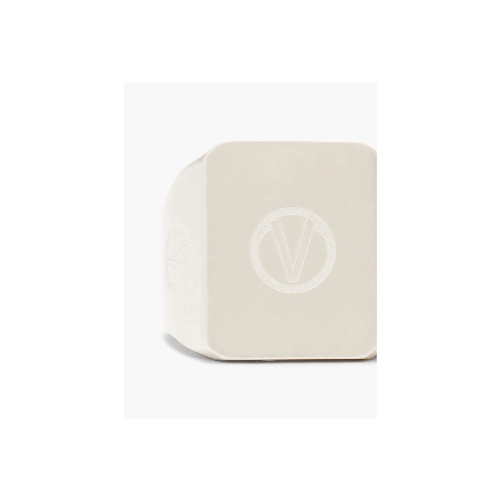 「ヴェトモン(VETEMENTS)」 のシルバーのシグネットリングは、角がとれたスクエアシェイプ。フロントとサイドには、ブランドイニシャルである「V」マークのエングレービングがアクセントになっています。裏側にサイズ記載あり。