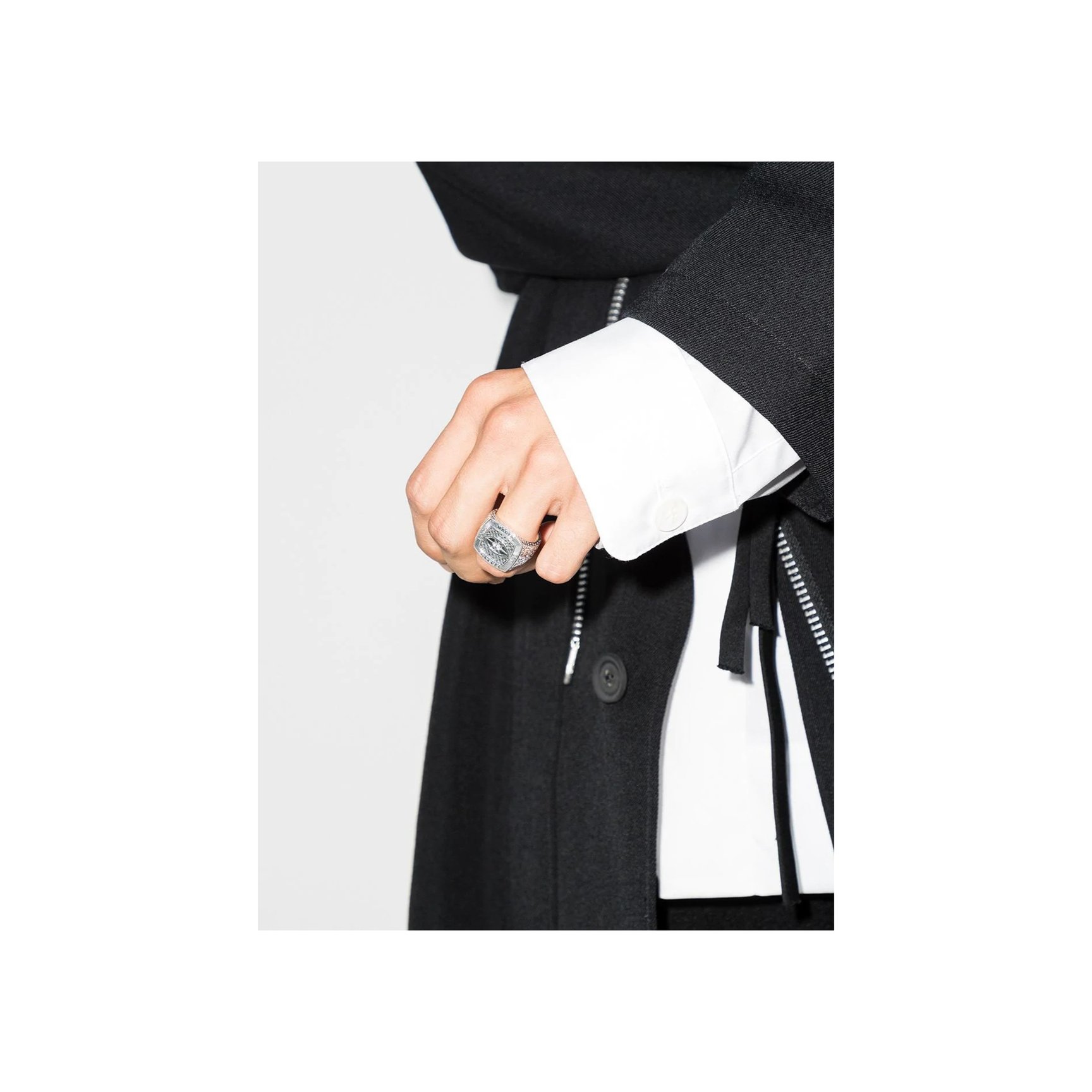 「トムウッド」のこちらのリングは、全面にミステリアスなエングレービングが施されています。抜群の存在感でおしゃれをワンランクアップしてくれること間違いないしのアイテムです。