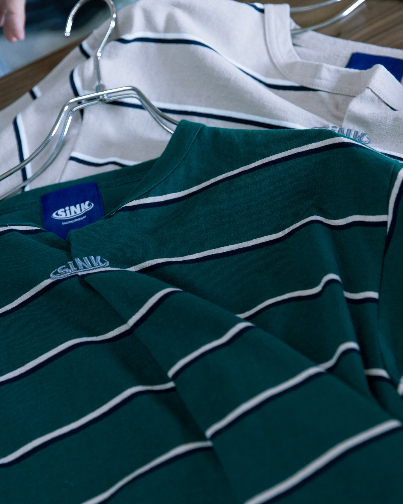 横澤:古着が好きで良く買うんですけど、結局クローゼットに残るものってボロボロのボーダーTなんですよね。それで作ってみようと。3色展開で、洗えば洗うほど味が出るようなデザインにしています。