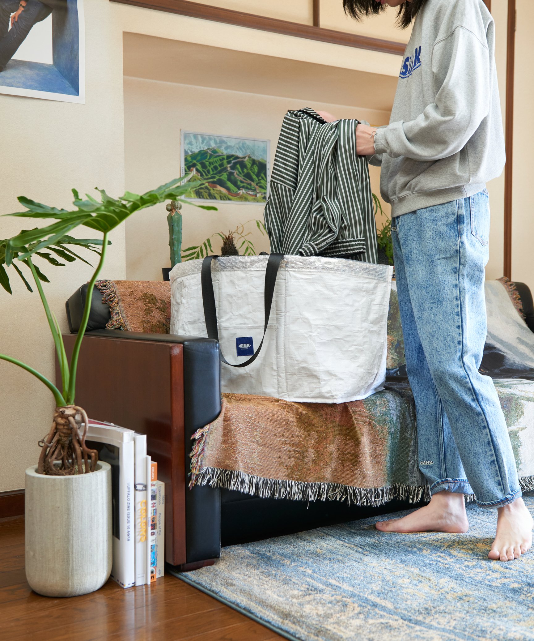 ーこのランドリーバッグとしても使えるエコバッグは、まさに家でも外でもというデザインですね。