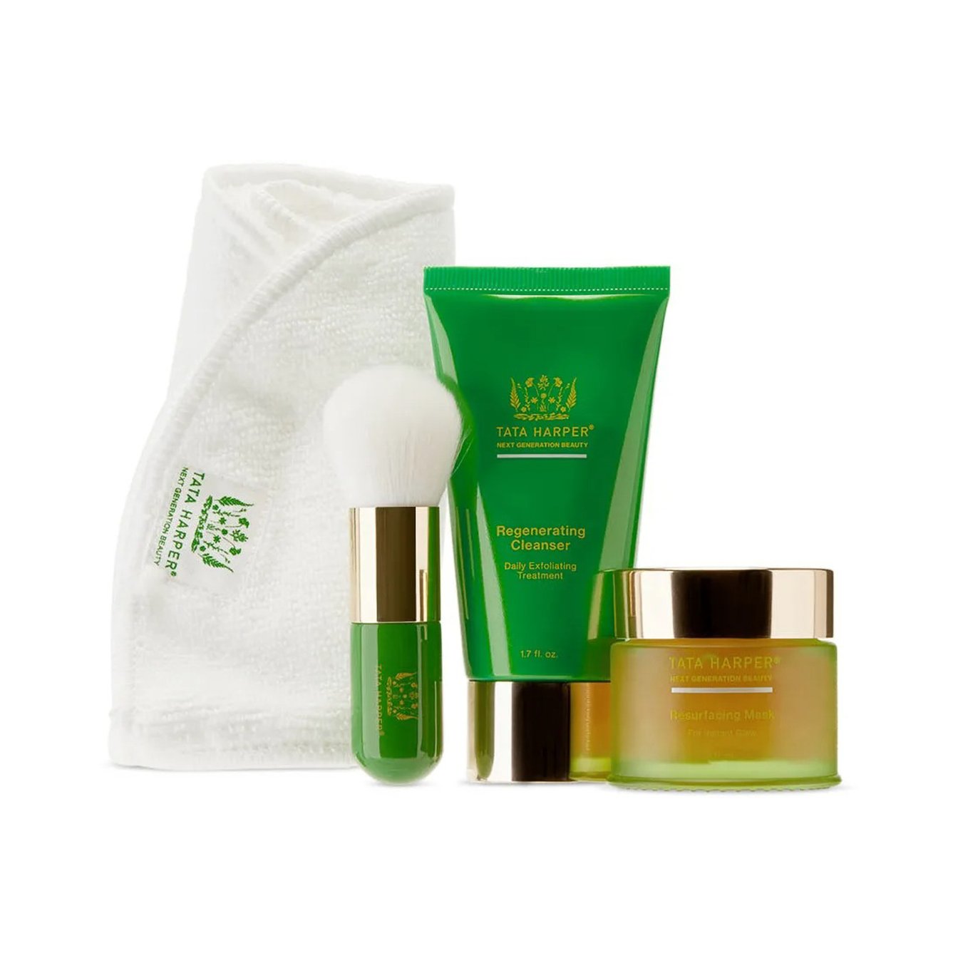 自家農園で育てられた、無農薬の植物由来成分を贅沢に配合した「タタ ハーパー(TATA HARPER)」のプロダクト。フェイス用ブラシとタオルのおまけが嬉しいスキンケアアイテムは、オイリー肌向きのクレンジングとフェイスパックをセット。詰まりなどの毛穴トラブルの改善や、角質のケアにおすすめ。