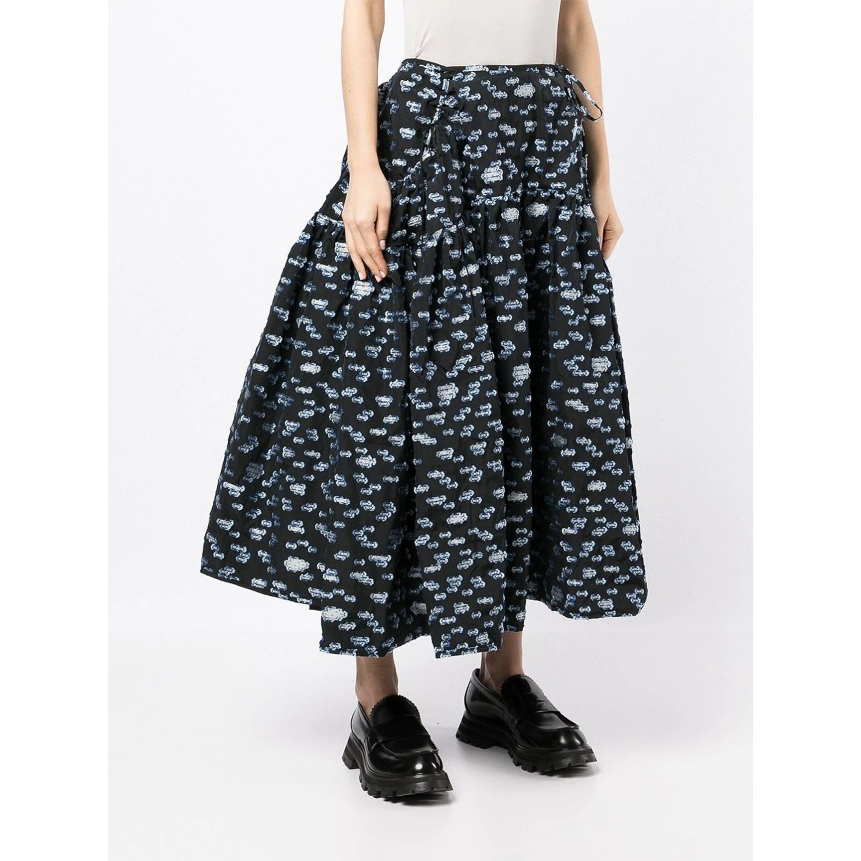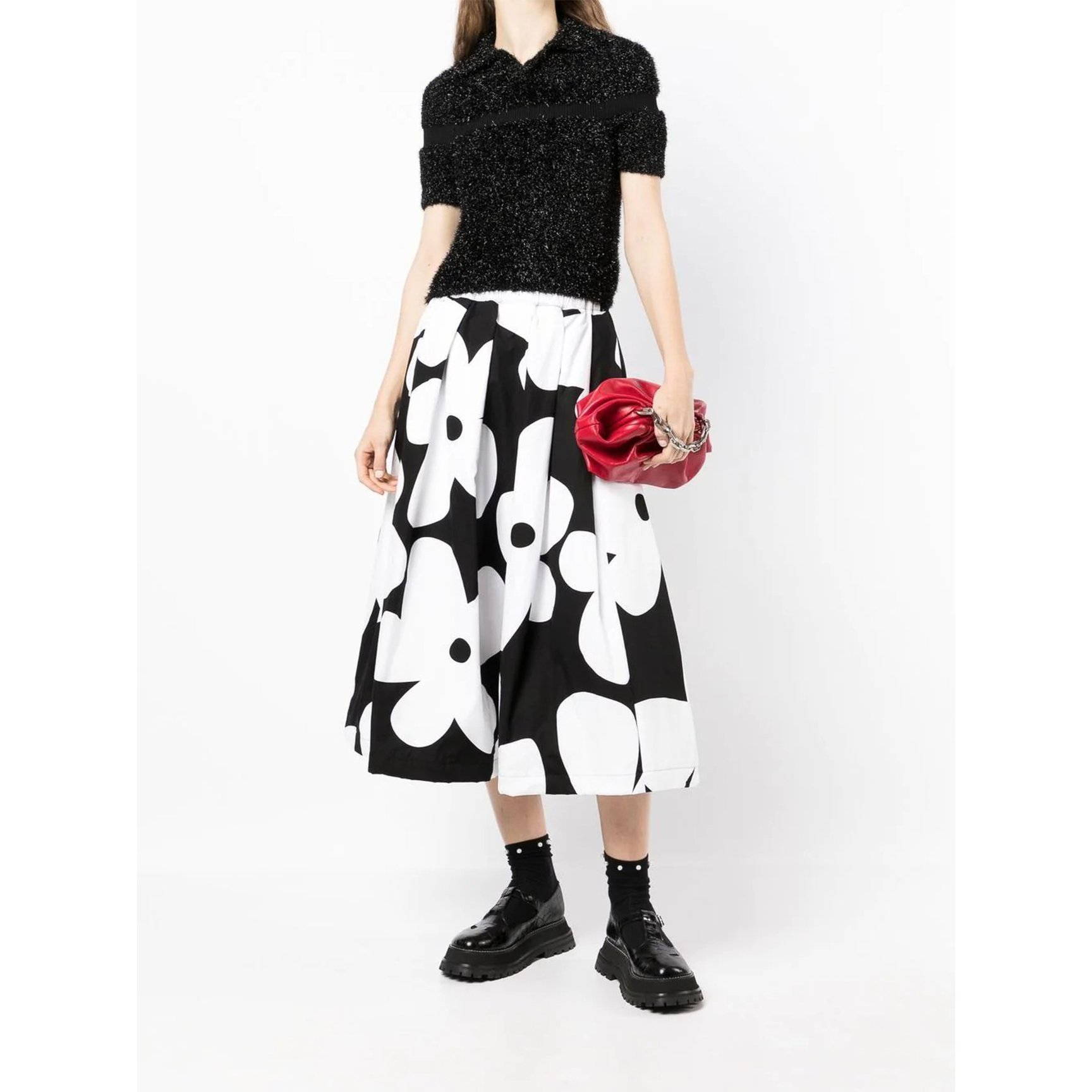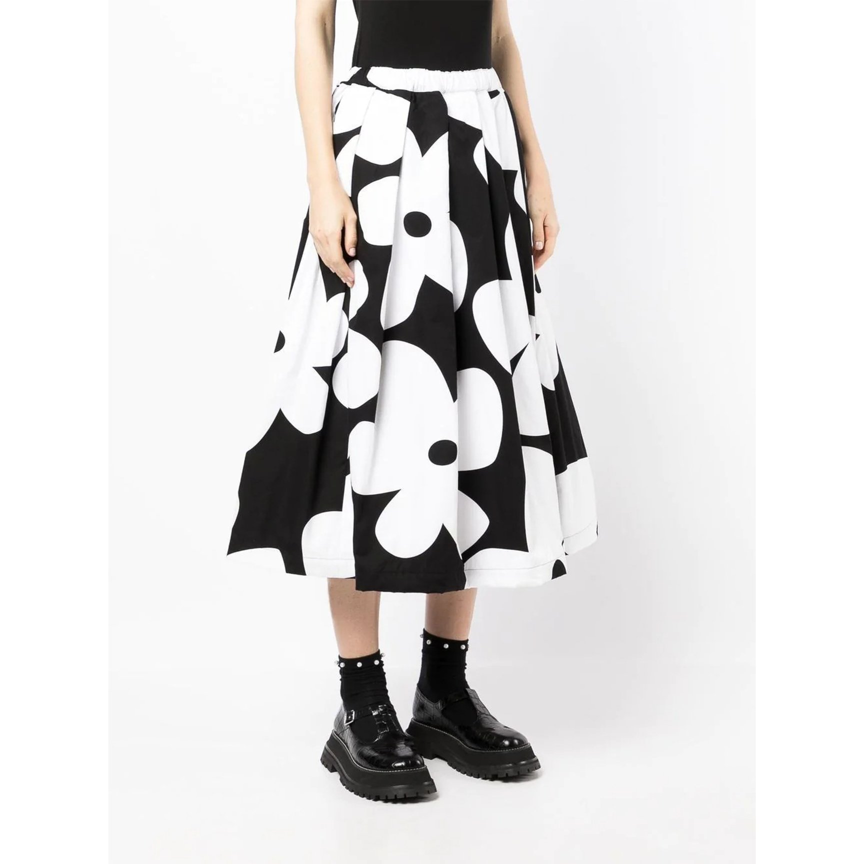 モノトーンのカラーリングと、大胆にプリントされた花柄のコントラストがお洒落な「コム デ ギャルソン(Comme Des Garçons)」のスカート。シックな雰囲気ながら、適度に広がる裾が程よく愛嬌を与えてくれます。