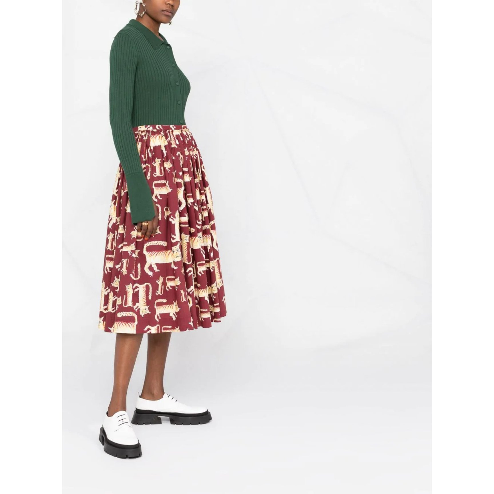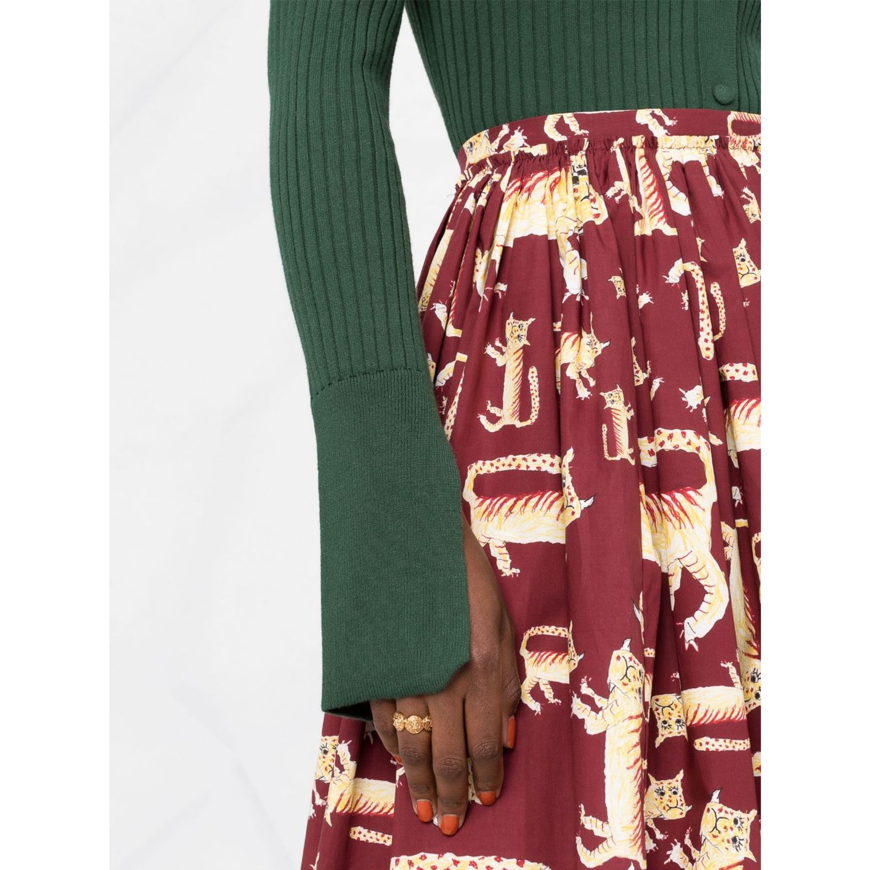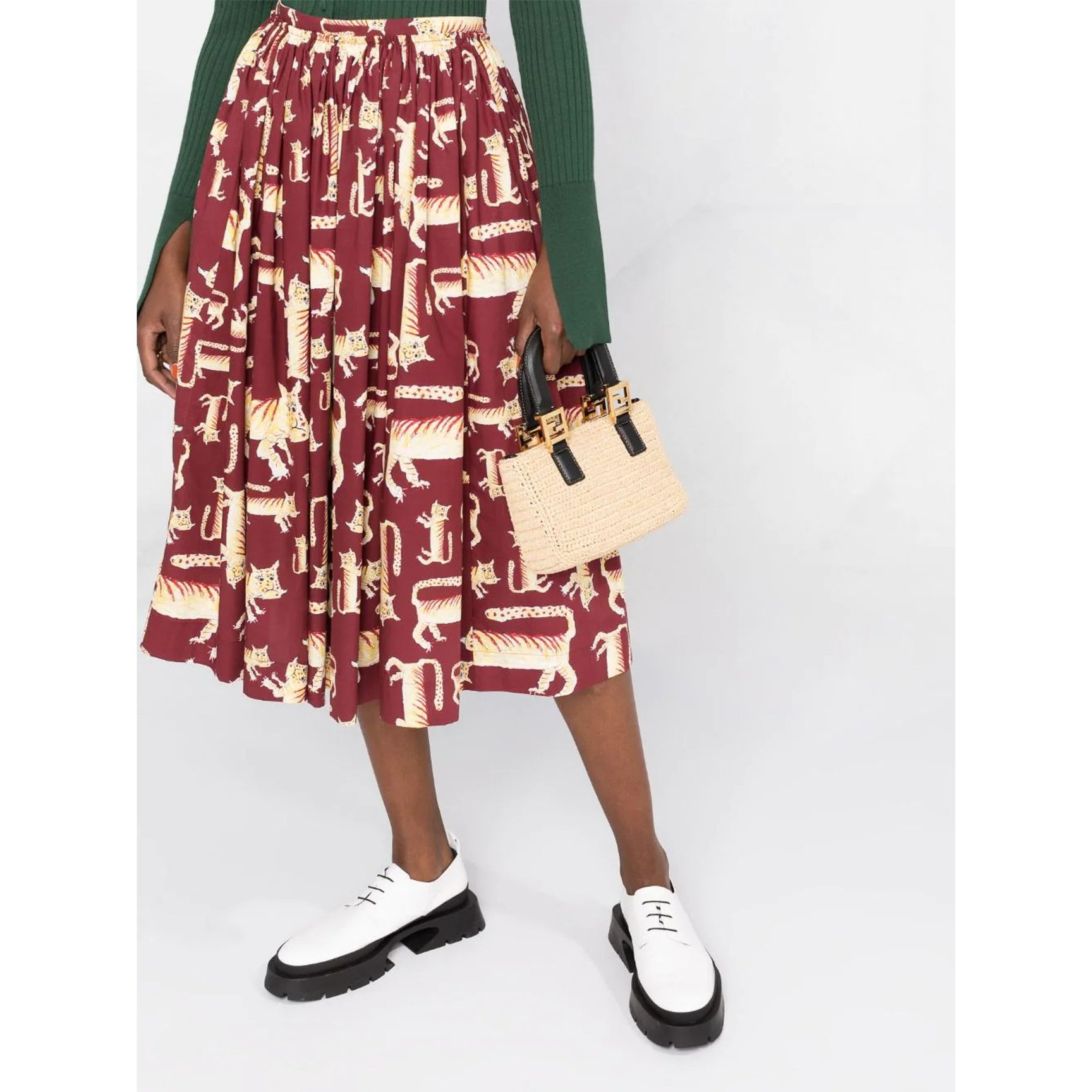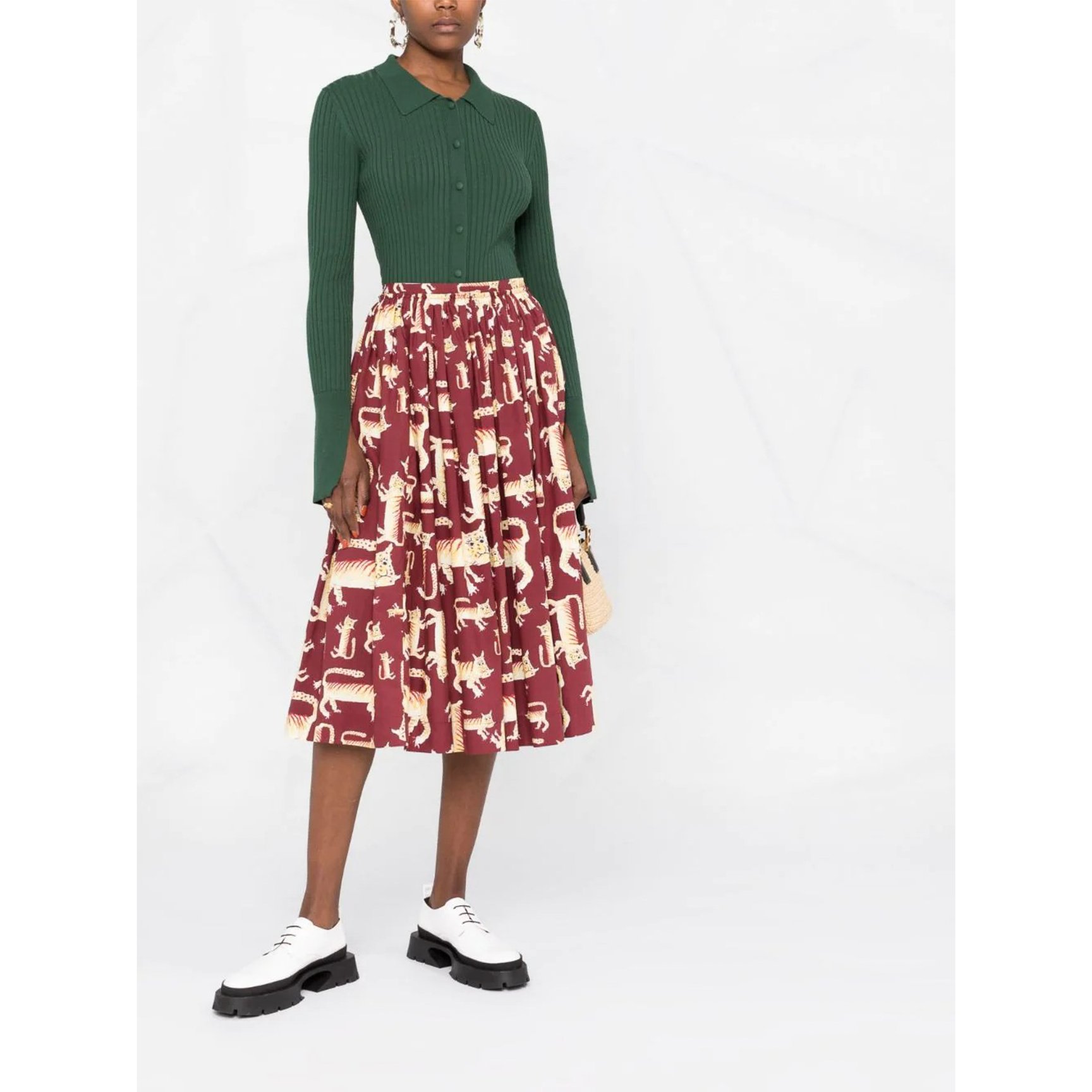 「マルニ(MARNI)」のスカートは、絶妙な表情をしたアニマルプリントがキュート。大小さまざまな大きさなので、一見何の模様か分からずよく見ると認識できるという遊び心たっぷりのデザインです。ウエストがゴムなのでストレスフリーなところも嬉しい。